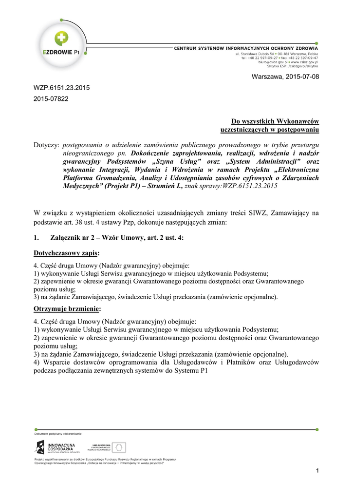 Warszawa, 2015-07-08 WZP.6151.23.2015 2015-07822 Do wszystkich Wykonawców uczestniczących w postępowaniu Dotyczy: postępowania o udzielenie zamówienia publicznego prowadzonego w trybie przetargu nieograniczonego pn. Dokończenie zaprojektowania, realizacji, wdrożenia i nadzór gwarancyjny Podsystemów „Szyna Usług” oraz „System Administracji” oraz wykonanie Integracji, Wydania i Wdrożenia w ramach Projektu „Elektroniczna Platforma Gromadzenia, Analizy i Udostępniania zasobów cyfrowych o Zdarzeniach Medycznych” (Projekt P1) – Strumień I., znak sprawy:WZP.6151.23.2015 W związku z wystąpieniem okoliczności uzasadniających zmiany treści SIWZ, Zamawiający na podstawie art. 38 ust. 4 ustawy Pzp, dokonuje następujących zmian: 1. Załącznik nr 2 – Wzór Umowy, art. 2 ust. 4: Dotychczasowy zapis: 4. Część druga Umowy (Nadzór gwarancyjny) obejmuje: 1) wykonywanie Usługi Serwisu gwarancyjnego w miejscu użytkowania Podsystemu; 2) zapewnienie w okresie gwarancji Gwarantowanego poziomu dostępności oraz Gwarantowanego poziomu usług; 3) na żądanie Zamawiającego, świadczenie Usługi przekazania (zamówienie opcjonalne). Otrzymuje brzmienie: 4. Część druga Umowy (Nadzór gwarancyjny) obejmuje: 1) wykonywanie Usługi Serwisu gwarancyjnego w miejscu użytkowania Podsystemu; 2) zapewnienie w okresie gwarancji Gwarantowanego poziomu dostępności oraz Gwarantowanego poziomu usług; 3) na żądanie Zamawiającego, świadczenie Usługi przekazania (zamówienie opcjonalne). 4) Wsparcie dostawców oprogramowania dla Usługodawców i Płatników oraz Usługodawców podczas podłączania zewnętrznych systemów do Systemu P1 1 2. Załącznik nr 4 do OPZ - wymaganie nr wzp.380 Dotychczasowy zapis: WZP.380 Wykonawca Strumienia I-ego zobowiązany jest do zapewnienia wsparcia podczas procesu ewaluacji przedstawicielom dostawców oprogramowania dla Usługodawców i Płatników. Usługa wsparcia procesu ewaluacji realizowana będzie do ostatniego dnia Umowy. Otrzymuje brzmienie: WZP.380 Wykonawca Strumienia I-ego zobowiązany jest do zapewnienia wsparcia podczas procesu ewaluacji przedstawicielom dostawców oprogramowania dla Usługodawców i Płatników oraz usługodawców. Usługa wsparcia procesu ewaluacji realizowana będzie w zakresie dostawców oprogramowania dla Usługodawców i Płatników do zakończenia Terminu wykonania Przedmiotu Umowy, a w zakresie dostawców oprogramowania dla Usługodawców i Płatników oraz usługodawców do zakończenia świadczenia nadzoru gwarancyjnego. 3. Rozdział IV podrozdział III, pkt 6 SIWZ Dotychczasowy zapis: 6. Ofertę należy złożyć w dwóch zamkniętych kopertach (jedna wewnątrz drugiej). a) Kopertę zewnętrzną należy oznaczyć w następujący sposób: Centrum Systemów Informacyjnych Ochrony Zdrowia ul. Stanisława Dubois 5A, 00-184 Warszawa Oferta na: Dokończenie zaprojektowania, realizacji, wdrożenia i nadzór gwarancyjny Podsystemów „Szyna Usług” oraz „System Administracji” oraz wykonanie Integracji, Wydania i Wdrożenia w ramach Projektu „Elektroniczna Platforma Gromadzenia, Analizy i Udostępniania zasobów cyfrowych o Zdarzeniach Medycznych” (Projekt P1) – Strumień I. Oferta – znak sprawy: WZP.6151.23.2015 30 Nie otwierać przed dniem 09-07-2015 r. godz. 10 . b) Koperta wewnętrzna musi być oznakowana w następujący sposób: Centrum Systemów Informacyjnych Ochrony Zdrowia Oferta na: Dokończenie zaprojektowania, realizacji, wdrożenia i nadzór gwarancyjny Podsystemów „Szyna Usług” oraz „System Administracji” oraz wykonanie Integracji, Wydania i Wdrożenia w ramach Projektu „Elektroniczna Platforma Gromadzenia, Analizy i Udostępniania zasobów cyfrowych o Zdarzeniach Medycznych” (Projekt P1) – Strumień I. znak sprawy: WZP.6151.23.2015 Koperta wewnętrzna powinna być ponadto zaadresowana na adres Wykonawcy, aby można ją było odesłać bez otwierania w przypadku stwierdzenia jej złożenia po terminie składania ofert. 30 Na kopercie należy dopisać – Nie otwierać przed dniem 09-07-2015 r. godz. 10 . 2 Otrzymuje brzmienie: 6. Ofertę należy złożyć w dwóch zamkniętych kopertach (jedna wewnątrz drugiej). a) Kopertę zewnętrzną należy oznaczyć w następujący sposób: Centrum Systemów Informacyjnych Ochrony Zdrowia ul. Stanisława Dubois 5A, 00-184 Warszawa Oferta na: Dokończenie zaprojektowania, realizacji, wdrożenia i nadzór gwarancyjny Podsystemów „Szyna Usług” oraz „System Administracji” oraz wykonanie Integracji, Wydania i Wdrożenia w ramach Projektu „Elektroniczna Platforma Gromadzenia, Analizy i Udostępniania zasobów cyfrowych o Zdarzeniach Medycznych” (Projekt P1) – Strumień I. Oferta – znak sprawy: WZP.6151.23.2015 30 Nie otwierać przed dniem 24-07-2015 r. godz. 10 . b) Koperta wewnętrzna musi być oznakowana w następujący sposób: Centrum Systemów Informacyjnych Ochrony Zdrowia Oferta na: Dokończenie zaprojektowania, realizacji, wdrożenia i nadzór gwarancyjny Podsystemów „Szyna Usług” oraz „System Administracji” oraz wykonanie Integracji, Wydania i Wdrożenia w ramach Projektu „Elektroniczna Platforma Gromadzenia, Analizy i Udostępniania zasobów cyfrowych o Zdarzeniach Medycznych” (Projekt P1) – Strumień I. znak sprawy: WZP.6151.23.2015 Koperta wewnętrzna powinna być ponadto zaadresowana na adres Wykonawcy, aby można ją było odesłać bez otwierania w przypadku stwierdzenia jej złożenia po terminie składania ofert. 30 Na kopercie należy dopisać – Nie otwierać przed dniem 24-07-2015 r. godz. 10 . 4. Rozdział VI podrozdział I SIWZ I. MIEJSCE I TERMIN SKŁADANIA OFERT Dotychczasowy zapis: Ofertę należy złożyć w siedzibie Zamawiającego w Warszawie, ul. Stanisława Dubois 5A, piętro 1, pokój nr 127, do dnia 09-07-2015 r. do godziny 10:00 (…). Otrzymuje brzmienie: Ofertę należy złożyć w siedzibie Zamawiającego w Warszawie, ul. Stanisława Dubois 5A, piętro 1, pokój