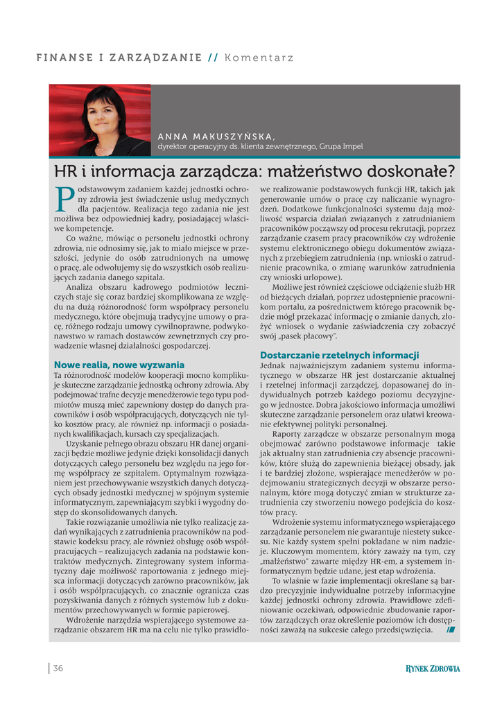 FINANSE I ZARZĄDZANIE // Komentarz ANNA MAKUSZYŃSKA, dyrektor operacyjny ds. klienta zewnętrznego, Grupa Impel HR i informacja zarządcza: małżeństwo doskonałe? P odstawowym zadaniem każdej jednostki ochrony zdrowia jest świadczenie usług medycznych dla pacjentów. Realizacja tego zadania nie jest możliwa bez odpowiedniej kadry, posiadającej właściwe kompetencje. Co ważne, mówiąc o personelu jednostki ochrony zdrowia, nie odnosimy się, jak to miało miejsce w przeszłości, jedynie do osób zatrudnionych na umowę o pracę, ale odwołujemy się do wszystkich osób realizujących zadania danego szpitala. Analiza obszaru kadrowego podmiotów leczniczych staje się coraz bardziej skomplikowana ze względu na dużą różnorodność form współpracy personelu medycznego, które obejmują tradycyjne umowy o pracę, różnego rodzaju umowy cywilnoprawne, podwykonawstwo w ramach dostawców zewnętrznych czy prowadzenie własnej działalności gospodarczej. we realizowanie podstawowych funkcji HR, takich jak generowanie umów o pracę czy naliczanie wynagrodzeń. Dodatkowe funkcjonalności systemu dają możliwość wsparcia działań związanych z zatrudnianiem pracowników począwszy od procesu rekrutacji, poprzez zarządzanie czasem pracy pracowników czy wdrożenie systemu elektronicznego obiegu dokumentów związanych z przebiegiem zatrudnienia (np. wnioski o zatrudnienie pracownika, o zmianę warunków zatrudnienia czy wnioski urlopowe). Możliwe jest również częściowe odciążenie służb HR od bieżących działań, poprzez udostępnienie pracownikom portalu, za pośrednictwem którego pracownik będzie mógł przekazać informację o zmianie danych, złożyć wniosek o wydanie zaświadczenia czy zobaczyć swój „pasek płacowy”. Dostarczanie rzetelnych informacji Nowe realia, nowe wyzwania Ta różnorodność modelów kooperacji mocno komplikuje skuteczne zarządzanie jednostką ochrony zdrowia. Aby podejmować trafne decyzje menedżerowie tego typu podmiotów muszą mieć zapewniony dostęp do danych pracowników i osób współpracujących, dotyczących nie tylko kosztów pracy, ale również np. informacji o posiadanych kwalifikacjach, kursach czy specjalizacjach. Uzyskanie pełnego obrazu obszaru HR danej organizacji będzie możliwe jedynie dzięki konsolidacji danych dotyczących całego personelu bez względu na jego formę współpracy ze szpitalem. Optymalnym rozwiązaniem jest przechowywanie wszystkich danych dotyczących obsady jednostki medycznej w spójnym systemie informatycznym, zapewniającym szybki i wygodny dostęp do skonsolidowanych danych. Takie rozwiązanie umożliwia nie tylko realizację zadań wynikających z zatrudnienia pracowników na podstawie kodeksu pracy, ale również obsługę osób współpracujących – realizujących zadania na podstawie kontraktów medycznych. Zintegrowany system informatyczny daje możliwość raportowania z jednego miejsca informacji dotyczących zarówno pracowników, jak i osób współpracujących, co znacznie ogranicza czas pozyskiwania danych z różnych systemów lub z dokumentów przechowywanych w formie papierowej. Wdrożenie narzędzia wspierającego systemowe zarządzanie obszarem HR ma na celu nie tylko prawidło- 36 Jednak najważniejszym zadaniem systemu informatycznego w obszarze HR jest dostarczanie aktualnej i rzetelnej informacji zarządczej, dopasowanej do indywidualnych potrzeb każdego poziomu decyzyjnego w jednostce. Dobra jakościowo informacja umożliwi skuteczne zarządzanie personelem oraz ułatwi kreowanie efektywnej polityki personalnej. Raporty zarządcze w obszarze personalnym mogą obejmować zarówno podstawowe informacje takie jak aktualny stan zatrudnienia czy absencje pracowników, które służą do zapewnienia bieżącej obsady, jak i te bardziej złożone, wspierające menedżerów w podejmowaniu strategicznych decyzji w obszarze personalnym, które mogą dotyczyć zmian w strukturze zatrudnienia czy stworzeniu nowego podejścia do kosztów pracy. Wdrożenie systemu informatycznego wspierającego zarządzanie personelem nie gwarantuje niestety sukcesu. Nie każdy system spełni pokładane w nim nadzieje. Kluczowym momentem, który zaważy na tym, czy „małżeństwo” zawarte między HR-em, a systemem informatycznym będzie udane, jest etap wdrożenia. To właśnie w fazie implementacji określane są bardzo precyzyjnie indywidualne potrzeby informacyjne każdej jednostki ochrony zdrowia. Prawidłowe zdefiniowanie oczekiwań, odpowiednie zbudowanie raportów zarządczych oraz określenie poziomów ich dostępności zaważą na sukcesie całego przedsięwzięcia.