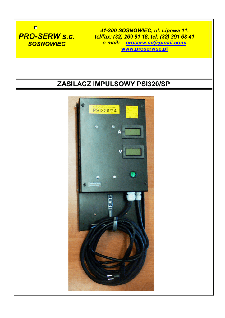 PRO-SERW s.c. SOSNOWIEC 41-200 SOSNOWIEC, ul. Lipowa 11, tel/fax: (32) 269 81 18, tel: (32) 291 68 41 e-mail: [email protected] www.proserwsc.pl ZASILACZ IMPULSOWY PSI320/SP ZASILACZ IMPULSOWY PS320/SP W związku z potrzebą doładowania akumulatorów w pojazdach straży pożarnych w czasie garażowania opracowaliśmy do tego celu zasilacze 230VAC/24VDC i 230VAC/12VDC. Zasilacze te montuje się w pobliżu stanowisk dla samochodów pożarniczych (max 5m.). Samochody muszą być wyposażone w specjalne gniazda przyłączeniowe, umożliwiające szybkie odłączenie zasilacza. Doładowywanie akumulatora i zasilanie układów elektroniki pojazdu pozwala na utrzymanie go w ciągłej gotowości. Dane techniczne: Napięcie zasilania: Moc: PSI-320/24/SP PSI-320/12/SP Napięcie wyjściowe: PSI-320/24/SP PSI-320/12/SP Maksymalny prąd obciążenia: PSI-320/24/SP PSI-320/12/SP Zabezpieczenie przeciwzwarciowe na wyjściu: Temperatura pracy: 100÷260VAC/50Hz 250W 150W 27,3VDC 13,6VDC 10 A 10A tak -10÷600C Uruchomienie: • podstawę zasilacza przymocować w pobliżu stanowiska dla samochodu pożarniczego (na ścianie lub filarze garażu). Długość kabla zasilającego ok. 5m. Długość kabla sieciowego ok. 1,5m. • zawiesić zasilacz na podstawie blokując go dwoma wkrętami. • wtyk kabla sieciowego umieścić w gnieździe sieciowym 230VAC/50Hz • rozwinąć kabel przyłączeniowy i umieścić wtyk w gnieździe zamontowanym na samochodzie • jeżeli jest połączenie z akumulatorem w samochodzie, woltomierz umieszczony w zasilaczu wskaże aktualne napięcie akumulatora • włączyć zasilacz wyłącznikiem umieszczonym na płycie czołowej • woltomierz powinien wskazać napięcie ok. 27V (lub 13.6V), a amperomierz wskazuje aktualny pobór prądu z zasilacza PSI320-SP PRO-SERW SOSNOWIEC 2 ZASILACZ IMPULSOWY PS320/SP Usterki: • brak wskazania prądu na amperomierzu przy załączonym zasilaniu oznacza awarię zasilacza • wskazanie na amperomierzu maksymalnego prądu przy jednoczesnym zerowym wskazaniu woltomierza oznacza zwarcie w obwodzie podłączonym do zasilacza lub zwarcie we wtyku wyjściowym ZASADY BEZPIECZNEGO UŻYTKOWANIA: • zasilacz należy podłączyć do gniazda sieciowego 230V/50Hz z uziemieniem • w pracującym zasilaczu nie wolno zasłaniać otworów wentylacyjnych • do zasilacza nie może wlać się woda Na specjalne życzenie zasilacz może być wyposażony w kabel zasilający, z przewodem powietrznym, utrzymującym odpowiednie ciśnienie w zbiorniku wyrównawczym pojazdu. Cena netto zasilacza – 1000 PLN (bez wtyku przyłączeniowego) Przykładowy sposób instalacji zasilacza (w tym przypadku z kablem zasilającym z przewodem powietrznym) PSI320-SP PRO-SERW SOSNOWIEC 3 ZASILACZ IMPULSOWY PS320/SP Uwaga: Ze względu na panujące wewnątrz zasilacza napięcie jednofazowej sieci energetycznej, wszelkie naprawy należy powierzyć uprawnionemu do tego typu napraw serwisowi PSI320-SP PRO-SERW SOSNOWIEC 4