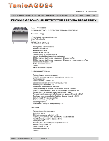 Utworzono : 07 marzec 2017 Sprzęt AGD wolnostojący > Kuchnie > KUCHNIA GAZOWO - ELEKTRYCZNE FREGGIA PP96GEE50X KUCHNIA GAZOWO - ELEKTRYCZNE FREGGIA PP96GEE50X Model : PP96GEE50X KUCHNIA GAZOWO - ELEKTRYCZNE FREGGIA PP96GEE50X Producent : Freggia �Typ:Kuchnia gazowo-elektryczna Linia:Professionale Kolor:inox INFORMACJE OGÓLNE Kolor panelu sterowania:inox Kolor drzwi:lustrzane Kolor szuflady:inox Kolor pokręteł:srebrny Kolor pierścienia pokrętła:czarny Uchwyt drzwi piekarnika:srebrny metaliczny Elektroniczny wyświetlacz z przyciskami dotykowymi:Tak Elektroniczny wyświetlacz z przyciskami dotykowymi i programatorem :Tak Schowek na akcesoria :Tak Nóżki teleskopowe :Tak Cokół:Ekran ochronny pokręteł:PŁYTA DO GOTOWANIA Rodzaj płyty do gotowania:gazowa Materiał, z którego wykonana jest płyta:stal nierdzewna Palniki gazowe:5 Palnik Potrójna Korona :Tak Zabezpieczenie przeciwwypływowe gazu :Tak Automatyczna zapalarka:Tak Elektryczne palniki szybko gotujące:Lewe przednie pole grzejne:Palnik średni Defendi 1,65 kW Lewe tylne pole grzejne:Palnik szybko gotujący Defendi 2,8 kW Prawe tylne pole grzejne:Palnik mały Defendi 1,0 kW Prawe przednie pole grzejne:Palnik szybko gotujący Defendi 2,8 kW Środkowe pole grzejne:Palnik Potrójna Korona Defendi 4,0 kW Żeliwne ruszty Professionale :Tak Żeliwna nakładka palnika:Tak Szklana pokrywa:Nakładka do naczyń o małej średnicy:Tak PIEKARNIK Rodzaj piekarnika:elektryczny Grill:elektryczny Objętość wewnętrzna (netto), l:105 Rozmiary wewnętrzne netto (SzxGłxW), cm:75x42,5x33 Katalityczne czyszczenie :boczne, tylne Wentylator:Tak Automatyczna zapalarka gazu w piekarniku :Tak Profesjonalny rożen :Tak Drabinki boczne :Tak Blacha emaliowana :2 Ruszt:2 kontakt : - [email protected] Strona 1 Utworzono : 07 marzec 2017 Sprzęt AGD wolnostojący > Kuchnie > KUCHNIA GAZOWO - ELEKTRYCZNE FREGGIA PP96GEE50X KUCHNIA GAZOWO - ELEKTRYCZNE FREGGIA PP96GEE50X Oświetlenie wewnętrzne:Tak Zdejmowane drzwiczki :Tak Rekomendacje dotyczące pieczenia na wewnętrznej szybie drzwiczek :Tak Powierzchnia pieczenia, cm2:2729 Średni czas pieczenia średniej ilości pożywienia przy nagrzewaniu statycznym, min:61,6 Średni czas pieczenia średniej ilości pożywienia przy nagrzewaniu z wymuszoną konwekcją, min:81,6 FUNKCJE Ilość funkcji :7 Oświetlenie :Rozmrażanie / Suszenie :Tak Podpiekanie :Pieczenie konwencjonalne :Tak Pieczenie z termoobiegiem (górna i dolna grzałka z wymuszoną konwekcją) :Tak True Fan (tylna grzałka z wymuszoną konwekcją) :Tak Grill :Tak Podwójny grill z termoobiegiem (podwójny grill z wymuszoną konwekcją) :Grill + rożen :Tak Grill + rożen z termoobiegiem (grill + rożen z wymuszoną konwekcją):Tak Pieczenie z termoobiegiem (dolna grzałka z wymuszoną konwekcją) :Dolna grzałka + rożen:Pieczenie z termoobiegiem + rożen (dolna grzałka + rożen + wymuszona konwekcja):DANE DOTYCZĄCE GAZU Rodzaj gazu (domyślnie):G20 Ciśnienie gazu, mbar:20 Ciśnienie gazu (opcja), mbar:28-30 / 37 Dysze zamienne do gazu propan-butan:Tak DANE ELEKTRYCZNE Napięcie, V:220-240 Częstotliwość, Hz:50-60 Klasa elektryczna:I Dolna grzałka, kW:1,65 Górna grzałka, kW:1,15 Grill, W:2,4 Oświetlenie, W:15 Silnik rożna, W:5 Wentylator obwodowego chłodzenia, W:22-26 GABARYTY I WAGA Waga brutto, kg:76,2 Wymiary opakowania (SzxGłxW), cm:68х89х97 Wysokość do powierzchni roboczej, cm:85 Wysokość z podniesioną pokrywą, cm:Głębokość z zamkniętymi drzwiczkami, cm:59 Głębokość z otwartymi drzwiczkami, cm:100 Szerokość, cm:90 kontakt : - [email protected] Strona 2 Utworzono : 07 marzec 2017 Sprzęt AGD wolnostojący > Kuchnie > KUCHNIA GAZOWO - ELEKTRYCZNE FREGGIA PP96GEE50X KUCHNIA GAZOWO - ELEKTRYCZNE FREGGIA PP96GEE50X Kraj produkcji:Włochy 2 LATA GWARANCJI Cena : 4.999,00 zł Brutto ( 4.064,23 zł Netto) Dostępność: Produkt dostępny w naszym sklepie od 24 październik 2015 kontakt : - [email protected] Strona 3