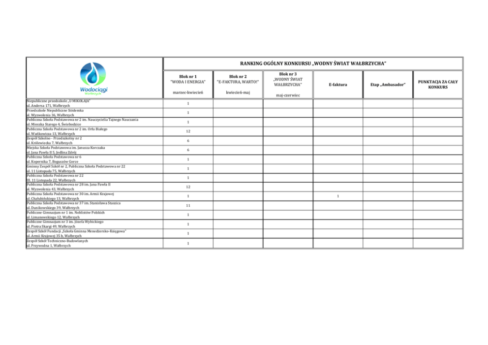 RANKING OGÓLNY KONKURSU „WODNY ŚWIAT WAŁBRZYCHA” Niepubliczne przedszkole „U MIKOŁAJA” ul. Andersa 171, Wałbrzych Przedszkole Niepubliczne Siódemka al. Wyzwolenia 36, Wałbrzych Publiczna Szkoła Podstawowa nr 2 im. Nauczycielia Tajnego Nauczania ul. Mieszka Starego 4, Świebodzice Publiczna Szkoła Podstawowa nr 2 im. Orła Białego ul. Wańkowicza 13, Wałbrzych Zespół Szkolno - Przedszkolny nr 2 ul. Królewiecka 7, Wałbrzych Miejska Szkoła Podstawowa im. Janusza Korczaka ul. Jana Pawła II 5, Jedlina Zdrój Publiczna Szkoła Podstawowa nr 6 ul. Kopernika 7, Boguszów Gorce Gminny Zespół Szkół nr 2, Publiczna Szkoła Podstawowa nr 22 ul. 11 Listopada 75, Wałbrzych Publiczna Szkoła Podstawowa nr 22 Ul. 11 Listopada 22, Wałbrzych Publiczna Szkoła Podstawowa nr 28 im. Jana Pawła II al. Wyzwolenia 43, Wałbrzych Publiczna Szkoła Podstawowa nr 30 im. Armii Krajowej ul. Chałubińskiego 13, Wałbrzych Publiczna Szkoła Podstawowa nr 37 im. Stanisława Staszica ul. Dunikowskiego 39, Wałbrzych Publiczne Gimnazjum nr 1 im. Noblistów Polskich ul. Limanowskiego 12, Wałbrzych Publiczne Gimnazjum nr 3 im. Józefa Wybickiego ul. Piotra Skargi 49, Wałbrzych Zespół Szkół Fundacji „Szkoła Gminna Menedżersko-Księgowa” ul. Armii Krajowej 35 b, Wałbrzych Zespół Szkół Techniczno-Budowlanych ul. Przywodna 1, Wałbrzych Blok nr 1 "WODA I ENERGIA" Blok nr 2 "E-FAKTURA, WARTO!" marzec-kwiecień kwiecień-maj Blok nr 3 „WODNY ŚWIAT WAŁBRZYCHA” E-faktura maj-czerwiec 1 1 1 12 6 6 1 1 1 12 1 11 1 1 1 1 1 Etap „Ambasador” PUNKTACJA ZA CAŁY KONKURS