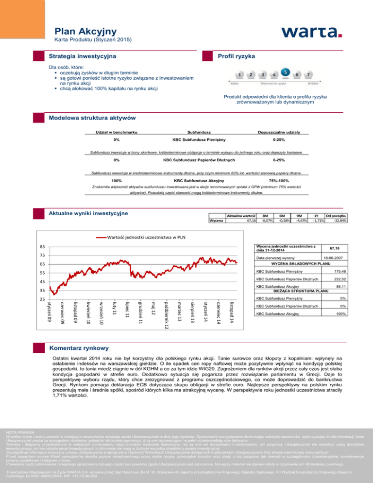 Plan Akcyjny Karta Produktu (Styczeń 2015) Strategia inwestycyjna Profil ryzyka Dla osób, które: oczekują zysków w długim terminie są gotowi ponieść istotne ryzyko związane z inwestowaniem na rynku akcji chcą alokować 100% kapitału na rynku akcji Produkt odpowiedni dla klienta o profilu ryzyka zrównoważonym lub dynamicznym Modelowa struktura aktywów Udział w benchmarku Subfundusz Dopuszczalne udziały 0% KBC Subfundusz Pieniężny 0-25% Subfundusz inwestuje w bony skarbowe, krótkoterminowe obligacje o terminie wykupu do jednego roku oraz depozyty bankowe. KBC Subfundusz Papierów Dłużnych 0% 0-25% Subfundusz inwestuje w średnioterminowe instrumenty dłużne, przy czym minimum 80% ich wartości stanowią papiery dłużne. 100% KBC Subfundusz Akcyjny 75%-100% Znakomita większość aktywów subfunduszu inwestowana jest w akcje renomowanych spółek z GPW (minimum 75% wartości aktywów). Pozostałą część stanowić mogą krótkoterminowe instrumenty dłużne. Aktualne wyniki inwestycyjne Wycena Aktualna wartość 67,16 3M -6,07% 6M -0,28% 9M -4,67% 1Y Od początku -1,71% -32,84% Wartość jednostki uczestnictwa w PLN 85 Wycena jednostki uczestnictwa z dnia 31-12-2014 75 Data pierwszej wyceny 67,16 18-06-2007 WYCENA SKŁADOWYCH PLANU 65 55 45 KBC Subfundusz Pieniężny 175,46 KBC Subfundusz Papierów Dłużnych 222,52 listopad 14 czerwiec 14 styczeń 14 sierpień 13 marzec 13 październik 12 maj 12 grudzień 11 lipiec 11 luty 11 wrzesień 10 0% kwiecień 10 0% KBC Subfundusz Papierów Dłużnych listopad 09 KBC Subfundusz Pieniężny czerwiec 09 25 styczeń 09 35 KBC Subfundusz Akcyjny BIEŻĄCA STRUKTURA PLANU KBC Subfundusz Akcyjny 86,11 100% Komentarz rynkowy Ostatni kwartał 2014 roku nie był korzystny dla polskiego rynku akcji. Tanie surowce oraz kłopoty z kopalniami wpłynęły na osłabienie indeksów na warszawskiej giełdzie. O ile spadek cen ropy naftowej może pozytywnie wpłynąć na kondycję polskiej gospodarki, to tania miedź ciągnie w dół KGHM a co za tym idzie WIG20. Zagrożeniem dla rynków akcji przez cały czas jest słaba kondycja gospodarki w strefie euro. Dodatkowo sytuacja się pogarsza przez rozwiązanie parlamentu w Grecji. Daje to perspektywę wyboru rządu, który chce zrezygnować z programu oszczędnościowego, co może doprowadzić do bankructwa Grecji. Rynkom pomaga deklaracja ECB dotycząca skupu obligacji w strefie euro. Najlepsze perspektywy na polskim rynku prezentują małe i średnie spółki, spośród których kilka ma atrakcyjną wycenę. W perspektywie roku jednostki uczestnictwa straciły 1,71% wartości. NOTA PRAWNA Wszelkie opinie i oceny zawarte w niniejszym opracowaniu wyrażają opinie Ubezpieczyciela w dniu jego wydania. Opracowanie przygotowano dochowując należytej staranności, wykorzystując źródła informacji, które Ubezpieczyciel uważa za wiarygodne i dokładne, jednakże nie istnieje gwarancja, iż są one wyczerpujące i w pełni odzwierciedlają stan faktyczny. Wykresy i diagramy przedstawione w niniejszym opracowaniu mają charakter wyłącznie ilustracyjny, nie są one ani doradztwem inwestycyjnym, ani prognozą. Ubezpieczyciel nie świadczy usług doradztwa inwestycyjnego, ani nie udziela porad inwestycyjnych a informacje nie mają w żadnym wypadku charakteru porady inwestycyjnej. Szczegółowe informacje dotyczące umowy ubezpieczenia znajdują się w Ogólnych Warunkach Ubezpieczenia dostępnych w placówkach Ubezpieczyciela i/lub stronie internetowej www.warta.pl. Przed zawarciem umowy Klient samodzielnie określa poziom akceptowalnego przez siebie ryzyka, potencjalne korzyści oraz straty z nią związane, jak również w szczególności charakterystykę, konsekwencje prawne, podatkowe i księgowe umowy. Powielanie bądź publikowanie niniejszego opracowania lub jego części bez pisemnej zgody Ubezpieczyciela jest zabronione. Niniejszy materiał nie stanowi oferty w rozumieniu art. 66 Kodeksu cywilnego. Towarzystwo Ubezpieczeń na Życie WARTA S.A. wpisane przez Sąd Rejonowy dla M. St. Warszawy do rejestru przedsiębiorców Krajowego Rejestru Sądowego, XII Wydział Gospodarczy Krajowego Rejestru Sądowego, Nr KRS: 0000023648, NIP 113-15-36-859.