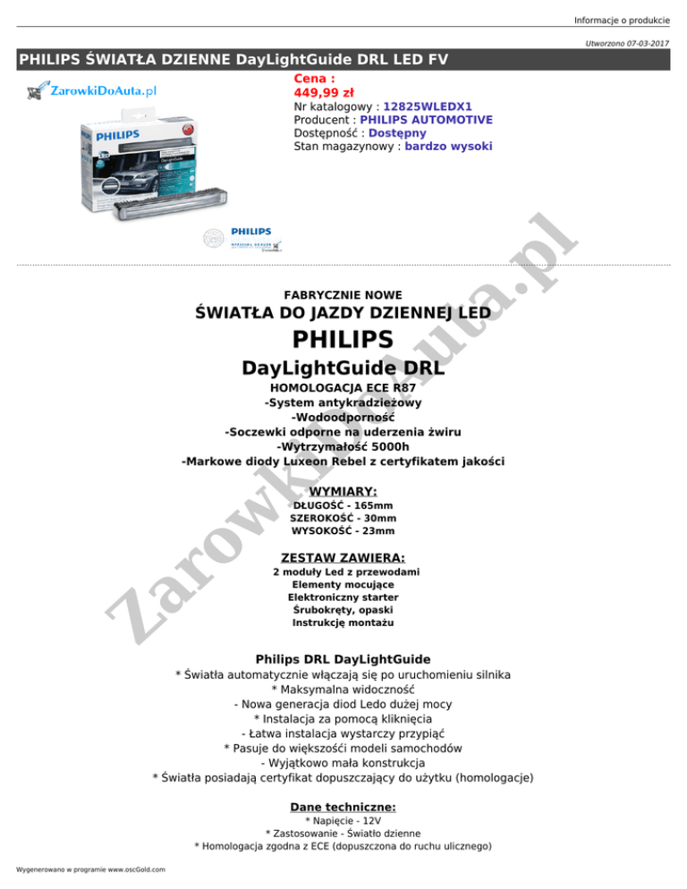 Informacje o produkcie Utworzono 07-03-2017 PHILIPS ŚWIATŁA DZIENNE DayLightGuide DRL LED FV Cena : 449,99 zł FABRYCZNIE NOWE a. pl Nr katalogowy : 12825WLEDX1 Producent : PHILIPS AUTOMOTIVE Dostępność : Dostępny Stan magazynowy : bardzo wysoki ut ŚWIATŁA DO JAZDY DZIENNEJ LED PHILIPS ki D oA DayLightGuide DRL HOMOLOGACJA ECE R87 -System antykradzieżowy -Wodoodporność -Soczewki odporne na uderzenia żwiru -Wytrzymałość 5000h -Markowe diody Luxeon Rebel z certyfikatem jakości Za ro w WYMIARY: DŁUGOŚĆ - 165mm SZEROKOŚĆ - 30mm WYSOKOŚĆ - 23mm ZESTAW ZAWIERA: 2 moduły Led z przewodami Elementy mocujące Elektroniczny starter Śrubokręty, opaski Instrukcję montażu Philips DRL DayLightGuide * Światła automatycznie włączają się po uruchomieniu silnika * Maksymalna widoczność - Nowa generacja diod Ledo dużej mocy * Instalacja za pomocą kliknięcia - Łatwa instalacja wystarczy przypiąć * Pasuje do większośći modeli samochodów - Wyjątkowo mała konstrukcja * Światła posiadają certyfikat dopuszczający do użytku (homologacje) Dane techniczne: * Napięcie - 12V * Zastosowanie - Światło dzienne * Homologacja zgodna z ECE (dopuszczona do ruchu ulicznego) Wygenerowano w programie www.oscGold.com Philips DayLightGuide spełni oczekiwania nawet najbardziej wymagających kierowców. Kupując ten produkt otrzymują Państwo gwarancję wysokiej widoczności oraz gwarancję maksymalnej poprawy bezpieczeństwa. Silne diody LED o jakości OE firmy Philips zapewniaja poprawę bezpieczeństwa na drodze dzięki zwiększeniu widoczności, nie skracając jednocześnie okresu użytkowania i nie zwiększając zużycia energii. Za ro w ki D oA ut a. pl Podstawą do rozpatrzenia reklamacji jest posiadanie dowodu zakupu tj. paragonu lub faktury VAT.