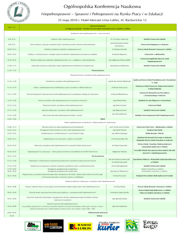 Ogólnopolska Konferencja Naukowa Niepełnosprawni – Sprawni i Pełnoprawni na Rynku Pracy i w Edukacji 25 maja 2010 r. Hotel Mercure Unia Lublin, Al. Racławickie 12 9.00 - 9.15 Otwarcie konferencji dr Małgorzata Jedynak – Prorektor Wyższej Szkoły Nauk Społecznych z siedzibą w Lublinie Kształcenie osób niepełnosprawnych – nowe wyzwania 9.20 -9.35 Godność osoby niepełnosprawnej ks. dr Tomasz Adamczyk prof.dr hab.Halina Sekuła- Katolicki Uniwersytet Lubelski 9.40 -9.55 Wzory edukacji i aspiracje zawodowe osób z dysfunkcją wzroku wybranej szkoły policealnej 10.00 -10.15 Problemy kształcenia studentów niepełnosprawnych dr Wiesław Kowalski Wyższa Szkoła Ekonomii i Innowacji w Lublinie 10.20 -10.35 Problemy w funkcjonowaniu i strategie wsparcia studentów niepełnosprawnych podczas wykładów dr Dorota Otapowicz Uniwersytet w Białymstoku Kwaśniewicz 10.40 -10.55 Wsparcie edukacyjne studentów niepełnosprawnych w UJ – współpraca z kadrą akademicką mgr Małgorzata Perdeus-Białek 11.00 -11.15 Szkoła jako instytucja socjalizująca osoby niepełnosprawne do pełnienia ról społecznych mgr Katarzyna Mikołowska 11.20 -11.35 Uniwersytet Pedagogiczny w Krakowie Uniwersytet Jagielloński, Biuro ds. Osób Niepełnosprawnych Katolicki Uniwersytet Lubelski Przerwa kawowa Planowanie kariery zawodowej osób niepełnosprawnych 11.35 -11.50 11.55 -12.10 Poradnictwo zawodowe dla niepełnosprawnych prof.dr hab. Henryk Skłodowski Osoby z niepełnosprawnością intelektualną a praca zawodowa- refleksje badawcze dr Dorota Tomczyszyn Społeczna Wyższa Szkoła Przedsiębiorczości i Zarządzania w Łodzi Państwowa Szkoła Wyższa im. Papieża Jana Pawła II w Białej Podlaskiej Uniwersytet Humanistyczno Przyrodniczy 12.15 -12.30 Rozwój kompetencji informatycznych osób niepełnosprawnych a perspektywy dostępu do rynku pracy dr Ryszard Błaszkiewicz 12.35 -12.50 Kariera zawodowa osób niepełnosprawnych na otwartym rynku pracy mgr Wioleta Duda Akademia im. Jana Długosza w Częstochowie 12.55 -13.10 Planowanie kariery zawodowej osób niepełnosprawnych mgr Dariusz Hywel Uniwersytet Śląski 13.15 -13.30 Aspiracje edukacyjne i zawodowe osób niepełnosprawnych mgr Dagmara Jarosz Katolicki Uniwersytet Lubelski 13.35 -13.50 mgr Alicja Jankiewicz Biuro karier dla osób niepełnosprawnych-fakty i wnioski 14.00 -15.00 J. Kochanowskiego w Kielcach Lubelskie Forum Organizacji Osób Niepełnosprawnych Obiad Osoby niepełnosprawne na lokalnych i międzynarodowych rynkach pracy 15.00 -15.15 Potrzeby psychiczne osób niepełnoprawnych bezrobotnych prof. dr hab. Janusz Kirenko Uniwersytet Marii Curie – Skłodowskiej w Lublinie 15.20 -15.35 Wystąpienie Prezesa fundacji na rzecz osób niepełnosprawnych mgr Marek Piasecki Fundacja Fuga Mundi 15.40 -15.55 Niepełnosprawni w Wielkiej Brytanii i innych krajach Europy ing. Alberto Marangon Wielka Brytania / Włochy 16.00 -16.15 16.20 -16.35 16.40 -16.55 Niepełnosprawni na rynku pracy: zaradni czy bezradni? dr Teresa Jarmułka- Kliś Aktywność zawodowa osób niepełnosprawnych z powodu chorób somatycznych dr Andrzej Lipczyński Niepełnosprawni na rynku pracy – własny pomysł na biznes na przykładzie Accessible Poland Tours 16.55 -17.10 Małopolska Wyższa Szkoła Zawodowa w Krakowie Wyższa Szkoła Stosunków Międzynarodowych i Komunikacji Społecznej w Chełmie Accessible Poland Tours pierwsze biuro podróży dla osób starszych i z niepełnosprawnością Przerwa kawowa 17.15 -17.30 Podmiotowe i środowiskowe uwarunkowania aktywności zawodowej osób psychicznie chorych 17.35 -17.50 Współczesne rozwiązania w zakresie wspierania zatrudnienia osób z uszkodzeniami słuchu 17.50 -18.05 18.05 -18.20 Wystąpienie przedstawiciela Urzędu Pracy Wystąpienie przedstawiciela Urzędu Pracy 18.25 -18.40 Małgorzata Tokarska Akademia Wychowania Fizycznego w Krakowie, Droga do pracy uczestnika Środowiskowego Domu Samopomocy dla Osób z Zaburzeniami Zdrowia Psychicznego w Chorzowie jako jedno z kryterium sukcesu w rehabilitacji lek med. Katarzyna Bernaciak Samodzielny Publiczny Wojewódzki Szpital Specjalistyczny dr Andrzej Lipczyński w Chełmie dr Ewa Domagała-Zysk Katolicki Uniwersytet Lubelski mgr Mariusz Wiktorowicz Miejski Urząd Pracy w Lublinie Wojewódzki Urząd Pracy w Lublinie dr Irena Przywarka Kolegium Pracowników Służb Społecznych Czeladź Wsparcie społeczne, edukacyjne i zawodowe osób niepełnosprawnych 18.45 -19.00 Postawy rodziców dzieci uczęszczających do przedszkola integracyjnego wobec osób niepełnosprawnych dr Alicja Olszak Wyższa Szkoła Ekonomii i Innowacji w Lublinie Wyższa Szkoła Nauk Społecznych w Lublinie 19.05 -19.20 19.25 -19.40 Warsztat terapii zajęciowej formą aktywizacji społeczno - zawodowej osób niepełnosprawnych Znaczenie środowiska rodzinnego w przygotowaniu dziecka niepełnosprawnego do edukacji szkolnej i aktywizacji zawodowej dr Krystyna Szpak-Lipińska Medyczne Studium Zawodowe w Chełmie mgr Agnieszka Kruba Katolicki Uniwersytet Lubelski Kierunki wsparcia osób niepełnosprawnych 19.45 -20.00 /na przykładzie nagrodzonych i wyróżnionych projektów jednostek samorządu terytorialnego szczebla gminy i powiatu w ramach konkursu Ministerstwa Pracy i Polityki Społecznej „Równe szanse, równy dostęp” w latach 2008 – 2009/ 20.00 -20.30 20.30 Podsumowanie konferencji Kolacja mgr Anna Gatkowska