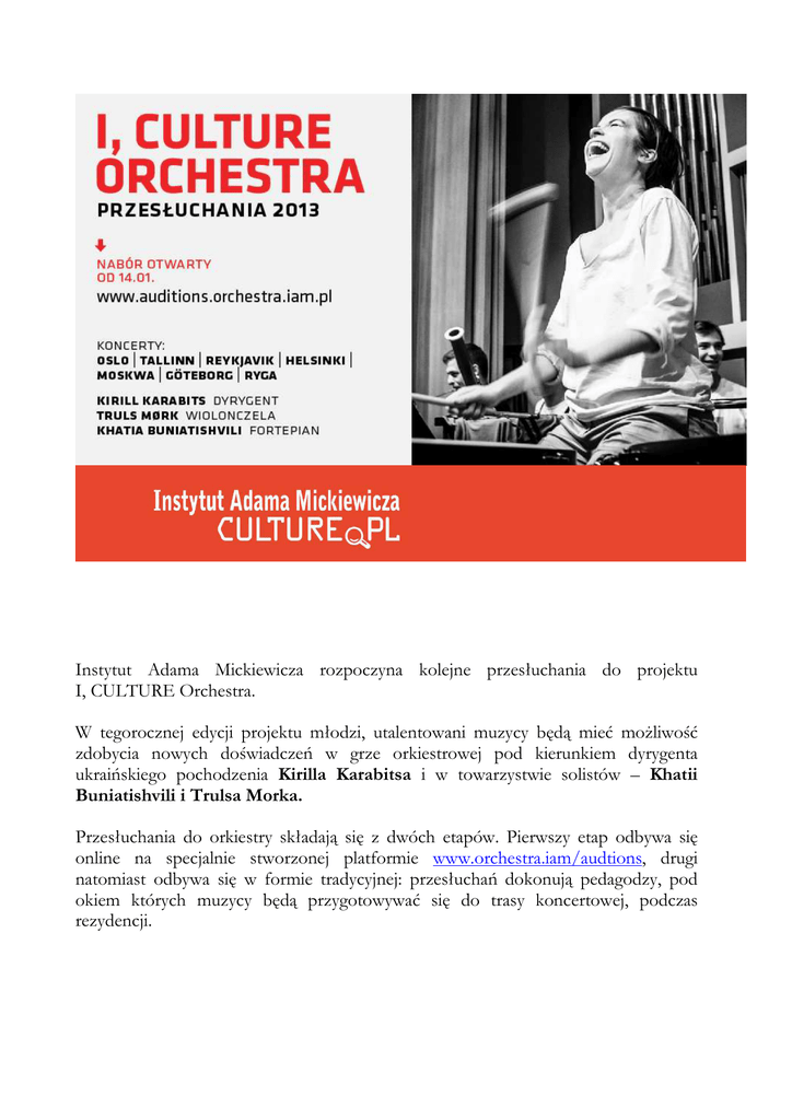 Instytut Adama Mickiewicza rozpoczyna kolejne przesłuchania do projektu I, CULTURE Orchestra. W tegorocznej edycji projektu młodzi, utalentowani muzycy będą mieć możliwość zdobycia nowych doświadczeń w grze orkiestrowej pod kierunkiem dyrygenta ukraińskiego pochodzenia Kirilla Karabitsa i w towarzystwie solistów – Khatii Buniatishvili i Trulsa Morka. Przesłuchania do orkiestry składają się z dwóch etapów. Pierwszy etap odbywa się online na specjalnie stworzonej platformie www.orchestra.iam/audtions, drugi natomiast odbywa się w formie tradycyjnej: przesłuchań dokonują pedagodzy, pod okiem których muzycy będą przygotowywać się do trasy koncertowej, podczas rezydencji. HARMONOGRAM I etap – przesłuchania online 14 - 31.01.2013 – Rejestracja 14.01.- 9.02.2013 – Przesyłanie nagrań video 18.02.2013 – Ogłoszenie wyników I etapu II etap – przesłuchania na żywo 11.03.2013 - Gdańsk (Polska) 11.03.2013 - Lwów (Ukraina) 12-13.03.2013 - Kijów (Ukraina) 12-14.03.2013 - Warszawa (Polska) 14.03.2013 - Odessa (Ukraina) 15.03.2013 - Wiedeń (Austria) 15-16.03.2013 - Kiszyniów (Mołdawia) 18.03.2013 - Bruksela (Belgia) 18-19.03.2013 - Tbilisi (Gruzja) 20.03.2013 - Londyn (Wielka Brytania) 20.03.2013 - Batumi (Gruzja) 21.03.2013 - Kutaisi (Gruzja) 22-23.03.2013 - Mińsk (Białoruś) 22-23.03.2013 - Erywań (Armenia) 25-26.03.2013 - Baku (Azerbejdżan) 11.04.2013 – Ogłoszenie składu orkiestry 15-24.08.2013 – Rezydencja 25.08 – 5.09.2013 - Trasa koncertowa Północne tournée (m.in. Ryga, Tallinn, Oslo, Reykjavik, Helsinki, Göteborg, Moskwa) Osoby do kontaktu: Marta Szymańska – [email protected]; tel. (+48 22) 44 76 182 Jakub Fiebig – [email protected]; tel. (+48 22) 44 76 179
