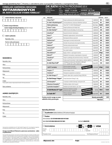 Uwaga powtórny fax! PL Prosimy o zakreślenie pola w przypadku meldunku o wystąpieniu błędu. FORMULARZ ZAMÓWIENIA MIESZANEK DR. RATH HEALTH PROGRAMS B.V. WITAMINOWYCH Postbus 657 6400 AR Heerlen Holandia DR. RATH’S CELLULAR VITAMIN FORMULAS™ Jestem klientem, mój numer: Ilość poniedziałek-piątek Faks: +31 (0)45 71 11 119 od 08:30 – do 17:00 Telefon: 00800 - 11 24 639 E-Mail: [email protected] NOWOŚĆ! Bezpłatny Serwis Online-Shop: www.dr-rath.com Klienta i Zamówienia* Mieszanka Zawartość Vitacor PlusTM tabletek 90 41,90 Dr. Rath’s Phytobiologicals Formuła podstawowa z aktywnymi składnikami roślinnymi kapsułek 60 29,90 Pakiet podstawowy Vitacor PlusTM i Dr. Rath’s PhytobiologicalsTM tab./kap. 90/60 VitacorTM Junior Program podstawowy dla młodych ludzi tabletek 90 21,90 Tabletki do ssania dla każdego, kto chce być duży tabletek 120 23,90 Naczynia krwionośne i tkanka łączna tabletek 60 34,90 Diacor Metabolizm węglowodanów i ochrona komórek tabletek 90 34,90 EnercorTM Bioenergia komórkowa i sprawność tabletek 60 34,90 Wspomaganie normalnej funkcji komórek kapsułek 180 38,90 Dla kobiet i dla zachowania równowagi hormonalnej kapsułek 60 23,90 Przemiany substancji pokarmowych kapsułek 90 18,90 Dr. Rath VitaKids TM TM Arteriforte TM Jestem z polecenia: Nazwisko, imię: EpiQuercican Numer osoby polecającej Cena € Program podstawowy dla codziennej suplementacji TM Jestem nowym klientem numer mojego doradcy/terapeuty (jeśli jest znany): *nr bezpłatny tylko dla osób dzwoniących z te telefonu stacjonarnego TM FemicellTM TM Illioforte TM 66,90 ImmunoCell Tworzenie krwi i system immunologiczny tabletek 90 27,90 LensivitTM Oczy i jakość widzenia kapsułek 60 21,90 TM MacroBalance Bogaty w błonnik - wspomaganie trawienia proszek 450gr MetavitTM Metabolizm homocysteiny i energii (włącznie z tłuszczami) tabletek 90 29,90 Program uzupełniający dla zachowania struktury i funkcji kości tabletek 90 28,90 Funkcja naczyń krwionośnych i mięśni (włącznie z mięśniami gładkimi) tabletek 90 33,90 Dr. Rath Phyto ProM Z biologicznie aktywnych ekstraktów roślinnych (m.in. z pestek dyni, palmy sabalowej) kapsułek 120 35,80 Kod pocztowy: LyCinTM ze stewią Ochrona tkanek i komórek Teraz ze stewią, bez fruktozy Miejscowość: Prolysin C TM Budowa kolagenu i tkanek tabletek 90 24,90 Podwyższone zaopatrzenie na witaminę C tabletek 90 17,90 Kapsułki z olejem rybim o zawartości Omega 3 EPAi DHA kapsułek 60 14,90 Dr. Rath Omega 3 VeganTM Kwasy tłuszczowe Omega 3 z alg kapsułek 60 22,50 Q10 KompleksTM Z naturalnym nośnikiem bioenergii - koenzymem Q10 kapsułek 60 24,90 Witaminy B KompleksTM Dodatkowy dopływ witamin grupy B tabletek 60 14,90 Cynk-Selen Kompleks Niezbędne pierwiastki śladowe: cynk i selen tabletek 60 13,90 Dr Rath Witamina D3TM Liquid Słoneczna witamina w prostej formie do użycia - rozpylacza Dr. Rath OPC™ Wtórne substancje roślinne z pestek winogron TM Osteoforte NADAWCA: TM Relavit Nazwisko, imię: TM Ulica: VitaCforte Kraj: Dr. Rath Omega E Tel.: E-Mail: Proszę wypełnić, abyśmy mogli przesyłać aktualne informacje zdrowotne. ADRES ZASTĘPCZY: Ulica: TM TM Data urodzenia: Nazwisko, imię: TM ŚĆ! NOWO ŚĆ! NOWO ŚĆ! NOWO Prosimy zwrócić uwagę na nasze oddzielne oferty promocyjne proszek 420gr spray 50ml kapsułek 60 Koszty przesyłki 31,90 31,90 15,90 25,90 3,90 Wartość Kod pocztowy: Miejscowość: Kraj: Tel.: E-Mail: Sposoby płatności Za pobraniem (Opłatę dodatkową 2,50 € pokrywa kupujący) Przelew Konto bankowe: 83 1670 0004 0000 6439 9107 8061 IBAN: PL 83 1670 0004 0000 6439 9107 8061 Upoważniam przedsiębiorstwo Dr. Rath Health Programs B.V. do obciążenia mojej karty kredytowej należną kwotą po upływie 4 dni od daty wystawienia faktury. Uwaga nowi Klienci! Płatność za pierwsze zamówienia – tylko za pobraniem! W przypadku braku danych zamowienia nie będą realizowane. Ryzyko przesyłki ponosi nabywca. O jakichkolwiek zmianach dotyczących przesyłek, klienci zostaną niezwłocznie poinformowani. Jeśli koszty wysyłki nie są uwzględnione, dostawa jest bezpłatna. Zarowno dostawa i cała procedura zamowień podlega prawu holenderskiemu. Zlecam przedsiębiorstwu Dr. Rath Health Programs B.V. przeprowadzenie w moim imieniu wysyłki kurierem, pocztą lub fi rmą spedycyjną. www.dr-rath.com (19.02.2015) Wszelkie prawa zastrzeżone (POLSKA) Kod Swift: ABNAPLPW Karta kredytowa Numer karty Data ważności Posiadacz karty Miejscowość, data Kod Bezpieczeństwa* Podpis #1445/02-190215/PL
