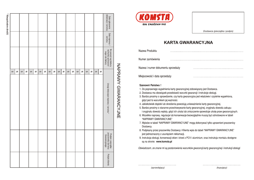 Data zgłoszenia reklamacji / serwisu Dostawca (pieczątka i podpis) Data naprawy / serwisu KARTA GWARANCYJNA Nr pozycji wg faktury, rachunku uproszczonego lub faktury Nazwa Produktu Numer zamówienia Nazwa i numer dokumentu sprzedaży Miejscowość i data sprzedaży Uwagi dotyczące naprawy / serwisu* Podpis i pieczątka pracownika Serwisu Gwarancyjnego Szanowni Państwo ! 1. Do poprawnego wypełnienia karty gwarancyjnej zobowiązany jest Dostawca. 2. Dostawca ma obowiązek przedstawić warunki gwarancji i instrukcje obsługi. 3. Bardzo prosimy o sprawdzenie, czy karta gwarancyjna jest właściwie i czytelnie wypełniona, gdyż jest to warunkiem jej ważności. 4. Jakiekolwiek dopiski lub skreślenia powodują unieważnienie karty gwarancyjnej. 5. Bardzo prosimy o staranne przechowywanie karty gwarancyjnej, oryginału dowodu zakupu i oryginału dowodu wpłaty, gdyż ich utrata lub zniszczenie spowoduje utratę praw gwarancyjnych. 6. Wszelkie naprawy, regulacje lub konserwacje bezwzględnie muszą być odnotowane w tabeli “NAPRAWY GWARANCYJNE” 7. Wpisów w tabeli “NAPRAWY GWARANCYJNE” mogą dokonywać tylko uprawnieni pracownicy Dostawcy. 8. Podpisany przez pracownika Dostawcy i Klienta wpis do tabeli “NAPRAWY GWARANCYJNE” jest jednoznaczny z usunięciem reklamacji. 9. Instrukcja obsługi, konserwacji okien i drzwi z PCV i aluminium, oraz instrukcja montażu dostępne są na stronie: www.komsta.pl Oświadczam, ze znane mi są postanowienia warunków gwarancji,karty gwarancyjnej i instrukcji obsługi Podpis klienta (sprzedający) (kupujący) Warunki Gwarancji 1. Firma KOMSTA z siedzibą w Pyskowicach ul. Nasienna 2 udziela gwarancji: - na sprawne funkcjonowanie swoich wyrobów na okres 10 lat, - na zawiasy, wkładki, samozamykacze, klamki, pochwyty, zamki i inne wyposażenie dodatkowe i specjalne - gwarancja równa gwarancji producenta wyposażenia. 2. Warunkiem koniecznym do otrzymania 10-letniej gwarancji jest coroczne serwisowanie okien i drzwi przez autoryzowany serwis KOMSTA w okresie wiosennym (marzec - czerwiec). Rozpoczęcie serwisowania rozpoczyna się pierwszą wiosną po upływie 1 roku kalendarzowego od momentu zakupu wyrobu. Serwisowanie odbywa się wyłącznie na wniosek Klienta. 3. W ramach gwarancji Klientowi przysługuje prawo do naprawy wadliwego wyrobu, jego wymiany w przypadku nie dającej się usunąć wady lub bonifikaty cenowej, obiektywnie odpowiadającej obniżeniu wartości użytkowej wyrobu. 4. Firma KOMSTA sprzedaje swoje wyroby bezpośrednio (w swojej siedzibie) lub poprzez firmy sprzedające jej wyroby. W dalszej części warunków gwarancji firma KOMSTA i firmy sprzedające jej wyroby nazywane będą Dostawcą. 5. Jeżeli Klient korzysta z usługi montażu Dostawcy, okres gwarancji rozpoczyna się od daty montażu wyrobów. 6. W przypadku korzystania z usługi montażu firmy KOMSTA, Klientowi udzielana jest gwarancja na montaż na okres 1 roku. 7. W przypadku korzystania z usługi montażu firmy sprzedającej wyroby firmy KOMSTA, okres gwarancji na montaż określa w swojej umowie firma sprzedająca. 8. Ekipa montażowa odpowiedzialna jest za regulację wyrobu. 9. Jeżeli Klient nie korzysta z usługi montażu Dostawcy, okres gwarancji rozpoczyna się od daty wydania wyrobów. 10. Gwarancja obejmuje nieodpłatne usunięcie wad wyrobu, to jest takich usterek, które uniemożliwiają spełnianie funkcji wyrobów określonych w instrukcji obsługi. 11. Zgłoszenie reklamacji z tytułu gwarancji nie upoważnia Klienta do wstrzymania zapłaty za zakupione wyroby. 12. Do chwili pełnej zapłaty za wyroby, pozostają one własnością Dostawcy i nie podlegają reklamacji (zgodnie z art. 58 589 do 591 KC) 13. Gwarancja nie upoważnia Klienta do domagania się zwrotu utraconych zysków, zwrotu kosztów naprawy, ewentualnych szkód lub innych odszkodowań związanych z wadami wyrobów. 14. Odpowiedzialność Dostawcy z tytułu wad wyrobów ogranicza się do wartości reklamowanego wyrobu lub jego części i nie może przekroczyć wartości jego zakupu. 15. W przypadku sprzedaży przez Klienta wyrobów przed zamontowaniem, w okresie trwania gwarancji, uprawnienia wynikające z gwarancji przechodzą na nabywcę. 16. Ponieważ firma KOMSTA wykonuje standardowo okna i drzwi balkonowe pozbawione szczelin infiltracyjnych w uszczelkach przylgowych, przeznaczone do pomieszczeń wyposażonych w urządzenia z regulowanym nawiewem, umożliwiającym wymianę zużytego powietrza, Klient zobowiązany jest do zgłoszenia przy zakupie, że pomieszczenie nie posiada regulowanego nawiewu powietrza i konieczne jest wykonanie szczelin infiltracyjnych. 17. Klient zobowiązany jest do zgłoszenia przy zakupie, że pomieszczenie wyposażone jest w urządzenia z regulowanym nawiewem powietrza. Nie zachodzi wtedy konieczność wykonania szczelin infiltracyjnych. 18. W pomieszczeniach bez regulowanego nawiewu powietrza, zgodnie z wymaganiami prawnymi, mogą być stosowane okna i drzwi balkonowe, w których wykonano szczeliny infiltracyjne, Dlatego też nie odpowiadające prawdzie zgłoszenie, że pomieszczenie wyposażone jest w urządzenia z regulowanym nawiewem powietrza powoduje przeniesienie odpowiedzialności wykonania szczelin infiltracyjnych na Klienta. Ponieważ szczeliny infiltracyjne muszą się znajdować w ściśle określonych miejscach zalecamy zlecić ich wykonanie serwisowi jako usługę odpłatną. 19. Klient zobowiązany jest do odbioru wyrobów i potwierdzenia tego faktu - w druku odbioru. Z chwilą odebrania wyrobu Klient ponosi ryzyko jego uszkodzenia lub utraty. 20. Ewentualne wady wyrobów, jak również niezgodności wyrobów z umową (ilość, wymiary, rodzaj profila itp.), muszą być zgłaszane w momencie odbioru i zapisane w druku odbioru lub obustronnie podpisanym protokole, gdyż w przeciwnym razie nie będą objęte gwarancją. 21. W przypadku odbioru okien i drzwi własnym lub wynajętym środkiem transportu, prosimy o poinformowanie się u Dostawcy 