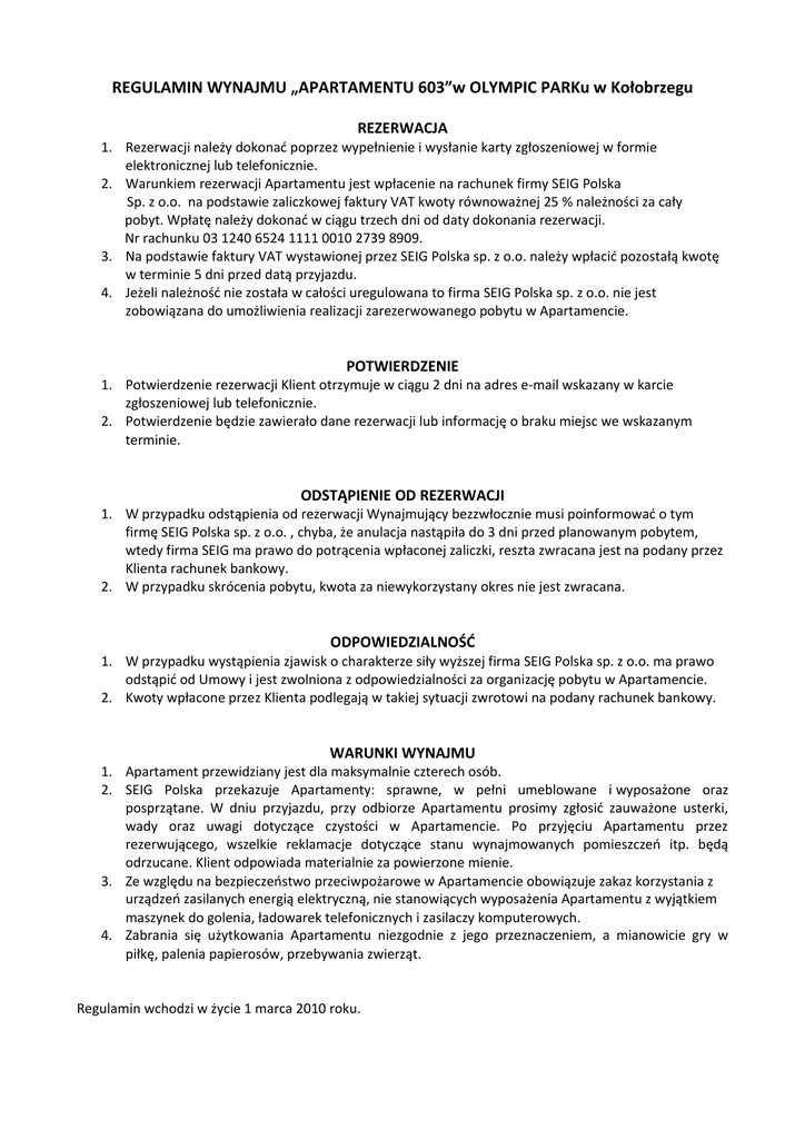 REGULAMIN WYNAJMU „APARTAMENTU 603”w OLYMPIC PARKu w Kołobrzegu REZERWACJA 1. Rezerwacji należy dokonać poprzez wypełnienie i wysłanie karty zgłoszeniowej w formie elektronicznej lub telefonicznie. 2. Warunkiem rezerwacji Apartamentu jest wpłacenie na rachunek firmy SEIG Polska Sp. z o.o. na podstawie zaliczkowej faktury VAT kwoty równoważnej 25 % należności za cały pobyt. Wpłatę należy dokonać w ciągu trzech dni od daty dokonania rezerwacji. Nr rachunku 03 1240 6524 1111 0010 2739 8909. 3. Na podstawie faktury VAT wystawionej przez SEIG Polska sp. z o.o. należy wpłacić pozostałą kwotę w terminie 5 dni przed datą przyjazdu. 4. Jeżeli należność nie została w całości uregulowana to firma SEIG Polska sp. z o.o. nie jest zobowiązana do umożliwienia realizacji zarezerwowanego pobytu w Apartamencie. POTWIERDZENIE 1. Potwierdzenie rezerwacji Klient otrzymuje w ciągu 2 dni na adres e-mail wskazany w karcie zgłoszeniowej lub telefonicznie. 2. Potwierdzenie będzie zawierało dane rezerwacji lub informację o braku miejsc we wskazanym terminie. ODSTĄPIENIE OD REZERWACJI 1. W przypadku odstąpienia od rezerwacji Wynajmujący bezzwłocznie musi poinformować o tym firmę SEIG Polska sp. z o.o. , chyba, że anulacja nastąpiła do 3 dni przed planowanym pobytem, wtedy firma SEIG ma prawo do potrącenia wpłaconej zaliczki, reszta zwracana jest na podany przez Klienta rachunek bankowy. 2. W przypadku skrócenia pobytu, kwota za niewykorzystany okres nie jest zwracana. ODPOWIEDZIALNOŚĆ 1. W przypadku wystąpienia zjawisk o charakterze siły wyższej firma SEIG Polska sp. z o.o. ma prawo odstąpić od Umowy i jest zwolniona z odpowiedzialności za organizację pobytu w Apartamencie. 2. Kwoty wpłacone przez Klienta podlegają w takiej sytuacji zwrotowi na podany rachunek bankowy. WARUNKI WYNAJMU 1. Apartament przewidziany jest dla maksymalnie czterech osób. 2. SEIG Polska przekazuje Apartamenty: sprawne, w pełni umeblowane i wyposażone oraz posprzątane. W dniu przyjazdu, przy odbiorze Apartamentu prosimy zgłosić zauważone usterki, wady oraz uwagi dotyczące czystości w Apartamencie. Po przyjęciu Apartamentu przez rezerwującego, wszelkie reklamacje dotyczące stanu wynajmowanych pomieszczeń itp. będą odrzucane. Klient odpowiada materialnie za powierzone mienie. 3. Ze względu na bezpieczeństwo przeciwpożarowe w Apartamencie obowiązuje zakaz korzystania z urządzeń zasilanych energią elektryczną, nie stanowiących wyposażenia Apartamentu z wyjątkiem maszynek do golenia, ładowarek telefonicznych i zasilaczy komputerowych. 4. Zabrania się użytkowania Apartamentu niezgodnie z jego przeznaczeniem, a mianowicie gry w piłkę, palenia papierosów, przebywania zwierząt. Regulamin wchodzi w życie 1 marca 2010 roku.