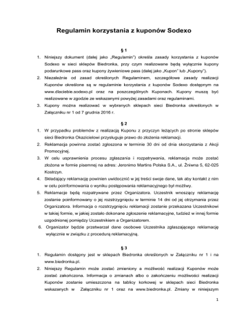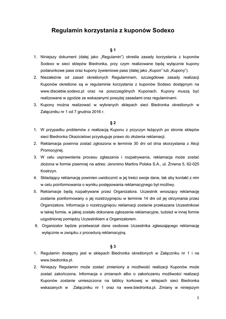 Regulamin korzystania z kuponów Sodexo §1 1. Niniejszy dokument (dalej jako „Regulamin”) określa zasady korzystania z kuponów Sodexo w sieci sklepów Biedronka, przy czym realizowane będą wyłącznie kupony podarunkowe pass oraz kupony żywieniowe pass (dalej jako „Kupon” lub „Kupony”). 2. Niezależnie od zasad określonych Regulaminem, szczegółowe zasady realizacji Kuponów określone są w regulaminie korzystania z kuponów Sodexo dostępnym na www.dlaciebie.sodexo.pl oraz na poszczególnych Kuponach. Kupony muszą być realizowane w zgodzie ze wskazanymi powyżej zasadami oraz regulaminami. 3. Kupony można realizować w wybranych sklepach sieci Biedronka określonych w Załączniku nr 1 od 7 grudnia 2016 r. §2 1. W przypadku problemów z realizacją Kuponu z przyczyn leżących po stronie sklepów sieci Biedronka Okazicielowi przysługuje prawo do złożenia reklamacji. 2. Reklamacja powinna zostać zgłoszona w terminie 30 dni od dnia skorzystania z Akcji Promocyjnej. 3. W celu usprawnienia procesu zgłaszania i rozpatrywania, reklamacja może zostać złożona w formie pisemnej na adres: Jeronimo Martins Polska S.A., ul. Żniwna 5, 62-025 Kostrzyn. 4. Składający reklamację powinien uwidocznić w jej treści swoje dane, tak aby kontakt z nim w celu poinformowania o wyniku postępowania reklamacyjnego był możliwy. 5. Reklamacje będą rozpatrywane przez Organizatora. Uczestnik wnoszący reklamację zostanie poinformowany o jej rozstrzygnięciu w terminie 14 dni od jej otrzymania przez Organizatora. Informacja o rozstrzygnięciu reklamacji zostanie przekazana Uczestnikowi w takiej formie, w jakiej zostało dokonane zgłoszenie reklamacyjne, tudzież w innej formie uzgodnionej pomiędzy Uczestnikiem a Organizatorem. 6. Organizator będzie przetwarzał dane osobowe Uczestnika zgłaszającego reklamację wyłącznie w związku z procedurą reklamacyjną. §3 1. Regulamin dostępny jest w sklepach Biedronka określonych w Załączniku nr 1 i na www.biedronka.pl. 2. Niniejszy Regulamin może zostać zmieniony a możliwość realizacji Kuponów może zostać zakończona. Informacja o zmianach albo o zakończeniu możliwości realizacji Kuponów zostanie umieszczona na tablicy korkowej w sklepach sieci Biedronka wskazanych w Załączniku nr 1 oraz na www.biedronka.pl. Zmiany w niniejszym 1 Regulaminie albo zakończenie przez Jeronimo Martins Polska S.A. możliwości realizacji Kuponów wchodzi w życie nie wcześniej niż po 14 dniach od dnia ogłoszenia na zasadach określonych powyżej. 3. Postanowienia Regulaminu podlegają przepisom prawa polskiego. W kwestiach nieuregulowanych Regulaminem zastosowanie mają przepisu kodeksu cywilnego oraz innych ustaw. 4. Wszelkie spory wynikłe z tytułu wykonania zobowiązań związanych z niniejszym Regulaminem będą rozstrzygane przez właściwy sąd powszechny. 2