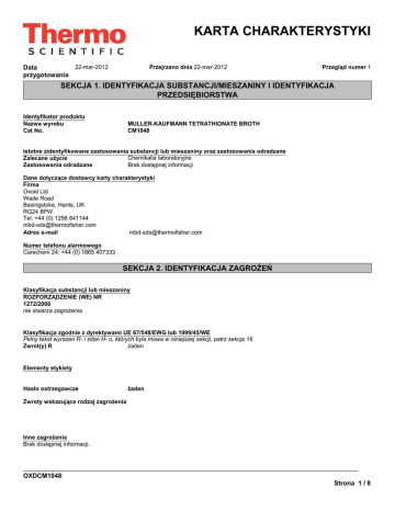 KARTA CHARAKTERYSTYKI 22-mar-2012 Data przygotowania Przejrzano dnia 22-mar-2012 Przegląd numer 1 SEKCJA 1. IDENTYFIKACJA SUBSTANCJI/MIESZANINY I IDENTYFIKACJA PRZEDSIĘBIORSTWA Identyfikator produktu Nazwa wyrobu Cat No. MULLER-KAUFMANN TETRATHIONATE BROTH CM1048 Istotne zidentyfikowane zastosowania substancji lub mieszaniny oraz zastosowania odradzane Chemikalia laboratoryjne Zalecane użycie Brak dostępnej informacji Zastosowania odradzane Dane dotyczące dostawcy karty charakterystyki Firma Oxoid Ltd Wade Road Basingstoke, Hants, UK RG24 8PW Tel: +44 (0) 1256 841144 [email protected] [email protected] Adres e-mail Numer telefonu alarmowego Carechem 24: +44 (0) 1865 407333 SEKCJA 2. IDENTYFIKACJA ZAGROŻEŃ Klasyfikacja substancji lub mieszaniny ROZPORZĄDZENIE (WE) NR 1272/2008 nie stwarza zagrożenia Klasyfikacja zgodnie z dyrektywami UE 67/548/EWG lub 1999/45/WE Pelny tekst wyrazen R- i zdan H- o, których byla mowa w niniejszej sekcji, patrz sekcja 16 żaden Zwrot(y) R Elementy etykiety Hasło ostrzegawcze żaden Zwroty wskazujące rodzaj zagrożenia Inne zagrożenia Brak dostępnej informacji. _____________________________________________________________________________________________ OXDCM1048 Strona 1 / 8 KARTA CHARAKTERYSTYKI Przejrzano dnia 22-mar-2012 MULLER-KAUFMANN TETRATHIONATE BROTH _____________________________________________________________________________________________ SEKCJA 3. SKŁAD/INFORMACJA O SKŁADNIKACH Składniki Nr WE. Procent wagowy Nr CAS 67/548/EEC klasyfikacji CLP klasyfikacji - rozporządzenia (WE) nr 1272/2008 - Nr REACH. Calcium carbonate 1317-65-3 Bile Salt Mixture NA EEC No. 215-279-6 48.46 1317-65-3 - - 2.58 NA Xi;R36/37/38 STOT SE 3 (H335) Skin Irrit. 2 (H315) Eye Irrit. 2 (H319) - C.I. Basic green 1 633-03-4 EEC No. 211-190-1 1.64 633-03-4 Xn; R22 Xi; R36 Eye Irrit. 2 (H319) Acute Tox. 4 (H302) - - Pelny tekst wyrazen R- i zdan H- o, których byla mowa w niniejszej sekcji, patrz sekcja 16 SEKCJA 4. ŚRODKI PIERWSZEJ POMOCY Opis środków pierwszej pomocy Kontakt z oczami Płukać starannie dużą ilością wody, również pod powiekami. Get medical attention if irritation persists.. Kontakt przez skórę Zmyć ciepłą wodą z mydłem. Uzyskać pomoc medyczną w przypadku pojawienia się i utrzymywania podrażnienia.. Połknięcie Przemyć usta wodą i następnie wypić dużą ilość wody. Uzyskać pomoc lekarską. Wdychanie Przenieść na świeże powietrze. Uzyskać pomoc medyczną w przypadku pojawienia się objawów.. Uwagi dla lekarza Leczenie objawowe SEKCJA 5. POSTĘPOWANIE W PRZYPADKU POŻARU Środki gaśnicze Stosowne środki gaśnicze Użycie środków gaśniczych odpowiednich dla lokalnych warunków i dla środowiska Środki gaśnicze, których nie wolno użyć ze względów bezpieczeństwa Use extinguishing method compatible with surroundings. _____________________________________________________________________________________________ OXDCM1048 Strona 2 / 8 KARTA CHARAKTERYSTYKI Przejrzano dnia 22-mar-2012 MULLER-KAUFMANN TETRATHIONATE BROTH _____________________________________________________________________________________________ Szczególne zagrożenia związane z substancją lub mieszaniną Rozkład termiczny może powodować wydzielanie drażniących gazów i par Informacje dla straży pożarnej Podobnie jak w przypadku innych pożarów, stosować odpowiedni izolujący aparat oddechowy i pełny ubiór ochronny SEKCJA 6. POSTĘPOWANIE W PRZYPADKU NIEZAMIERZONEGO UWOLNIENIA DO ŚRODOWISKA Indywidualne środki ostrożności, wyposażenie ochronne i procedury w sytuacjach kryzysowych Unikać tworzenia się pyłu. Unikać kontaktu ze skórą i oczami. Zapewnić wystarczającą wentylację. Środki ostrożności w zakresie ochrony środowiska Zapobiegać dalszemu wyciekowi lub rozlaniu jeżeli to bezpieczne Metody i materiały zapobiegające rozprzestrzenianiu się skażenia i służące do usuwania skażenia Zebrać próżniowo rozsypany materiał i zebrać w odpowiednim pojemniku do usunięcia. SEKCJA 7. POSTĘPOWANIE Z SUBSTANCJAMI I MIESZANINAMI ORAZ ICH MAGAZYNOWANIE Środki ostrożności dotyczące bezpiecznego obchodzenia się z substancjami i mieszaninami Zapewnić wystarczającą wentylację. Nie wdychać pyłu. Unikać kontaktu ze skórą i oczami. Warunki bezpiecznego magazynowania, łącznie z informacjami dotyczącymi wszelkich niezgodności Przechowywać pojemnik dokładnie zamknięty w suchym i dobrze wentylowanym miejscu. Chronić przed wilgocią. Szczególne zastosowanie(-a) końcowe SEKCJA 8. KONTROLA NARAŻENIA/ŚRODKI OCHRONY INDYWIDUALNEJ Parametry dotyczące kontroli Limity nateżeń Składniki Calcium carbonate Unia Europejska Wielka Brytania STEL: 30 mg/m3 15 min STEL: 12 mg/m3 15 min TWA: 10 mg/m3 8 hr TWA: 4 mg/m3 8 hr Francja Belgia TWA: 10 mg/m3 8 uren Hiszpania _____________________________________________________________________________________________ OXDCM1048 Strona 3 / 8 KARTA CHARAKTERYSTYKI Przejrzano dnia 22-mar-2012 MULLER-KAUFMANN TETRATHIONATE BROTH _____________________________________________________________________________________________ Składniki Calcium carbonate Austria Składniki Calcium carbonate Bułgaria TWA: 1.0 fiber/cm3 TWA: 10.0 mg/m3 Składniki Calcium carbonate Estonia TWA: 10 mg/m3 8 tundides. TWA: 5 mg/m3 8 tundides. respirable dust Gibraltar Składniki Calcium carbonate Russia - TWA Slovak Republic 10 Biologiczne wartosci graniczne Pochodny niepowodujący efektów poziom (DNEL) Przewidywane niepowodujące efektów stężenie (PNEC) Dania Szwajcaria MAK: 3 mg/m3 8 Stunden Polska Norwegia Cypr Republika Czeska TWA: 10.0 mg/m3 8 hodinách. dust Grecja TWA: 10 mg/m3 TWA: 5 mg/m3 Węgry TWA: 10 mg/m3 8 órában. Islandia Słowenia Szwecja Turcja Chorwacja Irlandia TWA: 4 mg/m3 8 TWA: 10 mg/m3 8 hr. satima. respirable dust total inhalable dust TWA: 10 mg/m3 8 TWA: 4 mg/m3 8 hr. satima. total dust respirable dust Niniejszy produkt, w stanie w jakim zostaje dostarczony, nie