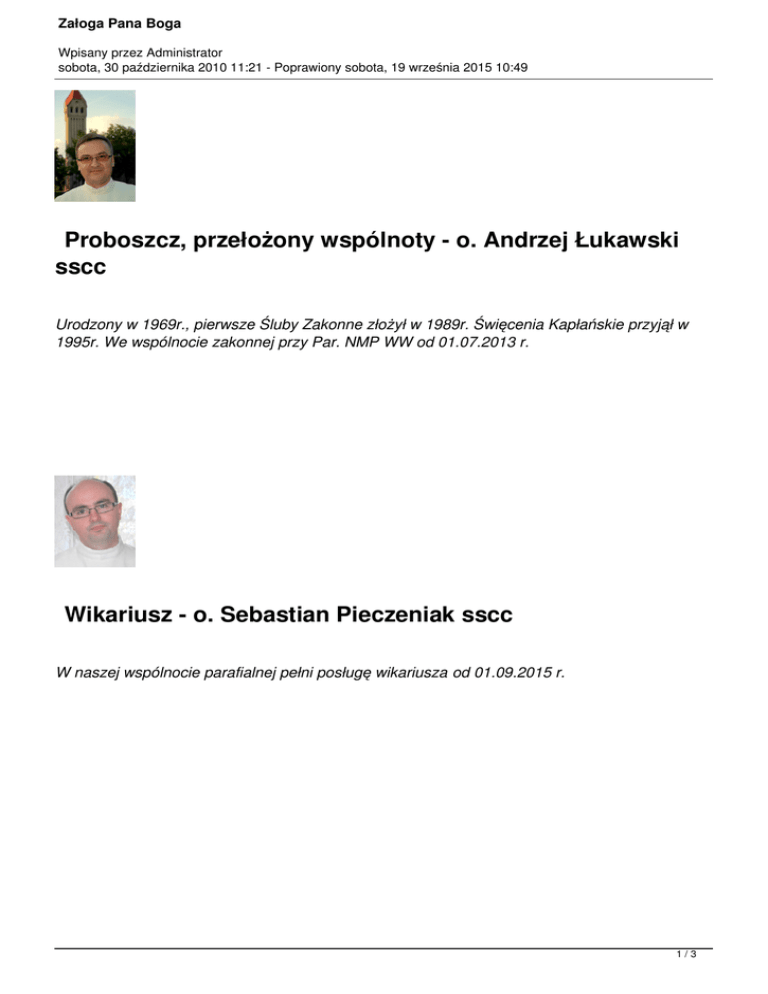 Załoga Pana Boga Wpisany przez Administrator sobota, 30 października 2010 11:21 - Poprawiony sobota, 19 września 2015 10:49 Proboszcz, przełożony wspólnoty - o. Andrzej Łukawski sscc Urodzony w 1969r., pierwsze Śluby Zakonne złożył w 1989r. Święcenia Kapłańskie przyjął w 1995r. We wspólnocie zakonnej przy Par. NMP WW od 01.07.2013 r. Wikariusz - o. Sebastian Pieczeniak sscc W naszej wspólnocie parafialnej pełni posługę wikariusza od 01.09.2015 r. 1/3 Załoga Pana Boga Wpisany przez Administrator sobota, 30 października 2010 11:21 - Poprawiony sobota, 19 września 2015 10:49 Wikariusz - o. Wojciech Bartnicki sscc Urodzony w 1985r., pierwsze Śluby Zakonne 2007 r. Święcenia Kapłańskie przyjął 2013 r. We wspólnocie zakonnej przy Par, NMP WW przebywa od 01.07.2013 r. Rezydent - o. Kazimierz Papciak sscc Urodzony w 1959r. Pierwsze Śluby Zakonne złożył w 1979r., a święcenia kapłańskie przyjął w 1985r. We wspólnocie zakonnej przy Par. NMP WW przebywa od dnia 1.01.2011r. 2/3 Załoga Pana Boga Wpisany przez Administrator sobota, 30 października 2010 11:21 - Poprawiony sobota, 19 września 2015 10:49 Sekretarka - p. Elżbieta Kołaczek W parafii pracuje od 2002 r. Opiekun terenu kościelnego - p. Mieczysław Piejko W parafii pracuje od 2009 r. Organista - p. Piotr Matuszewski W parafii pracuje od 2005 r. 3/3