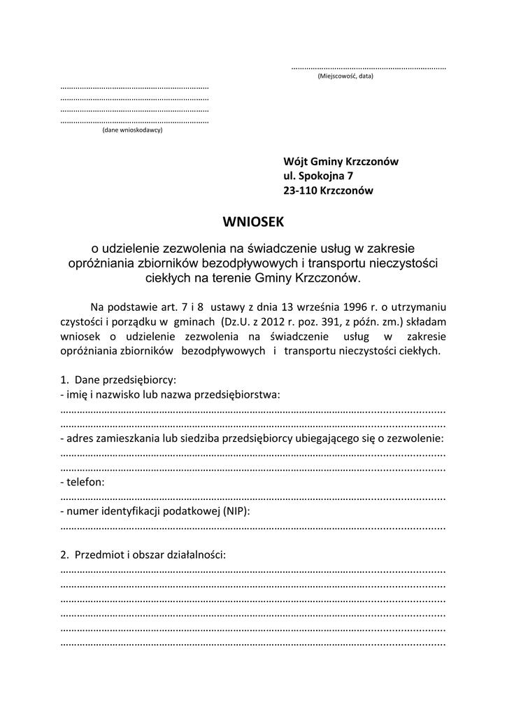 ……………………………………………………………… (Miejscowość, data) …………………………………………………………… …………………………………………………………… …………………………………………………………… …………………………………………………………… (dane wnioskodawcy) Wójt Gminy Krzczonów ul. Spokojna 7 23-110 Krzczonów WNIOSEK o udzielenie zezwolenia na świadczenie usług w zakresie opróżniania zbiorników bezodpływowych i transportu nieczystości ciekłych na terenie Gminy Krzczonów. Na podstawie art. 7 i 8 ustawy z dnia 13 września 1996 r. o utrzymaniu czystości i porządku w gminach (Dz.U. z 2012 r. poz. 391, z późn. zm.) składam wniosek o udzielenie zezwolenia na świadczenie usług w zakresie opróżniania zbiorników bezodpływowych i transportu nieczystości ciekłych. 1. Dane przedsiębiorcy: - imię i nazwisko lub nazwa przedsiębiorstwa: …………………………………………………………………………………………………........................... …………………………………………………………………………………………………........................... - adres zamieszkania lub siedziba przedsiębiorcy ubiegającego się o zezwolenie: …………………………………………………………………………………………………........................... …………………………………………………………………………………………………........................... - telefon: …………………………………………………………………………………………………........................... - numer identyfikacji podatkowej (NIP): …………………………………………………………………………………………………........................... 2. Przedmiot i obszar działalności: …………………………………………………………………………………………………........................... …………………………………………………………………………………………………........................... …………………………………………………………………………………………………........................... …………………………………………………………………………………………………........................... …………………………………………………………………………………………………........................... …………………………………………………………………………………………………........................... 3. Środki techniczne, jakimi dysponuje ubiegający się o zezwolenie na prowadzenie działalności objętej wnioskiem (wykaz sprzętu i środków technicznych, oraz jako załącznik ksero dowodów rejestracyjnych) …………………………………………………………………………………………………........................... …………………………………………………………………………………………………........................... …………………………………………………………………………………………………........................... …………………………………………………………………………………………………........................... …………………………………………………………………………………………………........................... 4. Informacje o technologiach stosowanych lub przewidzianych do stosowania przy świadczeniu usług w zakresie działalności objętej wnioskiem: …………………………………………………………………………………………………........................... …………………………………………………………………………………………………........................... …………………………………………………………………………………………………........................... …………………………………………………………………………………………………........................... …………………………………………………………………………………………………........................... …………………………………………………………………………………………………........................... 5. Proponowane zabiegi z zakresu ochrony środowiska i ochrony sanitarnej planowane po zakończeniu działalności: …………………………………………………………………………………………………........................... …………………………………………………………………………………………………........................... …………………………………………………………………………………………………........................... …………………………………………………………………………………………………........................... …………………………………………………………………………………………………........................... …………………………………………………………………………………………………........................... 6. Termin podjęcia działalności: …………………………………………………………………………………………………........................... 7. Zamierzony czas prowadzenia działalności: ……………………………………………………………………………………