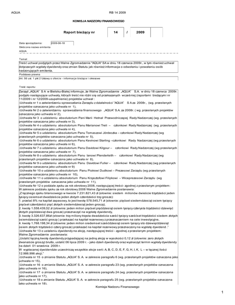AQUA RB 14 2009 KOMISJA NADZORU FINANSOWEGO Raport bieżący nr Data sporządzenia: 14 / 2009 2009-06-18 Skróc ona nazwa emitenta AQUA Temat Treść uchwał podjętych przez Walne Zgromadzenie "AQUA" SA w dniu 18 czerwca 2009r., w tym również uchwał dotyczacych wypłaty dywidendy oraz zmian Statutu jak również informacja o odwołaniu i powałaniu osób nadzorujących emitenta. Podstawa prawna Art. 56 ust. 1 pkt 2 Ustawy o oferc ie - informac je bieżąc e i okresowe Treść raportu: Zarząd „AQUA” S A w Bielsku-Białej informuje, że Walne Zgromadzenie „AQUA” S.A. w dniu 18 czerwca 2009r. podjęło następujące uchwały, których treść nie różni się od przekazanych wcześniej (raportami bieżącymi nr 11/2009 i nr 12/2009-uzupełnienie) projektów uchwał : -Uchwała nr 1 o zatwierdzeniu sprawozdania Zarządu z działalności ”AQUA” S A za 2008r., (wg. przesłanych projektów oznaczona jako uchwała nr 1), -Uchwała Nr 2 o zatwierdzeniu sprawozdania finansowego „AQUA” S.A. za 2008r. ( wg. przesłanych projektów oznaczona jako uchwała nr 2), -Uchwała Nr 3 o udzieleniu absolutorium Pani Marii Hetnał Przewodniczącej Rady Nadzorczej (wg. przesłanych projektów oznaczona jako uchwała nr 3), -Uchwała Nr 4 o udzieleniu absolutorium Panu Marianowi Treli – członkowi Rady Nadzorczej (wg. przesłanych projektów oznaczona jako uchwała nr 4), -Uchwała Nr 5 o udzieleniu absolutorium Panu Tomaszowi Jórdeczka – członkowi Rady Nadzorczej (wg przesłanych projektów oznaczona jako uchwała nr 5), -Uchwała Nr 6 o udzieleniu absolutorium Panu Kevinowi Starling –członkowi Rady Nadzorczej (wg przesłanych projektów oznaczona jako uchwała nr 6), -Uchwała Nr 7 o udzieleniu absolutorium Panu Davidowi Kilgour – członkowi Rady Nadzorczej (wg przesłanych projektów oznaczona jako uchwała nr 7), -Uchwała Nr 8 o udzieleniu absolutorium Panu Ianowi Plenderleith – członkowi Rady Nadzorczej (wg przesłanych projektów oznaczona jako uchwała nr 8), -Uchwała Nr 9 o udzieleniu absolutorium Panu Davidowi Fuller – członkowi Rady Nadzorczej (wg przesłanych projektów oznaczona jako uchwała nr 9) -Uchwała Nr 10 o udzieleniu absolutorium Panu Piotrowi Dudkowi – Prezesowi Zarządu (wg przesłanych projektów oznaczona jako uchwała nr 10), -Uchwała Nr 11 o udzieleniu absolutorium Panu Krzysztofowi Filipkowi – Wiceprezesowi Zarządu (wg przesłanych projektów oznaczona jako uchwała nr 11), -Uchwała Nr 12 o podziale zysku za rok obrotowy 2008, następującej treści- zgodnej z przesłanym projektem: W zakresie podziału zysku za rok obrotowy 2008 Walne Zgromadzenie postanawia: „Z łącznego zysku bilansowego w kwocie 7.231.821,43 zł (słownie: siedem milionów dwieście trzydzieści jeden tysięcy osiemset dwadzieścia jeden złotych czterdzieści trzy grosze): 1. przelać 8% na kapitał zapasowy, to jest kwotę 578.545,71 zł (słownie: pięćset siedemdziesiąt osiem tysięcy pięćset czterdzieści pięć złotych siedemdziesiąt jeden groszy), 2. kwotę 1.558.439,52 zł (słownie: jeden milion pięćset pięćdziesiąt osiem tysięcy czterysta trzydzieści dziewięć złotych pięćdziesiąt dwa grosze) przeznaczyć na wypłatę dywidendy, 3. kwotę 3.326.637,86zł (słownie: trzy miliony trzysta dwadzieścia sześć tysięcy sześćset trzydzieści siedem złotych osiemdziesiąt sześć groszy ) przekazać na kapitał rezerwowy z przeznaczeniem na cele inwestycyjne, 4. kwotę 1.768.198,34 zł (słownie: jeden milion siedemset sześćdziesiąt osiem tysięcy sto dziewięćdziesiąt osiem złotych trzydzieści cztery grosze) przekazać na kapitał rezerwowy przeznaczony na wypłatę dywidend .” -Uchwała Nr 13 o ustaleniu dywidendy na akcję, następującej treści - zgodnej z przesłanym projektem: Walne Zgromadzenie postanawia: „Ustalić łączną kwotę dywidendy przypadającej na jedną akcję w wysokości 0,12 zł (słownie: zero złotych dwanaście groszy) brutto, ustalić 06 lipca 2009 r. - jako dzień dywidendy oraz wyznaczyć termin wypłaty dywidendy na dzień 01 września 2009 r. W wypłacanej dywidendzie uczestniczą wszystkie akcje serii: A, B, C, D, E, F, G, H, I, K, L – w łącznej ilości 12.986.996 akcji.” -Uchwała nr 15 o zmianie Statutu „AQUA” S. A. w zakresie paragrafu 6 (wg. przesłanych projektów oznaczona jako uchwała nr 15), -Uchwała nr 16 o zmianie Statutu „AQUA” S. A. w zakresie paragrafu 23 (wg. przesłanych projektów oznaczona jako uchwała nr 16), -Uchwała nr 17 o zmianie Statutu „AQUA” S. A. w zakresie paragrafu 24 (wg. przesłanych projektów oznaczona jako uchwała nr 17), -Uchwała nr 18 o zmianie Statutu „AQUA” S. A. w zakresie paragrafu 25 (wg. przesłanych projektów oznaczona jako uchwała nr 18), Komisja Nadzoru Finansowego 1 AQUA RB 14 2009 jako uchwała nr 18), -Uchwała Nr 22 o odwołaniu członka Rady Nadzorczej – Davida Fullera (wg przesłanych projektów oznaczona jako uchwała nr 22). Walne Zgromadzenie podjęło również uchwałę oznaczoną nr 14 , której treść różni się od przesłanego projektu (wg przesłanych projektów oznaczona nr 14): Uchwała Nr 14 Walne Zgromadzenie, działając w oparciu o przepisy Ustawy z dnia 3 marca 2000r. o wynagradzaniu osób kierujących niektórymi podmiotami prawnymi oraz zgodnie z Zarządzeniem nr ON –0151/945/04/RG Prezydenta Miasta Bielska-Białej z dnia 7 czerwca 2004r. w sprawie szczegółowych zasad i trybu przyznawania nagrody rocznej osobom kierującym niektórymi podmiotami prawnymi oraz wzoru wniosku o przyznanie nagrody rocznej, postanawia przyznać Piotrowi Dudkowi - Prezesowi Zarządu „AQUA” S A, nagrodę roczną w wysokości dwukrotności jego przeciętnego miesięcznego wynagrodzenia brutto w 2008r. Równocześnie Zarząd „AQUA” S.A. informuje, że celem uzupełnienia składu Rady Nadzorczej Walne Zgromadzenie „AQUA” S.A. podjęło uchwały nr 19, 20, 21 i 23 (według przesłanych projektów oznaczone