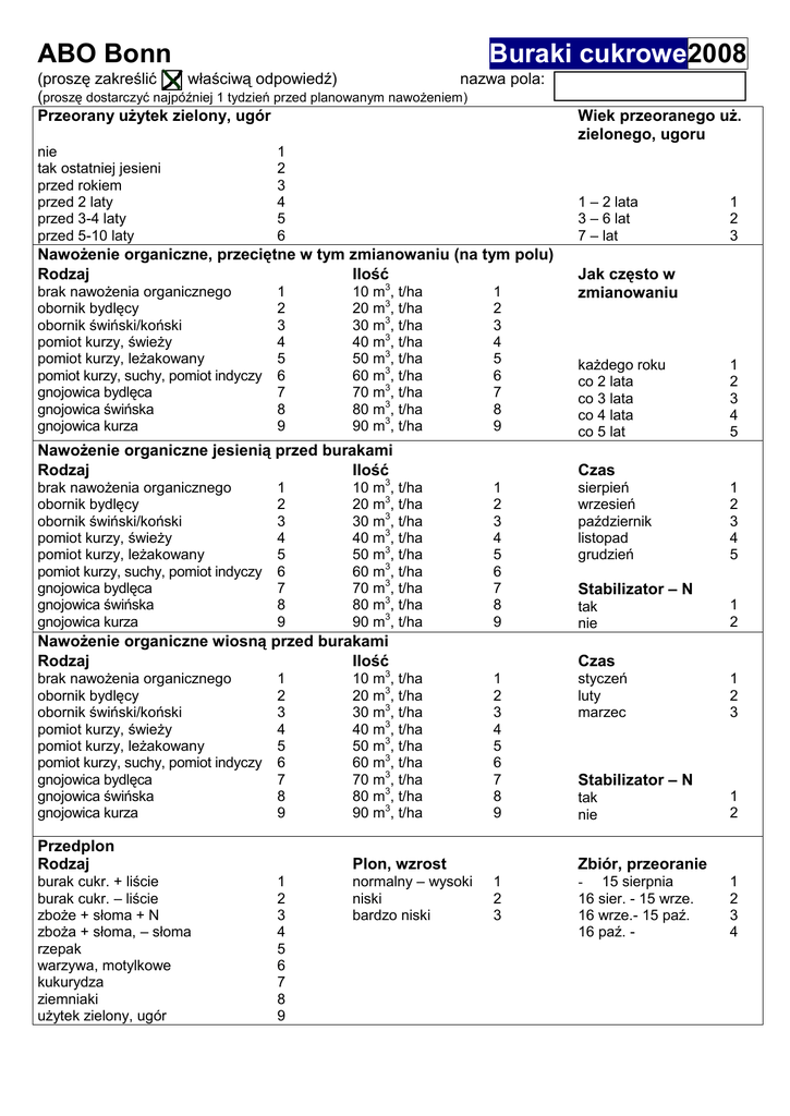 ABO Bonn Buraki cukrowe2008 (proszę zakreślić właściwą odpowiedź) nazwa pola: (proszę dostarczyć najpóźniej 1 tydzień przed planowanym nawożeniem) Przeorany użytek zielony, ugór nie tak ostatniej jesieni przed rokiem przed 2 laty przed 3-4 laty przed 5-10 laty 1 2 3 4 5 6 1 – 2 lata 3 – 6 lat 7 – lat Nawożenie organiczne, przeciętne w tym zmianowaniu (na tym polu) Rodzaj Ilość brak nawożenia organicznego obornik bydlęcy obornik świński/koński pomiot kurzy, świeży pomiot kurzy, leżakowany pomiot kurzy, suchy, pomiot indyczy gnojowica bydlęca gnojowica świńska gnojowica kurza 1 2 3 4 5 6 7 8 9 10 m3, t/ha 20 m3, t/ha 30 m3, t/ha 40 m3, t/ha 50 m3, t/ha 60 m3, t/ha 70 m3, t/ha 80 m3, t/ha 90 m3, t/ha 1 2 3 4 5 6 7 8 9 Nawożenie organiczne jesienią przed burakami Rodzaj Ilość brak nawożenia organicznego obornik bydlęcy obornik świński/koński pomiot kurzy, świeży pomiot kurzy, leżakowany pomiot kurzy, suchy, pomiot indyczy gnojowica bydlęca gnojowica świńska gnojowica kurza 1 2 3 4 5 6 7 8 9 10 m3, t/ha 20 m3, t/ha 30 m3, t/ha 40 m3, t/ha 50 m3, t/ha 60 m3, t/ha 70 m3, t/ha 80 m3, t/ha 90 m3, t/ha 1 2 3 4 5 6 7 8 9 Przedplon Rodzaj burak cukr. + liście burak cukr. – liście zboże + słoma + N zboża + słoma, – słoma rzepak warzywa, motylkowe kukurydza ziemniaki użytek zielony, ugór 10 m3, t/ha 20 m3, t/ha 30 m3, t/ha 40 m3, t/ha 50 m3, t/ha 60 m3, t/ha 70 m3, t/ha 80 m3, t/ha 90 m3, t/ha normalny – wysoki niski bardzo niski Jak często w zmianowaniu każdego roku co 2 lata co 3 lata co 4 lata co 5 lat 1 2 3 4 5 sierpień wrzesień październik listopad grudzień 1 2 3 4 5 Stabilizator – N tak nie 1 2 Czas 1 2 3 4 5 6 7 8 9 styczeń luty marzec 1 2 3 Stabilizator – N tak nie 1 2 Zbiór, przeoranie Plon, wzrost 1 2 3 4 5 6 7 8 9 1 2 3 Czas 1 2 3 4 5 6 7 8 9 Nawożenie organiczne wiosną przed burakami Rodzaj Ilość brak nawożenia organicznego obornik bydlęcy obornik świński/koński pomiot kurzy, świeży pomiot kurzy, leżakowany pomiot kurzy, suchy, pomiot indyczy gnojowica bydlęca gnojowica świńska gnojowica kurza Wiek przeoranego uż. zielonego, ugoru 1 2 3 - 15 sierpnia 16 sier. - 15 wrze. 16 wrze.- 15 paź. 16 paź. - 1 2 3 4 Międzyplon przed burakami (ewentualnie ugór późną jesienią lub zimą) Rodzaj Rozwój Zagospodarowanie żaden motylkowe inny międzyplon przeorany zwieziony 1 2 3 1 2 3 4 5 Planowany zbiór wrzesień październik listopad 1 2 3 Zaw. próchnicy Rodzaj gleby bardzo słaba słaba średnia ciężka bardzo ciężka słaby-normalny silny bardzo silny Opady 1.10.-31.01. 1 2 3 4 5 0,7 % 0,8 – 1,5 % 1,6 – 2,5 % 2,6 – 4,0 % 4,1 – % Oczek.zaw.cukru 1 2 3 - 15,0 % 15,1 - 15,5% 15,6 - 16,0% 16,1 - 16,5% 16,6 - 17,0% 17,1 - 17,5% 17,6 - 18,0% 18,1 - 18,5% 18,6 % Początek wegetacji (średnia temperatura dnia > 5o C) 1 2 - 180 mm małe 181-240 mm normal. 241-300 mm duże 301- mm bardzo duże 1 2 3 4 Oczekiwany plon 1 2 3 4 5 6 7 8 9 400 dt/ha 401 – 450 dt/ha 451 – 500 dt/ha 501 – 550 dt/ha 551 – 600 dt/ha 601 – 650 dt/ha 651 – 700 dt/ha 701 dt/ha 1 2 3 4 5 6 7 8 28 luty 1 marz. – 10 marz. 11 marz.- 20 marz. 21 marz.- 30marz. 1 kwie. - 1 2 3 4 5 - Wysiany azot (inne źródła azotu) na słomę (w przel.na czysty N) pod międzyplon wraz z wapnem wraz z błotem z osadników wraz z kompostem pozostałe ___ ___ ___ ___ ___ ___ ___ ___ ___ ___ ___ ___ ___ ___ ___ ___ ___ ___ kg N/ha kg N/ha kg N/ha kg N/ha kg N/ha kg N/ha } razem kgN/ha (bez N „na słomę”) Nr plantatora: Nazwisko plantatora: Adres: tel: fax: e-mail: Uwagi: …………………………………………………………………………………………… ……………………………………………………………………………………………………. ……………………………………………………………………………………………………. …………………………………………………………………………………………………….