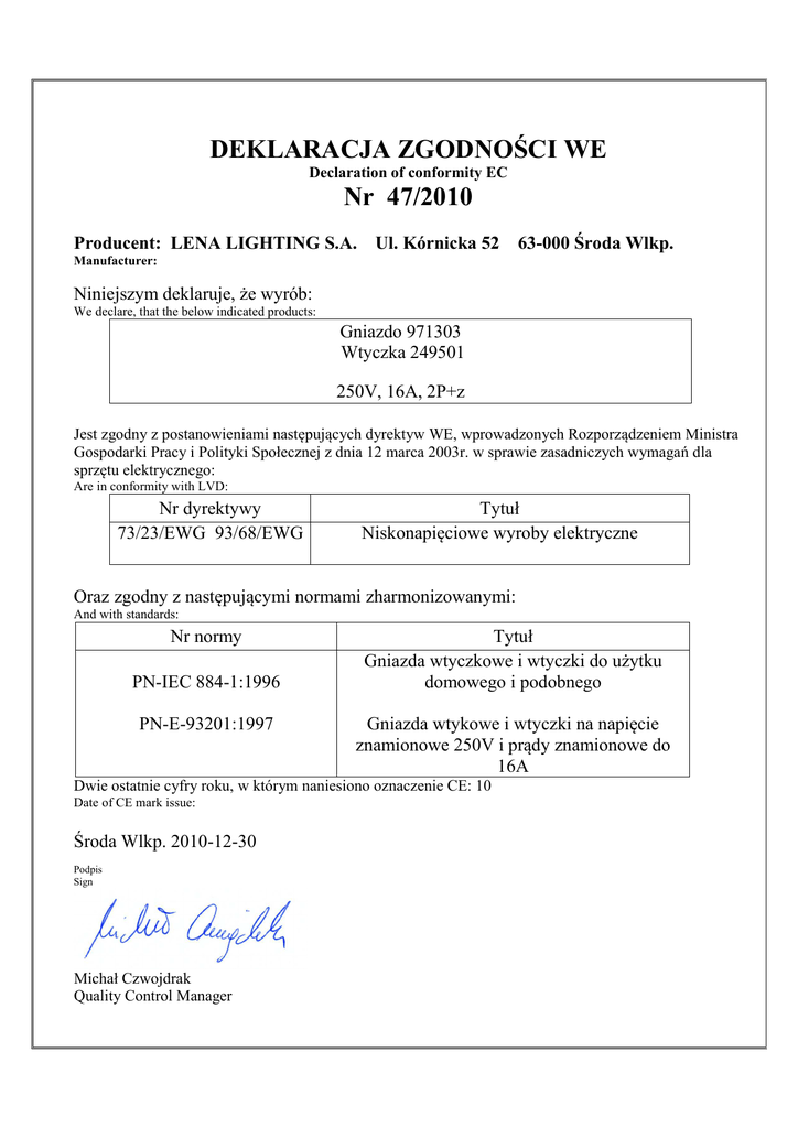 DEKLARACJA ZGODNOŚCI WE Declaration of conformity EC Nr 47/2010 Producent: LENA LIGHTING S.A. Ul. Kórnicka 52 63-000 Środa Wlkp. Manufacturer: Niniejszym deklaruje, że wyrób: We declare, that the below indicated products: Gniazdo 971303 Wtyczka 249501 250V, 16A, 2P+z Jest zgodny z postanowieniami następujących dyrektyw WE, wprowadzonych Rozporządzeniem Ministra Gospodarki Pracy i Polityki Społecznej z dnia 12 marca 2003r. w sprawie zasadniczych wymagań dla sprzętu elektrycznego: Are in conformity with LVD: Nr dyrektywy 73/23/EWG 93/68/EWG Tytuł Niskonapięciowe wyroby elektryczne Oraz zgodny z następującymi normami zharmonizowanymi: And with standards: Nr normy PN-IEC 884-1:1996 PN-E-93201:1997 Tytuł Gniazda wtyczkowe i wtyczki do użytku domowego i podobnego Gniazda wtykowe i wtyczki na napięcie znamionowe 250V i prądy znamionowe do 16A Dwie ostatnie cyfry roku, w którym naniesiono oznaczenie CE: 10 Date of CE mark issue: Środa Wlkp. 2010-12-30 Podpis Sign Michał Czwojdrak Quality Control Manager