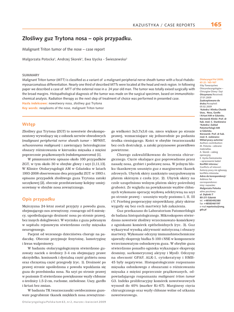 KAZUISTYKA / CASE REPORTS 165 Złośliwy guz Trytona nosa – opis przypadku. Malignant Triton tumor of the nose – case report Małgorzata Potocka¹, Andrzej Skorek¹, Ewa Iżycka - Świeszewska² SUMMARY Malignant Triton tumor (MTT) is classified as a variant of a malignant peripherial nerve sheath tumor with a focal rhabdomyosarcomatous differentiation. Nearly one third of described MTTs were located at the head and neck region. In following paper we described a case of MTT of the external nose in a 24 year old man. The tumor was totally exised surgically with the broad margins. Histopathological diagnosis of the tumor was made on the surgical specimen, based on immunohistochemical analysis. Radiation therapy as the next step of treatment of choice was performed in presented case. Hasła indeksowe: nowotwory nosa, złośliwy guz Trytona Key words: neoplasms of the nose, malignant Triton tumor Wstęp Złośliwy guz Trytona (ZGT) to nowotwór dwukomponentowy wywodzący się z osłonek nerwów obwodowych (malignant peripherial nerve sheath tumor – MPNST, schwannoma malignum) i zawierający heterologiczne obszary różnicowania w kierunku mięsaka z mięśni poprzecznie prążkowanych (rabdomyosarcoma) [1]. W piśmiennictwie opisano około 100 przypadków ZGT, w tym około 30 w obrębie głowy i szyi [1,11,13]. W Klinice Otolaryngologii AM w Gdańsku w latach 1993-2008 obserwowano dwa przypadki ZGT: w 1993 r. opisano przypadek złośliwego guza Trytona zatoki szczękowej [2], obecnie przedstawiamy kolejny umiejscowiony w obrębie nosa zewnętrznego. Opis przypadku Mężczyzna 24-letni został przyjęty z powodu guza, obejmującego nos zewnętrzny, rosnącego od 6 miesięcy, upośledzającego drożność nosa po stronie prawej, bez innych dolegliwości. W wycinku z guza pobranym w szpitalu rejonowym stwierdzono cechy mięsaka neurogennego. Pacjent od wczesnego dzieciństwa choruje na padaczkę. Obecnie przyjmuje fenytoinę, lamotryginę i kwas walproinowy. W badaniu otolaryngologicznym stwierdzono guzowaty naciek o średnicy 3-4 cm obejmujący prawe skrzydełko, koniuszek i dystalną część grzbietu nosa oraz chrzęstną część przegrody (ryc. 1). Drożność po prawej stronie upośledzona z powodu wpuklania się guza do przedsionka nosa. Na szyi po stronie prawej w poziomie II stwierdzono powiększone węzły chłonne o średnicy 1,5-2 cm, ruchome, niebolesne. Uszy, gardło i krtań bez zmian. W badaniu TK twarzoczaszki uwidoczniono guzowate pogrubienie tkanek miękkich nosa zewnętrzneOtolar yngologia Polska tom 63, nr 2, mar zec – k wiecień 20 0 9 go wielkości 3x3,7x3,6 cm, nieco większe po stronie prawej, wzmacniające się jednorodnie po podaniu środka cieniującego. Kości w obrębie twarzoczaszki bez cech destrukcji, a zatoki przynosowe prawidłowo powietrzne. Chorego zakwalifikowano do leczenia chirurgicznego. Cięcie okalające guz poprowadzono przez nasadę nosa, grzbiet i podstawę nosa. W jednym bloku tkankowym usunięto guz z marginesem tkanek zdrowych. Ubytek skóry zamknięto uszypułowanym płatem skórnym z czoła (ryc. 2). Ubytek skóry na czole uzupełniono wolnym płatem skóry pośredniej grubości. Ze względu na powiększenie węzłów chłonnych wykonano operację węzłową selektywną na szyi po stronie prawej – usunięto węzły poziomu I, II, III i V. Przebieg pooperacyjny niepowikłany, płaty skórne wygoiły się bez cech martwicy lub zakażenia. Guz przekazano do Laboratorium Patomorfologii do badana histopatologicznego. Mikroskopowo stwierdzono nowotwór złośliwy wrzecionowato-komórkowy z ogniskami komórek epithelioidnych (ryc. 3). Guz wykazywał wysoką aktywność mitotyczną i obszary martwicy. Wykonane odczyny immunohistochemiczne ujawniły ekspresję białka S-100 i NSE w komponencie wrzecionowatym-osłonkowym guza. W obrębie guza stwierdzono ponadto ogniska wykazujące ekspresję desminy, sarkomerycznej aktyny i MyoD. Odczyny na obecność GFAP, ALK-1, cytokeratyny i HMB45 były negatywne. Histopatologicznie rozpoznano mięsaka osłonkowego z obszarami o różnicowaniu mięsaka z mięśni poprzecznie prążkowanych, odpowiadającego rozpoznaniu malignant triton tumor G3. Indeks proliferacyjny komórek nowotworowych wynosił do 40% (marker Ki-67). Marginesy cięcia chirurgicznego oraz węzły chłonne wolne od utkania nowotworowego. Otolaryngol Pol 2009; 63 (2): 165-167 ©by Towarzystwo Otorynolaryngologów – Chirurgów Głowy i Szyi Otrzymano/Received: 27.01.2009 Zaakceptowano do druku/Accepted: 05.02.2009 ¹Katedra i Klinika Chorób Uszu, Nosa, Gardła i Krtani AM w Gdańsku. Kierownik Kliniki: Prof. dr hab. med. C. Stankiewicz ²Katedra i Zakład Patomorfologii AM w Gdańsku. Kierownik: Prof. dr hab. med. K. Jaśkiewicz Wkład pracy autorów/ Authors contribution: M. Potocka – zebranie materiałów. A. Skorek – zabieg operacyjny. E. Iżycka-Świeszewska – opracowanie badań Konflikt interesu/ Conflicts of interest: Autorzy pracy nie zgłaszają konfliktu interesów. Adres do korespondencji/ Address for correspondence: imię i nazwisko: Małgorzata Potocka adres pocztowy: ul. Dębinki 7 80-211 Gdańsk tel. +48583492380 fax +48583461197 e-mail mpotocka@omg. gda.pl 166 KAZU ISTYKA / CASE REPORTS zostaje w stanie ogólnym dobrym bez cech wznowy nowotworu. Omówienie Ryc. 1. Ryc. 2. Ryc. 3. Wrzecionowatokomórkowy nowotwór o ukladzie pasmowatym i wiązkowym z obszarem komórek epithelioidnych (HE, x200). Chory został zakwalifikowany do uzupełniającej radioterapii, otrzymał dawkę napromieniania 66 Gy na okolicę twarzoczaszki, 20 Gy na obszar węzłow chłonnych szyi oraz 55 Gy na obszar węzłów chłonnych nadobojczykowych. Po 6 miesiącach od operacji i 3 miesiące od zakończenia radioterapii pacjent po- Najczęstszymi nowotworami złośliwymi nosa zewnętrznego są raki płaskonabłonkowe i podstawnokomórkowe. Mięsaki w tej okolicy należą do rzadkości. W dostępnym piśmiennictwie nie znaleziono opisu złośliwe
