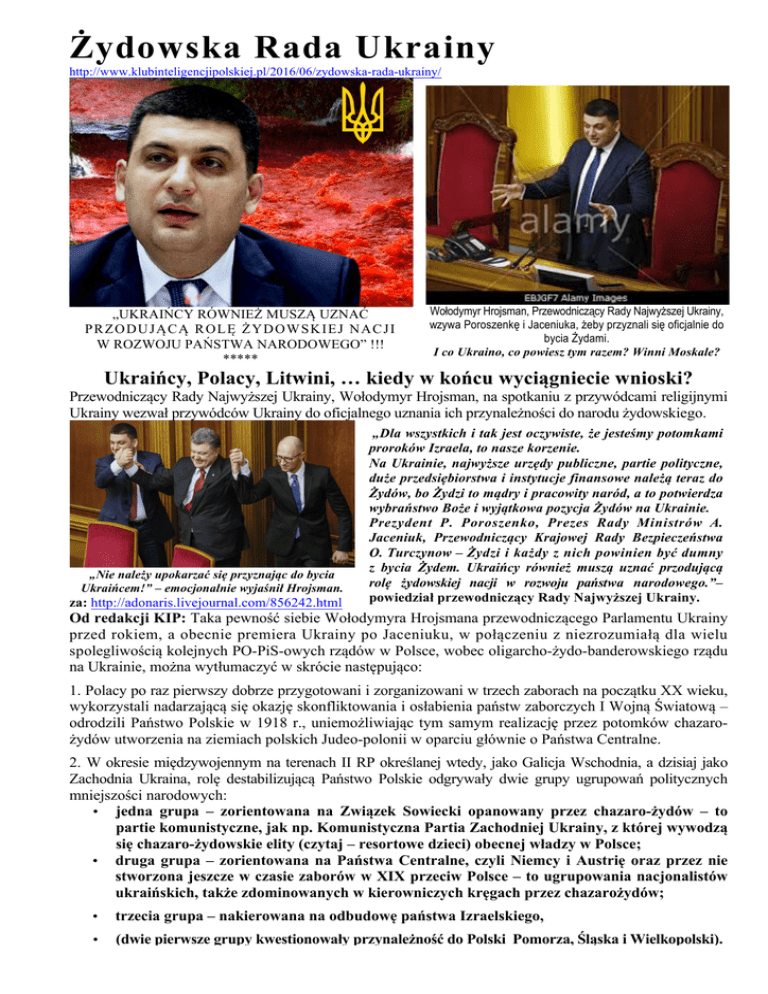 Żydowska Rada Ukrainy http://www.klubinteligencjipolskiej.pl/2016/06/zydowska-rada-ukrainy/ „UKRAIŃCY RÓWNIEŻ MUSZĄ UZNAĆ P R Z O D U JĄ C Ą R O L Ę Ż Y D O W S K IE J N A C JI W ROZWOJU PAŃSTWA NARODOWEGO” !!! ***** Wołodymyr Hrojsman, Przewodniczący Rady Najwyższej Ukrainy, wzywa Poroszenkę i Jaceniuka, żeby przyznali się oficjalnie do bycia Żydami. I co Ukraino, co powiesz tym razem? Winni Moskale? Ukraińcy, Polacy, Litwini, … kiedy w końcu wyciągniecie wnioski? Przewodniczący Rady Najwyższej Ukrainy, Wołodymyr Hrojsman, na spotkaniu z przywódcami religijnymi Ukrainy wezwał przywódców Ukrainy do oficjalnego uznania ich przynależności do narodu żydowskiego. „Nie należy upokarzać się przyznając do bycia Ukraińcem!” – emocjonalnie wyjaśnił Hrojsman. za: http://adonaris.livejournal.com/856242.html „Dla wszystkich i tak jest oczywiste, że jesteśmy potomkami proroków Izraela, to nasze korzenie. Na Ukrainie, najwyższe urzędy publiczne, partie polityczne, duże przedsiębiorstwa i instytucje finansowe należą teraz do Żydów, bo Żydzi to mądry i pracowity naród, a to potwierdza wybraństwo Boże i wyjątkowa pozycja Żydów na Ukrainie. Prezydent P. Poroszenko, Prezes Rady Ministrów A. Jaceniuk, Przewodniczący Krajowej Rady Bezpieczeństwa O. Turczynow – Żydzi i każdy z nich powinien być dumny z bycia Żydem. Ukraińcy również muszą uznać przodującą rolę żydowskiej nacji w rozwoju państwa narodowego.”– powiedział przewodniczący Rady Najwyższej Ukrainy. Od redakcji KIP: Taka pewność siebie Wołodymyra Hrojsmana przewodniczącego Parlamentu Ukrainy przed rokiem, a obecnie premiera Ukrainy po Jaceniuku, w połączeniu z niezrozumiałą dla wielu spolegliwością kolejnych PO-PiS-owych rządów w Polsce, wobec oligarcho-żydo-banderowskiego rządu na Ukrainie, można wytłumaczyć w skrócie następująco: 1. Polacy po raz pierwszy dobrze przygotowani i zorganizowani w trzech zaborach na początku XX wieku, wykorzystali nadarzającą się okazję skonfliktowania i osłabienia państw zaborczych I Wojną Światową – odrodzili Państwo Polskie w 1918 r., uniemożliwiając tym samym realizację przez potomków chazarożydów utworzenia na ziemiach polskich Judeo-polonii w oparciu głównie o Państwa Centralne. 2. W okresie międzywojennym na terenach II RP określanej wtedy, jako Galicja Wschodnia, a dzisiaj jako Zachodnia Ukraina, rolę destabilizującą Państwo Polskie odgrywały dwie grupy ugrupowań politycznych mniejszości narodowych: • jedna grupa – zorientowana na Związek Sowiecki opanowany przez chazaro-żydów – to partie komunistyczne, jak np. Komunistyczna Partia Zachodniej Ukrainy, z której wywodzą się chazaro-żydowskie elity (czytaj – resortowe dzieci) obecnej władzy w Polsce; • druga grupa – zorientowana na Państwa Centralne, czyli Niemcy i Austrię oraz przez nie stworzona jeszcze w czasie zaborów w XIX przeciw Polsce – to ugrupowania nacjonalistów ukraińskich, także zdominowanych w kierowniczych kręgach przez chazarożydów; • trzecia grupa – nakierowana na odbudowę państwa Izraelskiego, • (dwie pierwsze grupy kwestionowały przynależność do Polski Pomorza, Śląska i Wielkopolski). 3. Zarówno I jak II Wojna światowa była kontynuacją wielowiekowej strategii tajnych, judeosatanistycznych organizacji Zachodu, do podbicia Słowiańszczyzny, w tym największego kraju Słowian Rosji, z wykorzystaniem, także wewnętrznego skonfliktowania krajów słowiańskich, co często się udawało. Zachód skolonizował wszystkie kontynenty przez kilka wieków. Natomiast nie udało się to z Rosją, (wyniku między innymi konfliktu Bolszewików z Mienszewikami) chociaż udało się to z dużym krajem, jakim była Polska przedrozbiorowa, dzięki skłóceniu z Rosją i wewnętrznej robocie rozkładowej lóż żydomasońskich. 4. Ważną przeszkodą kolonizacji Słowian, w tym Rosji, stanowiła Polska, stąd wielowiekowa polityka tych organizacji Zachodu zorientowana była na fizyczne unicestwienie Słowian, w tym zwłaszcza Polaków/Lechitów. Takimi zaplanowanymi przedsięwzięciami ludobójstwa Słowian była I, a zwłaszcza II Wojna Światowa i Październikowa Rewolucja Chazaro-żydowska w Rosji. W planach Hitlera – realizowanych na polecenie tych tajnych organizacji – była eksterminacja narodów słowiańskich: od 50% samych Rosjan do 85% Polaków/Lechitów. Tego planu nie udało się na szczęście zrealizować w pełni, a jedynie w części. Według szacunków Trybunału Zbrodni Wojennych w Norymberdze, które są najbliższe prawdy, w II Wojnie Światowej wymordowano 1/3 obywateli II RP. Łącznie w II Wojnie Światowej i od Rewolucji Chazaro-żydowskiej w 1917 r. do 1989 r. wymordowano 80-100 milionów Słowian, według dobrze udokumentowanych obliczeń rosyjskich historyków, z udziałem polskich historyków zamieszkałych w Rosji. A więc Holokaust miał dotyczyć Słowian, a nie żydów, zmiana kierunku nastąpiła na przełomie 1941/1942 którego ofiarą padło 6 milionów pomordowanych (ta liczba funkcjonowała po I Wojnie Światowej ) jest niewspółmierna do ludobójstwa Słowian, a ponadto ujawniane są kolejne dowody to, że ta liczba została 3-4 krotnie zawyżona m.in. kilkakrotnym liczeniem tych samych zabitych. Po za tym elita władzy III Rzeszy składała się w dużej części z osób pochodzenia żydowskiego, a w Wermachcie służyło ich co najmniej 150 tysięcy, a główny realizator Holocaustu Eichman był żydem urodzonym w Palestynie w żydowskiej rodzinie. 5. Chazaro-żydzi mają jakąś niewytłumaczalną od dziesiątków, jeśli nie setek lat miłość do Niemców, co szczególnie było widoczne w czasie II Wojny i także po niej, a jednocześnie nienawidzą Polaków, mimo, że mieszkają w Polsce od wieków, (co potwierdza w zapisach swoim dzienniku z getta Profesor Hirszfeld, jego mieszkaniec uratowany przez księdza uważanego za a