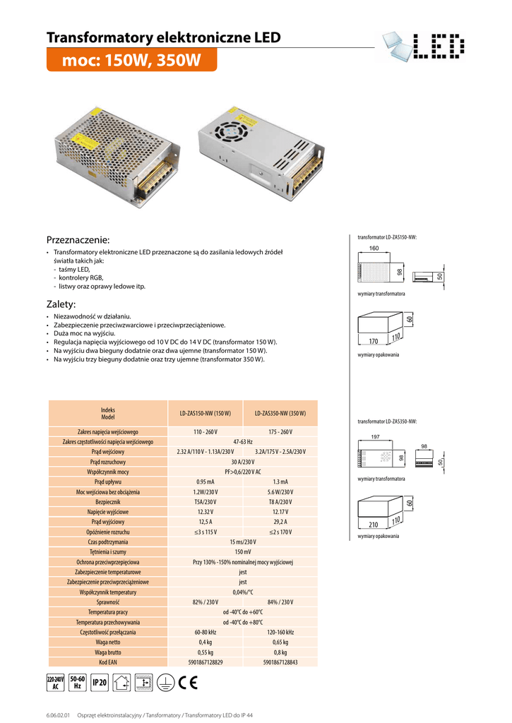 Transformatory elektroniczne LED moc: 150W, 350W transformator LD-ZAS150-NW: 160 50 + Transformatory elektroniczne LED przeznaczone są do zasilania ledowych źródeł światła takich jak: - taśmy LED, - kontrolery RGB, - listwy oraz oprawy ledowe itp. 1 2 3 4 5 6 7 • 98 Przeznaczenie: - wymiary transformatora Niezawodność w działaniu. Zabezpieczenie przeciwzwarciowe i przeciwprzeciążeniowe. Duża moc na wyjściu. Regulacja napięcia wyjściowego od 10 V DC do 14 V DC (transformator 150 W). Na wyjściu dwa bieguny dodatnie oraz dwa ujemne (transformator 150 W). Na wyjściu trzy bieguny dodatnie oraz trzy ujemne (transformator 350 W). Indeks Model LD-ZAS150-NW (150 W) LD-ZAS350-NW (350 W) Zakres napięcia wejściowego Zakres częstotliwości napięcia wejściowego Prąd wejściowy Prąd rozruchowy Współczynnik mocy Prąd upływu Moc wejściowa bez obciążenia Bezpiecznik Napięcie wyjściowe Prąd wyjściowy Opóźnienie rozruchu Czas podtrzymania Tętnienia i szumy Ochrona przeciwprzepięciowa Zabezpieczenie temperaturowe Zabezpieczenie przeciwprzeciążeniowe Współczynnik temperatury Sprawność Temperatura pracy Temperatura przechowywania Częstotliwość przełączania Waga netto Waga brutto Kod EAN 110 - 260 V 175 - 260 V 110 wymiary opakowania transformator LD-ZAS350-NW: IP 20 6.06.02.01 Osprzęt elektroinstalacyjny / Tansformatory / Transformatory LED do IP 44 197 98 wymiary transformatora 210 110 wymiary opakowania 50 98 2 3 4 5 6 7 8 9 47-63 Hz 2.32 A/110 V - 1.13A/230 V 3.2A/175 V - 2.5A/230 V 30 A/230 V PF>0,6/220 V AC 0.95 mA 1.3 mA 1.2W/230 V 5.6 W/230 V T5A/230 V T8 A/230 V 12.32 V 12.17 V 12,5 A 29,2 A ≤3 s 115 V ≤2 s 170 V 15 ms/230 V 150 mV Przy 130% -150% nominalnej mocy wyjściowej jest jest 0,04%/°C 82% / 230 V 84% / 230 V od -40°C do +60°C od -40°C do +80°C 60-80 kHz 120-160 kHz 0,4 kg 0,65 kg 0,55 kg 0,8 kg 5901867128829 5901867128843 1 50-60 Hz 170 60 • • • • • • 60 Zalety: