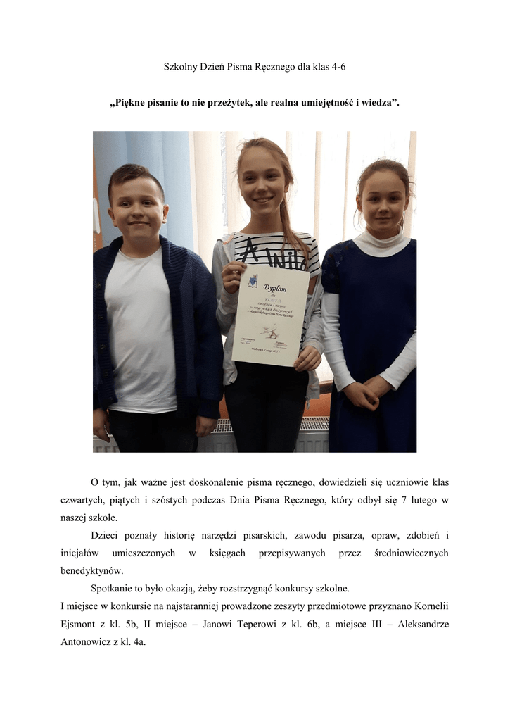 Szkolny Dzień Pisma Ręcznego dla klas 4-6 „Piękne pisanie to nie przeżytek, ale realna umiejętność i wiedza”. O tym, jak ważne jest doskonalenie pisma ręcznego, dowiedzieli się uczniowie klas czwartych, piątych i szóstych podczas Dnia Pisma Ręcznego, który odbył się 7 lutego w naszej szkole. Dzieci poznały historię narzędzi pisarskich, zawodu pisarza, opraw, zdobień i inicjałów umieszczonych w księgach przepisywanych przez średniowiecznych benedyktynów. Spotkanie to było okazją, żeby rozstrzygnąć konkursy szkolne. I miejsce w konkursie na najstaranniej prowadzone zeszyty przedmiotowe przyznano Kornelii Ejsmont z kl. 5b, II miejsce – Janowi Teperowi z kl. 6b, a miejsce III – Aleksandrze Antonowicz z kl. 4a. Najpiękniejsze inicjały wykonali: Julia Misztal, Kacper Szwedo i Maria Piec- uczniowie kl. 6b. Natomiast Zofia Wolańska i Amelia Mikulska z kl. 5c oraz Mateusz Wasilewicz z kl. 6b najładniej przepisali pierwsze polskie zdanie pochodzące z „Księgi henrykowskiej”. Szkolny Dzień Pisma Ręcznego to także rozgrywki drużynowe, które polegały na rozwiązaniu krzyżówki tematycznej, ułożeniu puzzli oraz wykonaniu zadania typu prawda – fałsz. Nagrodzono kl. 4a, 5b oraz kl. 6b. Zwycięzcom gratulujemy i życzymy dalszych sukcesów.
