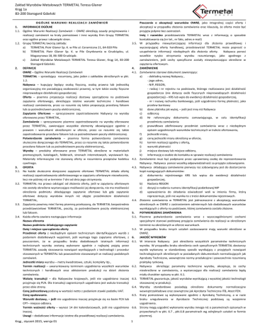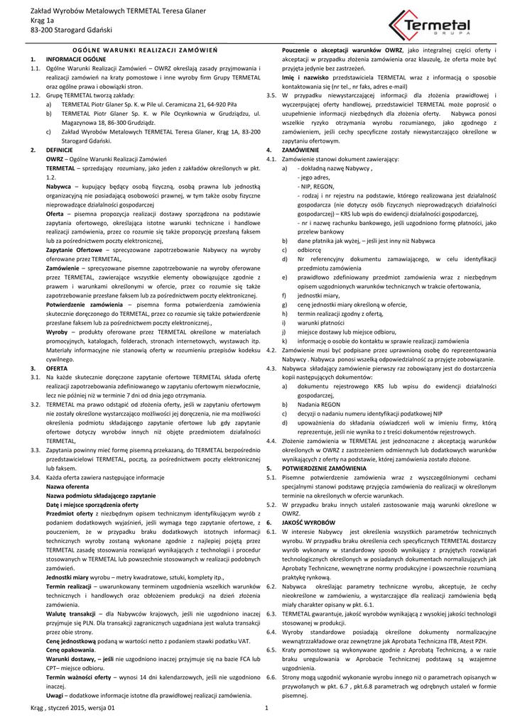 Zakład Wyrobów Metalowych TERMETAL Teresa Glaner Krąg 1a 83-200 Starogard Gdański OGÓLNE WARUNKI REALIZACJI ZAMÓWIEŃ 1. INFORMACJE OGÓLNE 1.1. Ogólne Warunki Realizacji Zamówień – OWRZ określają zasady przyjmowania i realizacji zamówień na kraty pomostowe i inne wyroby firm Grupy TERMETAL oraz ogólne prawa i obowiązki stron. 1.2. Grupę TERMETAL tworzą zakłady: a) TERMETAL Piotr Glaner Sp. K. w Pile ul. Ceramiczna 21, 64-920 Piła b) TERMETAL Piotr Glaner Sp. K. w Pile Ocynkownia w Grudziądzu, ul. Magazynowa 18, 86-300 Grudziądz. c) Zakład Wyrobów Metalowych TERMETAL Teresa Glaner, Krąg 1A, 83-200 Starogard Gdański. 2. DEFINICJE OWRZ – Ogólne Warunki Realizacji Zamówień TERMETAL – sprzedający rozumiany, jako jeden z zakładów określonych w pkt. 1.2. Nabywca – kupujący będący osobą fizyczną, osobą prawna lub jednostką organizacyjną nie posiadającą osobowości prawnej, w tym także osoby fizyczne nieprowadzące działalności gospodarczej Oferta – pisemna propozycja realizacji dostawy sporządzona na podstawie zapytania ofertowego, określająca istotne warunki techniczne i handlowe realizacji zamówienia, przez co rozumie się także propozycję przesłaną faksem lub za pośrednictwem poczty elektronicznej, Zapytanie Ofertowe – sprecyzowane zapotrzebowanie Nabywcy na wyroby oferowane przez TERMETAL, Zamówienie – sprecyzowane pisemne zapotrzebowanie na wyroby oferowane przez TERMETAL, zawierające wszystkie elementy obowiązujące zgodnie z prawem i warunkami określonymi w ofercie, przez co rozumie się także zapotrzebowanie przesłane faksem lub za pośrednictwem poczty elektronicznej. Potwierdzenie zamówienia – pisemna forma potwierdzenia zamówienia skutecznie doręczonego do TERMETAL, przez co rozumie się także potwierdzenie przesłane faksem lub za pośrednictwem poczty elektronicznej., Wyroby – produkty oferowane przez TERMETAL określone w materiałach promocyjnych, katalogach, folderach, stronach internetowych, wystawach itp. Materiały informacyjne nie stanowią oferty w rozumieniu przepisów kodeksu cywilnego. 3. OFERTA 3.1. Na każde skutecznie doręczone zapytanie ofertowe TERMETAL składa ofertę realizacji zapotrzebowania zdefiniowanego w zapytaniu ofertowym niezwłocznie, lecz nie później niż w terminie 7 dni od dnia jego otrzymania. 3.2. TERMETAL ma prawo odstąpić od złożenia oferty, jeśli w zapytaniu ofertowym nie zostały określone wystarczająco możliwości jej doręczenia, nie ma możliwości określenia podmiotu składającego zapytanie ofertowe lub gdy zapytanie ofertowe dotyczy wyrobów innych niż objęte przedmiotem działalności TERMETAL, 3.3. Zapytania powinny mieć formę pisemną przekazaną, do TERMETAL bezpośrednio przedstawicielowi TERMETAL, pocztą, za pośrednictwem poczty elektronicznej lub faksem. 3.4. Każda oferta zawiera następujące informacje Nazwa oferenta Nazwa podmiotu składającego zapytanie Datę i miejsce sporządzenia oferty Przedmiot oferty z niezbędnym opisem technicznym identyfikującym wyrób z podaniem dodatkowych wyjaśnień, jeśli wymaga tego zapytanie ofertowe, z pouczeniem, że w przypadku braku dodatkowych istotnych informacji technicznych wyroby zostaną wykonane zgodnie z najlepiej pojętą przez TERMETAL zasadę stosowania rozwiązań wynikających z technologii i procedur stosowanych w TERMETAL lub powszechnie stosowanych w realizacji podobnych zamówień. Jednostki miary wyrobu – metry kwadratowe, sztuki, komplety itp., Termin realizacji – uwarunkowany terminem uzgodnienia wszelkich warunków technicznych i handlowych oraz obłożeniem produkcji na dzień złożenia zamówienia. Walutę transakcji – dla Nabywców krajowych, jeśli nie uzgodniono inaczej przyjmuje się PLN. Dla transakcji zagranicznych uzgadniana jest waluta transakcji przez obie strony. Cenę jednostkową podaną w wartości netto z podaniem stawki podatku VAT. Cenę opakowania. Warunki dostawy, – jeśli nie uzgodniono inaczej przyjmuje się na bazie FCA lub CPT– miejsce odbioru. Termin ważności oferty – wynosi 14 dni kalendarzowych, jeśli nie uzgodniono inaczej. Uwagi – dodatkowe informacje istotne dla prawidłowej realizacji zamówienia. Krąg , styczeń 2015, wersja 01 3.5. 4. 4.1. 4.2. 4.3. 4.4. 5. 5.1. 5.2. 6. 6.1. 6.2. 6.3. 6.4. 6.5. 6.6. 1 Pouczenie o akceptacji warunków OWRZ, jako integralnej części oferty i akceptacji w przypadku złożenia zamówienia oraz klauzulę, że oferta może być przyjęta jedynie bez zastrzeżeń. Imię i nazwisko przedstawiciela TERMETAL wraz z informacją o sposobie kontaktowania się (nr tel., nr faks, adres e-mail) W przypadku niewystarczającej informacji dla złożenia prawidłowej i wyczerpującej oferty handlowej, przedstawiciel TERMETAL może poprosić o uzupełnienie informacji niezbędnych dla złożenia oferty. Nabywca ponosi wszelkie ryzyko otrzymania wyrobu rozumianego, jako zgodnego z zamówieniem, jeśli cechy specyficzne zostały niewystarczająco określone w zapytaniu ofertowym. ZAMÓWIENIE Zamówienie stanowi dokument zawierający: a) - dokładną nazwę Nabywcy , - jego adres, - NIP, REGON, - rodzaj i nr rejestru na podstawie, którego realizowana jest działalność gospodarcza (nie dotyczy osób fizycznych nieprowadzących działalności gospodarczej) – KRS lub wpis do ewidencji działalności gospodarczej, - nr i nazwę rachunku bankowego, jeśli uzgodniono formę płatności, jako przelew bankowy b) dane płatnika jak wyżej, – jeśli jest inny niż Nabywca c) odbiorcę d) Nr referencyjny dokumentu zamawiającego, w celu identyfikacji przedmiotu zamówienia e) prawidłowo zdefiniowany przedmiot zamówienia wraz z niezbędnym opisem uzgodnionych warunków technicznych w trakcie ofertowania, f) jednostki miary, g) cenę jednostki miary określoną w ofercie, h) termin realizacji zgodny z ofertą, i) warunki płatności j) miejsce dostawy lub miejsce odbioru, k) informację o osobie do kontaktu w sp