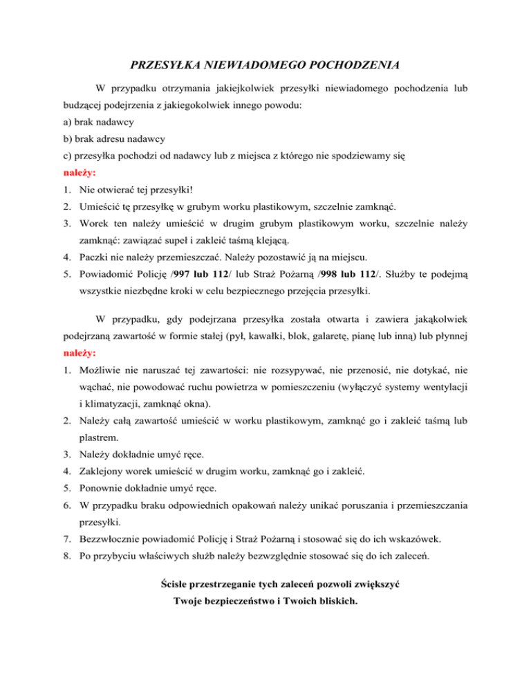 PRZESYŁKA NIEWIADOMEGO POCHODZENIA W przypadku otrzymania jakiejkolwiek przesyłki niewiadomego pochodzenia lub budzącej podejrzenia z jakiegokolwiek innego powodu: a) brak nadawcy b) brak adresu nadawcy c) przesyłka pochodzi od nadawcy lub z miejsca z którego nie spodziewamy się należy: 1. Nie otwierać tej przesyłki! 2. Umieścić tę przesyłkę w grubym worku plastikowym, szczelnie zamknąć. 3. Worek ten należy umieścić w drugim grubym plastikowym worku, szczelnie należy zamknąć: zawiązać supeł i zakleić taśmą klejącą. 4. Paczki nie należy przemieszczać. Należy pozostawić ją na miejscu. 5. Powiadomić Policję /997 lub 112/ lub Straż Pożarną /998 lub 112/. Służby te podejmą wszystkie niezbędne kroki w celu bezpiecznego przejęcia przesyłki. W przypadku, gdy podejrzana przesyłka została otwarta i zawiera jakąkolwiek podejrzaną zawartość w formie stałej (pył, kawałki, blok, galaretę, pianę lub inną) lub płynnej należy: 1. Możliwie nie naruszać tej zawartości: nie rozsypywać, nie przenosić, nie dotykać, nie wąchać, nie powodować ruchu powietrza w pomieszczeniu (wyłączyć systemy wentylacji i klimatyzacji, zamknąć okna). 2. Należy całą zawartość umieścić w worku plastikowym, zamknąć go i zakleić taśmą lub plastrem. 3. Należy dokładnie umyć ręce. 4. Zaklejony worek umieścić w drugim worku, zamknąć go i zakleić. 5. Ponownie dokładnie umyć ręce. 6. W przypadku braku odpowiednich opakowań należy unikać poruszania i przemieszczania przesyłki. 7. Bezzwłocznie powiadomić Policję i Straż Pożarną i stosować się do ich wskazówek. 8. Po przybyciu właściwych służb należy bezwzględnie stosować się do ich zaleceń. Ścisłe przestrzeganie tych zaleceń pozwoli zwiększyć Twoje bezpieczeństwo i Twoich bliskich.