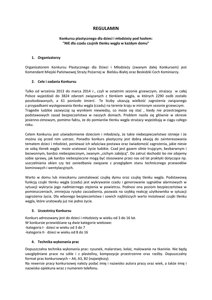 REGULAMIN Konkursu plastycznego dla dzieci i młodzieży pod hasłem: "NIE dla czadu czujnik tlenku węgla w każdym domu" 1. Organizatorzy Organizatorem Konkursu Plastycznego dla Dzieci i Młodzieży (zwanym dalej Konkursem) jest Komendant Miejski Paostwowej Straży Pożarnej w Bielsku-Białej oraz Beskidzki Cech Kominiarzy. 2. Cele i zadania Konkursu Tylko od września 2013 do marca 2014 r., czyli w ostatnim sezonie grzewczym, strażacy w całej Polsce wyjeżdżali do 3824 zdarzeo związanych z tlenkiem węgla, w których 2290 osób zostało poszkodowanych, a 61 poniosło śmierd. Te liczby ukazują wielkośd zagrożenia związanego z przypadkami występowania tlenku węgla (czadu) na terenie kraju w minionym sezonie grzewczym. Tragedie ludzkie zazwyczaj są wynikiem niewiedzy, co może się stad , kiedy nie przestrzegamy podstawowych zasad bezpieczeostwa w naszych domach. Problem nasila się głównie w okresie jesienno-zimowym, pomimo faktu, że do pomiarów tlenku węgla strażacy wyjeżdżają w ciągu całego roku. Celem Konkursu jest uświadomienie dzieciom i młodzieży, że takie niebezpieczeostwo istnieje i że można się przed nim ustrzec. Ponadto konkurs plastyczny jest dobrą okazją do zainteresowania tematem dzieci i młodzież, ponieważ ich właściwa postawa oraz świadomośd zagrożenia, jakie niesie ze sobą tlenek węgla może uratowad życie ludzkie. Czad jest gazem silnie trującym, bezbarwnym i bezwonnym, bardzo niebezpiecznym, zwanym „cichym zabójcą”. Do zatrud dochodzi bo nie zdajemy sobie sprawy, jak bardzo niebezpieczne mogą byd stosowane przez nas od lat praktyki dotyczące np. uszczelniania okien czy też zaniedbania związane z przeglądem stanu technicznego przewodów kominowych i wentylacyjnych. Warto w domu lub mieszkaniu zainstalowad czujkę dymu oraz czujkę tlenku węgla. Podstawową funkcją czujki tlenku węgla (czadu) jest wykrywanie czadu i generowanie sygnałów alarmowych w sytuacji wykrycia jego nadmiernego stężenia w powietrzu. Podnosi ona poziom bezpieczeostwa w pomieszczeniach, zmniejsza ryzyko zaczadzenia, pozwala na szybką reakcję użytkownika w sytuacji zagrożenia życia. Dla własnego bezpieczeostwa i sowich najbliższych warto instalowad czujki tlenku węgla, które uratowały już nie jedno życie. 3. Uczestnicy Konkursu Konkurs adresowany jest do dzieci i młodzieży w wieku od 3 do 16 lat. W konkursie przewidziane są dwie kategorie wiekowe: -kategoria I- dzieci w wieku od 3 do 7 -kategoria II- dzieci w wieku od 8 do 16 4. Technika wykonania prac Dopuszczalna technika wykonania prac: rysunek, malarstwo, kolaż, malowanie na tkaninie. Nie będą uwzględniane prace na szkle i z plasteliny, kompozycje przestrzenne oraz rzeźby. Dopuszczalny format prac konkursowych – A4, A3, B2 (największy). Na rewersie pracy konkursowej należy podad imię i nazwisko autora pracy oraz wiek, a także imię i nazwisko opiekuna wraz z numerem telefonu. 5. Podział nagród Prace nadesłane na konkurs zostaną ocenione przez Jury, w skład którego wejdą przedstawiciele organizatorów Konkursu. Organizatorzy przewidują 3 nagrody rzeczowe w każdej kategorii wiekowej. Jury przysługuje prawo innego podziału nagród. 6. Terminarz konkursu i nadsyłanie prac Nadsyłanie prac do – 19 stycznia 2015 r. na adres: Komenda Miejska PSP w Bielsku-Białej ul. Leszczyoska 43 43-300 Bielsko-Biała z dopiskiem Konkurs plastyczny /decyduje data stempla pocztowego / Ocena Jury – 23 stycznia 2015 r. Informacja o wynikach konkursu dostępna na stronie www.straz.bielsko.pl . Powiadomienie laureatów telefonicznie. Prace przesłane na konkurs przechodzą na własnośd organizatora. Wybrane prace mogą byd eksponowane na wystawach w budynku Komendy Miejskiej PSP w Bielsku-Białe. Koszt przesyłki pokrywa uczestnik konkursu. Ostateczna interpretacja regulaminu należy do organizatorów. Wszelkich dodatkowych informacji udziela rzecznik Komendanta Miejskiego PSP w Bielsku-Białej tel. (0-33) 812-22-33 lub e-mail: [email protected] .