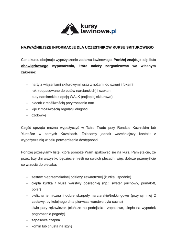 NAJWAŻNIEJSZE INFORMACJE DLA UCZESTNIKÓW KURSU SKITUROWEGO Cena kursu obejmuje wypożyczenie zestawu lawinowego. Poniżej znajduje się lista obowiązkowego wyposażenia, które należy zorganizować we własnym zakresie: - narty z wiązaniami skiturowymi wraz z nożami do szreni i fokami - raki (dopasowane do butów narciarskich) i czekan - buty narciarskie z opcją WALK (najlepiej skiturowe) - plecak z możliwością przytroczenia nart - kije z możliwością regulacji długości - czołówkę Część sprzętu można wypożyczyć w Tatra Trade przy Rondzie Kuźnickim lub YurtaBar w samych Kuźnicach. Zalecamy jednak wcześniejszy kontakt z wypożyczalnią w celu potwierdzenia dostępności. Poniżej przesyłamy listę, która pomoże Wam spakować się na kurs. Pamiętajcie, że przez trzy dni wszystko będziecie nieśli na swoich plecach, więc dobrze przemyślcie co wrzucić do plecaka: - zestaw nieprzemakalnej odzieży zewnętrznej (kurtka i spodnie) - ciepła kurtka / bluza warstwy pośredniej (np.: sweter puchowy, primaloft, polar) - bielizna termiczna i dobre skarpety narciarskie/trekkingowe (przynajmniej 2 zestawy, by kolejnego dnia pierwsza warstwa była sucha) - dwie pary rękawiczek (cieńsze na podejścia i zapasowe, ciepłe na wypadek pogorszenia pogody) - zapasowa czapka - komin lub chusta na szyję - okulary przeciwsłoneczne - odzież do schroniska (w tym klapki lub lekkie kapcie) - przybory toaletowe (sugerujemy małe buteleczki i tubki) - lekki ręcznik - krem z filtrem UV SPOTKANIE Z RATOWNIKAMI: Miejsce spotkania z ratownikami zostanie podane tydzień przed kursem. WYŻYWIENIE: Przypominamy, że wyżywienie zapewniacie sobie we własnym zakresie. Tu warto podkreślić, że bufety w schroniskach serwują duże i smaczne posiłki. Wszelkie życzenia z nimi związane prosimy zgłaszać bezpośrednio w recepcji. PLAN ZAJĘĆ: Piątek 14:00 – zbiórka uczestników 15:00 – 18:00 – wspólne podejście do miejsca pierwszego noclegu (odpowiednio dla wybranego terminu: Schronisko PTTK w Dolinie Pięciu Stawów Polskich, Schronisko PTTK na Hali Kondratowej lub Schronisko PTTK na Hali Ornak) Sobota 9:00 – 16:00 – wycieczka skiturowa (2 grupy po 6 osób) i przejście do miejsca drugiego noclegu (odpowiednio dla wybranego terminu: Schronisko PTTK na Hali Gąsienicowej, Schronisko PTTK na Hali Ornak, Schronisko PTTK w Dolinie Chochołowskiej) 17:00 – 19:00 – wieczorne spotkanie i podsumowanie dnia Niedziela 9:00 – 14:00 – wycieczka skiturowa (2 grupy po 6 osób) www.kursylawinowe.pl www.facebook.com/lawiny www.instagram.com/kursylawinowe.pl www.youtube.com/kursylawinowepl