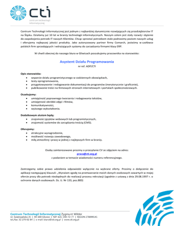 Centrum Technologii Informatycznej jest jednym z najbardziej dynamicznie rozwijających się przedsiębiorstw IT na Śląsku. Działamy już 10 lat w branży technologii informatycznych. Naszym celem jest stały rozwój i dążenie do zaspokojenia potrzeb IT naszych Klientów. Chcąc sprostać potrzebom stale podnosimy poziom naszych usług i oferujemy najlepszej jakości produkty. Jako autoryzowany partner firmy Comarch, jesteśmy w czołówce polskich firm sprzedających i wdrażających systemy do zarzadzania firmami klasy ERP. W chwili obecnej do naszego biura w Gliwicach poszukujemy pracownika na stanowisko: Asystent Działu Programowania nr ref. ADP/CTI Opis stanowiska: wsparcie działu programistycznego w codziennych obowiązkach, testy oprogramowania, przygotowywanie i redagowanie dokumentacji do programów (merytorycznie i graficznie), publikowanie treści na firmowych stronach internetowych i portalach społecznościowych. Oczekujemy: umiejętność poprawnego tworzenia i redagowania tekstów, umiejętność obróbki zdjęć i filmów, komunikatywności, wyższego wykształcenia. Dodatkowym atutem będą: znajomości języków webowych lub programistycznych, znajomość systemów do zarządzania treścią (CMS). Oferujemy: atrakcyjne wynagrodzenie, możliwość rozwoju zawodowego, miłą atmosferę i pracę w jednej z najlepszych firm w branży. Osoby zainteresowane prosimy o przesyłanie CV ze zdjęciem na adres: [email protected] z podaniem w temacie wiadomości numeru referencyjnego. Zastrzegamy sobie prawo udzielenia odpowiedzi wyłącznie na wybrane oferty. Prosimy o dołączenie do aplikacji następującej klauzuli: „Wyrażam zgodę na przetwarzanie moich danych osobowych zawartych w mojej ofercie pracy dla potrzeb niezbędnych do realizacji procesu rekrutacji (zgodnie z ustawą z dnia 29.08.1997 r. o ochronie danych osobowych. Dz. U. Nr 133, poz.883)