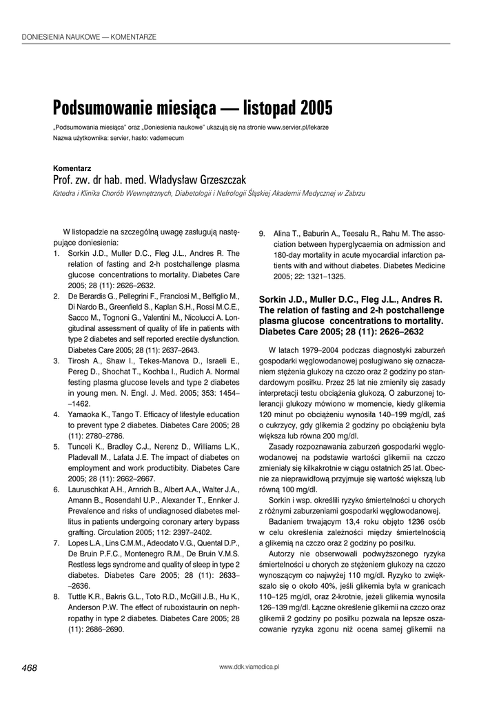 DONIESIENIA NAUKOWE — KOMENTARZE Podsumowanie miesiąca — listopad 2005 „Podsumowania miesiąca” oraz „Doniesienia naukowe” ukazują się na stronie www.servier.pl/lekarze Nazwa użytkownika: servier, hasło: vademecum Komentarz Prof. zw. dr hab. med. Władysław Grzeszczak Katedra i Klinika Chorób Wewnętrznych, Diabetologii i Nefrologii Śląskiej Akademii Medycznej w Zabrzu W listopadzie na szczególną uwagę zasługują następujące doniesienia: 1. Sorkin J.D., Muller D.C., Fleg J.L., Andres R. The relation of fasting and 2-h postchallenge plasma glucose concentrations to mortality. Diabetes Care 2005; 28 (11): 2626–2632. 2. De Berardis G., Pellegrini F., Franciosi M., Belfiglio M., Di Nardo B., Greenfield S., Kaplan S.H., Rossi M.C.E., Sacco M., Tognoni G., Valentini M., Nicolucci A. Longitudinal assessment of quality of life in patients with type 2 diabetes and self reported erectile dysfunction. Diabetes Care 2005; 28 (11): 2637–2643. 3. Tirosh A., Shaw I., Tekes-Manova D., Israeli E., Pereg D., Shochat T., Kochba I., Rudich A. Normal festing plasma glucose levels and type 2 diabetes in young men. N. Engl. J. Med. 2005; 353: 1454– –1462. 4. Yamaoka K., Tango T. Efficacy of lifestyle education to prevent type 2 diabetes. Diabetes Care 2005; 28 (11): 2780–2786. 5. Tunceli K., Bradley C.J., Nerenz D., Williams L.K., Pladevall M., Lafata J.E. The impact of diabetes on employment and work productibity. Diabetes Care 2005; 28 (11): 2662–2667. 6. Lauruschkat A.H., Arnrich B., Albert A.A., Walter J.A., Amann B., Rosendahl U.P., Alexander T., Ennker J. Prevalence and risks of undiagnosed diabetes mellitus in patients undergoing coronary artery bypass grafting. Circulation 2005; 112: 2397–2402. 7. Lopes L.A., Lins C.M.M., Adeodato V.G., Quental D.P., De Bruin P.F.C., Montenegro R.M., De Bruin V.M.S. Restless legs syndrome and quality of sleep in type 2 diabetes. Diabetes Care 2005; 28 (11): 2633– –2636. 8. Tuttle K.R., Bakris G.L., Toto R.D., McGill J.B., Hu K., Anderson P.W. The effect of ruboxistaurin on nephropathy in type 2 diabetes. Diabetes Care 2005; 28 (11): 2686–2690. 468 9. Alina T., Baburin A., Teesalu R., Rahu M. The association between hyperglycaemia on admission and 180-day mortality in acute myocardial infarction patients with and without diabetes. Diabetes Medicine 2005; 22: 1321–1325. Sorkin J.D., Muller D.C., Fleg J.L., Andres R. The relation of fasting and 2-h postchallenge plasma glucose concentrations to mortality. Diabetes Care 2005; 28 (11): 2626–2632 W latach 1979–2004 podczas diagnostyki zaburzeń gospodarki węglowodanowej posługiwano się oznaczaniem stężenia glukozy na czczo oraz 2 godziny po standardowym posiłku. Przez 25 lat nie zmieniły się zasady interpretacji testu obciążenia glukozą. O zaburzonej tolerancji glukozy mówiono w momencie, kiedy glikemia 120 minut po obciążeniu wynosiła 140–199 mg/dl, zaś o cukrzycy, gdy glikemia 2 godziny po obciążeniu była większa lub równa 200 mg/dl. Zasady rozpoznawania zaburzeń gospodarki węglowodanowej na podstawie wartości glikemii na czczo zmieniały się kilkakrotnie w ciągu ostatnich 25 lat. Obecnie za nieprawidłową przyjmuje się wartość większą lub równą 100 mg/dl. Sorkin i wsp. określili ryzyko śmiertelności u chorych z różnymi zaburzeniami gospodarki węglowodanowej. Badaniem trwającym 13,4 roku objęto 1236 osób w celu określenia zależności między śmiertelnością a glikemią na czczo oraz 2 godziny po posiłku. Autorzy nie obserwowali podwyższonego ryzyka śmiertelności u chorych ze stężeniem glukozy na czczo wynoszącym co najwyżej 110 mg/dl. Ryzyko to zwiększało się o około 40%, jeśli glikemia była w granicach 110–125 mg/dl, oraz 2-krotnie, jeżeli glikemia wynosiła 126–139 mg/dl. Łączne określenie glikemii na czczo oraz glikemii 2 godziny po posiłku pozwala na lepsze oszacowanie ryzyka zgonu niż ocena samej glikemii na www.ddk.viamedica.pl Podsumowanie miesiąca — listopad 2005 czczo. Zwiększenie glikemii 2 godziny po obciążeniu powoduje taki sam wzrost ryzyka zgonu jak wzrost glikemii na czczo. Na podstawie przeprowadzonych badań autorzy zasugerowali, że przedstawione wyniki potwierdzają słuszność decyzji o obniżeniu wartości glikemii na czczo do progu nieprawidłowych 110 mg/dl. Oznaczenie glikemii 2 godziny po obciążeniu dostarcza wielu nowych cennych informacji. Nie wykazano jednak związku między wartością glikemii wynoszącą 100–109 mg/dl a wzrostem ryzyka zgonu. Autorzy w dyskusji przedstawili podsumowanie innych badań. Tylko w dwóch z nich (Rancho Bernardo Study oraz BLSA) udowodniono, że ryzyko zgonu zwiększa się zarówno u kobiet, jak i u mężczyzn, jeśli glikemia na czczo była większa od 100 mg/dl. We wszystkich innych badaniach wykazano, że dopiero wówczas, gdy glikemia wynosi 110 mg/dl lub więcej, ryzyko to istotnie wzrasta. De Berardis G., Pellegrini F., Franciosi M., Belfiglio M., Di Nardo B., Greenfield S., Kaplan S.H., Rossi M.C.E., Sacco M., Tognoni G., Valentini M., Nicolucci A. Longitudinal assessment of quality of life in patients with type 2 diabetes and self reported erectile dysfunction. Diabetes Care 2005; 28 (11): 2637–2643 Zaburzenia erekcji wywierają ujemny wpływ na jakość życia chorych na cukrzycę typu 2. W wieloośrodkowych, międzynarodowych badaniach wykazano, że zaburzenia erekcji u tych pacjentów są bardziej nasilone niż u osób bez cukrzycy. Najwięcej informacji na temat wpływu zaburzeń erekcji w populacji ogólnej pochodzi z badań przekrojowych, natomiast dane dotyczące chorych na cukrzycę są mniej dokładne i mniej wiarygodne. De Berardis i wsp. ocenili zmiany jakości życia w okresie 3 lat u chorych na cukrzycę typu 2 z już obecnymi lub z niedawno rozwiniętymi zaburzeniami erekcji. Badaniem objęto 1456 chorych, u których wyjściowo oraz co 6 miesięcy przez okres 3 lat oceniano jakość życia oraz jakość ży