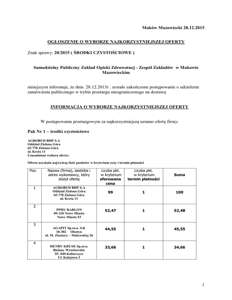 Maków Mazowiecki 28.12.2015 OGŁOSZENIE O WYBORZE NAJKORZYSTNIEJSZEJ OFERTY Znak sprawy: 20/2015 ( ŚRODKI CZYSTOŚCIOWE ) Samodzielny Publiczny Zakład Opieki Zdrowotnej - Zespół Zakładów w Makowie Mazowieckim niniejszym informuje, że dnia 28.12.2015r . zostało zakończone postępowanie o udzielenie zamówienia publicznego w trybie przetargu nieograniczonego na dostawę INFORMACJA O WYBORZE NAJKORZYSTNIEJSZEJ OFERTY W postępowaniu przetargowym za najkorzystniejszą uznano ofertę firmy: Pak Nr 1 – środki czystościowe AGROBUD BHP S.A Oddział Zielona Góra 65-770 Zielona Góra ul. Kreta 11 Uzasadnieni wyboru oferty: Oferta uzyskała najwyższą ilość punktów w kryterium ceny i termin płatności Poz. 1 Nazwa (firma), siedziba i adres wykonawcy, który złożył ofertę Liczba pkt. w kryterium oferowana cena Liczba pkt. w kryterium termin płatności Suma 99 1 100 PPHU BARLON 09-120 Nowe Miasto Nowe Miasto 53 52,47 1 52,48 AGAPIT Sp.zo.o. S.K 10-302 Olsztyn ul. M. Zientary – Malewskiej 26 44,55 1 45,55 HENRY KRUSE Sp.zo.o. Bielany Wrocławskie 55- 040 Kobierzyce Ul. Kolejowa 3 33,66 1 34,66 AGROBUD BHP S.A Oddział Zielona Góra 65-770 Zielona Góra ul. Kreta 11 2 3 4 1 Pak Nr 2- mydło w płynie AGROBUD BHP S.A Oddział Zielona Góra 65-770 Zielona Góra ul. Kreta 11 Uzasadnieni wyboru oferty : Oferta uzyskała najwyższą ilość punktów w kryterium ceny i termin płatności Poz. Nazwa (firma), siedziba i adres wykonawcy, który złożył ofertę Liczba pkt. w kryterium oferowana cena Liczba pkt. w kryterium termin płatności Suma AGROBUD BHP S.A Oddział Zielona Góra 65-770 Zielona Góra ul. Kreta 11 99 0,89 99,89 AGAPIT Sp.zo.o. S.K 10-303 Olsztyn ul. M. Zientary – Malewskiej 26 91 0,89 91,89 HENRY KRUSE Sp.zo.o. Bielany Wrocławskie 55- 040 Kobierzyce Ul. Kolejowa 3 83,16 0,89 84,05 PPHU BARLON 09-120 Nowe Miasto Nowe Miasto 53 67,32 0,89 68,21 ADATEX Firma Handlowa 26-600 Radom ul.. Szklana 20m.3 58,41 1 59,41 Przedsiębiorstwo Produkcyjno Handlowe INTER TEAM 44-251 Rybnik ul. Poligonowa 18 47,52 0,96 48,48 1. 2. 3. 4. 5. 6. 2 Pak Nr 4- mydła w kostkach, żyletki, maszynki do golenia DUOLUX MEDICAL Sp.zo.o. 60-681 Poznań Os..B. Chrobrego 40F/53 Uzasadnieni wyboru oferty : Oferta uzyskała najwyższą ilość punktów w kryterium ceny i termin płatności Poz. Nazwa (firma), siedziba i adres wykonawcy, który złożył ofertę Liczba pkt. w kryterium oferowana cena Liczba pkt. w kryterium termin płatności Suma DUOLUX MEDICAL Sp.zo.o. 60-681 Poznań Os..B. Chrobrego 40F/53 99 0,85 99,85 73,96 1 74,96 1. 2. IG HURT Agencja PromocyjnoHandlowa 07-410 Ostrołęka ul. 11 Listopada 39 Pak Nr 5 – worki foliowe HELPLAST 43-190 Mikołów ul. Powstańców Śl.11 Uzasadnieni wyboru oferty : Oferta uzyskała najwyższą ilość punktów w kryterium ceny i termin płatności Poz. Nazwa (firma), siedziba i adres wykonawcy, który złożył ofertę Liczba pkt. w kryterium oferowana cena Liczba pkt. w kryterium termin płatności Suma HELPLAST 43-190 Mikołów ul. Powstańców Śl.11 99 1 100 82,94 0,75 83,69 1. 2. AGAPIT Sp.zo.o. S.K 10-304 Olsztyn ul. M. Zientary – Malewskiej 26 3 Pak Nr 6 Kuchnia ( zmywaki , wykałaczki, płyny) HENRY KRUSE Sp.zo.o. Bielany Wrocławskie 55- 040 Kobierzyce Ul. Kolejowa 3 Uzasadnieni wyboru oferty : Oferta uzyskała najwyższą ilość punktów w kryterium ceny i termin płatności Poz. Nazwa (firma), siedziba i adres wykonawcy, który złożył ofertę Liczba pkt. w kryterium oferowana cena Liczba pkt. w kryterium termin płatności Suma HENRY KRUSE Sp.zo.o. Bielany Wrocławskie 55- 040 Kobierzyce Ul. Kolejowa 3 99 0,85 99,85 AGAPIT Sp.zo.o. S.K 10-305 Olsztyn ul. M. Zientary – Malewskiej 26 46,87 0,85 47,72 IG HURT Agencja PromocyjnoHandlowa 07-410 Ostrołęka ul. 11 Listopada 39 41,23 1 42,23 1. 2. 3. Pak Nr 7 – Mopy FLESZ Sp.zo.o. ul. Cieślewskich 25 F 03-017 Warszawa Uzasadnieni wyboru oferty : Oferta uzyskała najwyższą ilość punktów w kryterium ceny i termin płatności Poz. Nazwa (firma), siedziba i adres wykonawcy, który złożył ofertę Liczba pkt. w kryterium oferowana cena Liczba pkt. w kryterium termin płatności Suma FLESZ Sp.zo.o. ul. Cieślewskich 25 F 03-017 Warszawa 99 0,92 99,92 81,00 1 82,00 75,50 0,92 76,42 1. 2. Przedsiębiorstwo Produkcyjno Handlowe INTER TEAM 44-251 Rybnik ul. Poligonowa 18 3. AGAPIT Sp.zo.o. S.K 10-306 Olsztyn ul. M. Zientary – Malewskiej 26 4 4. HENRY KRUSE Sp.zo.o. Bielany Wrocławskie 55- 040 Kobierzyce Ul. Kolejowa 3 57,76 0,92 58,68 Umowa podpisana będzie w terminie nie krótszym niż pięć dni od chwili ogłoszenia wyniku postępowania. 5