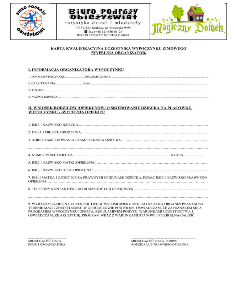 turystyka dzieci i młodzieży 31-534 Kraków, ul. Masarska 9/98 fax (+48 12) 656-61-24 REGON 357052776 NIP 945-133-90-18 KARTA KWALIFIKACYJNA UCZESTNIKA WYPOCZYNKU ZIMOWEGO /WYPEŁNIA ORGANIZATOR/ I. INFORMACJA ORGANIZATORA WYPOCZYNKU 1. FORMAWYPOCZYNKU.........................PÓŁZIMOWISKO............................................................................................................................ 2. CZAS TRWANIA...................................5 dni..................................................................................................................................................... 3. TERMIN............................................................................................................................................................................................................. 4. NAZWA IMPREZY…………………………………………………………..................................................................................................... II. WNIOSEK RODZICÓW /OPIEKUNÓW/ O SKIEROWANIE DZIECKA NA PLACÓWKĘ WYPOCZYNKU - /WYPEŁNIA OPIEKUN/ 1. IMIĘ I NAZWISKO DZIECKA................................................................................................................................................. 2. DATA I MIEJSCE URODZENIA.............................................................................................................................................. 3. ADRES ZAMELDOWANIA I ZAMIESZKANIA DZIECKA.................................................................................................. ......................................................................................................................................................................................................... 4. NUMER PESEL DZIECKA..............................................................................................................KLASA........................... 5. IMIĘ I NAZWISKO MATKI /OPIEKUNA/………………………………………………………………………………….. 6. IMIĘ I NAZWISKO OJCA /OPIEKUNA/…………………………………………………………………………................. 7. JEŚLI MATKA I OJCIEC NIE SĄ PRAWNYMI OPIKUNAMI DZIECKA, PODAĆ IMIĘ I NAZWISKO PRAWNEGO OPIEKUNA……………………………………………………………………………………………………………………… 8. TELEFONY KONTAKTOWE DO RODZICÓW LUB OPIEKUNÓW................................................................................... ......................................................................................................................................................................................................... 9. WYRAŻAM ZGODĘ NA UCZESTNICTWO W PÓŁZIMOWISKU MOJEGO DZIECKA ORGANIZOWANYM NA TERENIE MAGICZNEGO DOMKU W GŁOGOCZOWIE POD NR 606. OŚWIADCZAM, ŻE ZAPOZNAŁEM SIĘ Z PROGRAMEM WYPOCZYNKU/ OFERTĄ, REGULAMINEM POBYTU, WARUNKAMI UCZESTNICTWA I OŚWIADCZAM, ŻE AKCEPTUJĘ. PROGRAM WRAZ Z WARUNKAMI STANOWI INTEGRALNĄ CAŁOŚĆ. ................................................. MIEJSCOWOŚĆ, DATA PODPIS ORGANIZATORA .................................................................................. MIEJSCOWOŚĆ, DATA, PODPIS RODZICA LUB PRAWNEGO OPIEKUNA III. INFORMACJE OPIEKUNÓW O DZIECKU: UPRZEJMIE PROSIMY O UWAŻNE WYPEŁNIENIE PONIŻSZYCH PUNKTÓW, PONIEWAŻ KAŻDA INFORMACJA MOŻE MIEĆ WPŁYW NA BEZPIECZEŃSTWO I ZDROWIE DZIECKA W TRAKCIE TRWANIA IMPREZY. 1. PRZEBYTE CHOROBY/ROK ŻYCIA ODRA ....................... ROK........................., OSPA................... ROK .....................................RÓŻYCZKA .................... ROK ..... ŚWINKA ................... ROK .................ASTMA ............................. ROK ................, ŻÓŁTACZKA .............. ROK........................ SZKARLATYNA.................ROK...........PADACZKA......................ROK………….ZŁAMANIA............................................... INNE ................................................................................................................................................................................................. 2.SZCZEPIENIA............................................................................................................................................................................... ............................................................................................................................................................................................................ 3. U DZIECKA WYSTĘPOWAŁY W OSTATNIM ROKU LUB WYSTĘPUJĄ OBECNIE: DRGAWKI, UTRATY PRZYTOMNOŚCI, ZABURZENIA RÓWNOWAGI, OMDLENIA, CZĘSTE BÓLE GŁOWY, LĘKI NOCNE, TRUDNOŚCI W ZASYPIANIU, TIKI, MOCZENIE NOCNE, CZĘSTE BÓLE BRZUCHA, WYMIOTY, KRWAWIENIE Z NOSA, DUSZNOŚCI, BÓLE STAWÓW, SZYBKIE MĘCZENIE SIĘ, NIEDOSŁUCH, JĄKANIE, PRZEWLEKŁY KASZEL, INNE ........................................................................................................................................................................................................... ........................................................................................................................................................................................................... .. 4.CZY DZIECKO BYŁO W SZPITALU? KIEDY? NA CO? ........................................................................................................ 5. DZIECKO JEST UCZULONE TAK/NIE, JEŻELI TAK TO NA CO?....................................................................................... 6. JAZDĘ SAMOCHODEM ZNOSI ŹLE/DOBRZE ...................................................................................................................... 7. INNE UWAGI O ZDROWIU DZIECKA .............................................