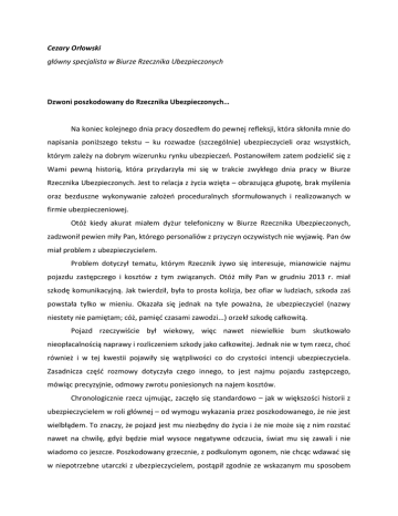 Cezary Orłowski główny specjalista w Biurze Rzecznika Ubezpieczonych Dzwoni poszkodowany do Rzecznika Ubezpieczonych… Na koniec kolejnego dnia pracy doszedłem do pewnej refleksji, która skłoniła mnie do napisania poniższego tekstu – ku rozwadze (szczególnie) ubezpieczycieli oraz wszystkich, którym zależy na dobrym wizerunku rynku ubezpieczeń. Postanowiłem zatem podzielić się z Wami pewną historią, która przydarzyła mi się w trakcie zwykłego dnia pracy w Biurze Rzecznika Ubezpieczonych. Jest to relacja z życia wzięta – obrazująca głupotę, brak myślenia oraz bezduszne wykonywanie założeń proceduralnych sformułowanych i realizowanych w firmie ubezpieczeniowej. Otóż kiedy akurat miałem dyżur telefoniczny w Biurze Rzecznika Ubezpieczonych, zadzwonił pewien miły Pan, którego personaliów z przyczyn oczywistych nie wyjawię. Pan ów miał problem z ubezpieczycielem. Problem dotyczył tematu, którym Rzecznik żywo się interesuje, mianowicie najmu pojazdu zastępczego i kosztów z tym związanych. Otóż miły Pan w grudniu 2013 r. miał szkodę komunikacyjną. Jak twierdził, była to prosta kolizja, bez ofiar w ludziach, szkoda zaś powstała tylko w mieniu. Okazała się jednak na tyle poważna, że ubezpieczyciel (nazwy niestety nie pamiętam; cóż, pamięć czasami zawodzi...) orzekł szkodę całkowitą. Pojazd rzeczywiście był wiekowy, więc nawet niewielkie bum skutkowało nieopłacalnością naprawy i rozliczeniem szkody jako całkowitej. Jednak nie w tym rzecz, choć również i w tej kwestii pojawiły się wątpliwości co do czystości intencji ubezpieczyciela. Zasadnicza część rozmowy dotyczyła czego innego, to jest najmu pojazdu zastępczego, mówiąc precyzyjnie, odmowy zwrotu poniesionych na najem kosztów. Chronologicznie rzecz ujmując, zaczęło się standardowo – jak w większości historii z ubezpieczycielem w roli głównej – od wymogu wykazania przez poszkodowanego, że nie jest wielbłądem. To znaczy, że pojazd jest mu niezbędny do życia i że nie może się z nim rozstać nawet na chwilę, gdyż będzie miał wysoce negatywne odczucia, świat mu się zawali i nie wiadomo co jeszcze. Poszkodowany grzecznie, z podkulonym ogonem, nie chcąc wdawać się w niepotrzebne utarczki z ubezpieczycielem, postąpił zgodnie ze wskazanym mu sposobem udokumentowania roszczenia i przedstawił dokumentację medyczną świadczącą, że on i jego ojciec (lat 70) są osobami, którym pojazd jest potrzebny do załatwiania zwykłych spraw życia codziennego, a ponadto jest niezbędny z uwagi na proces leczenia i rehabilitacji ojca. Tata poszkodowanego jest osobą niepełnosprawną z orzeczoną III grupą inwalidzką i wymaga raz w tygodniu przewiezienia na rehabilitację do szpitala. Sam poszkodowany trzy lata temu uległ wypadkowi komunikacyjnemu, w którym doznał szkody na osobie, skutki zaś tej szkody są widoczne po dziś dzień w postaci problemów z chodzeniem. Wydawałoby się zatem, że koszty, które przedstawił poszkodowany, będą z pewnością podlegać refundacji. Nic bardziej mylnego... Ubezpieczyciel – jak zawsze zachowujący czujność – nie dał się zaskoczyć i naciągnąć na zbędne koszty. Znalazł jakże prosty sposób, który nawiązuje do przysłowia: nie wpuścisz go drzwiami, wejdzie oknem. Niezwykle przebiegły ubezpieczyciel w osobie likwidatora merytorycznego szkody odszukał dane w Ośrodku Informacji UFG dotyczące pojazdów przypisanych poszkodowanemu i... Jest! Eureka! Strzał w dziesiątkę! Okazało się, że poszkodowany posiada jeszcze jeden pojazd. I nie była to byle jaka informacja! Wręcz przeciwnie – potwierdzona przez sam UFG, w którego to bazie danych figuruje obowiązujące i dotyczące osoby poszkodowanego aktualne ubezpieczenie OC właśnie na ten drugi pojazd. Odnalezione zostały numer rejestracyjny oraz numer polisy. Jedyne, czego nie było, to marki i typu pojazdu. Ale co tam, ważne, że jest drugi pojazd – i basta. Poszkodowany, zanim wykonał telefon do Rzecznika Ubezpieczonych, otrzymał pięknie napisane pismo, które mi w całej okazałości przeczytał. Cytował m.in. art. 34 ustawy o ubezpieczeniach obowiązkowych, uchwałę SN III CZP 5/11, na które powoływał się ubezpieczyciel. Uświadomiłem sobie, że być może, skoro poszkodowany miał drugi pojazd, stanowisko zakładu ubezpieczeń jest bez zarzutu. Już miałem to powiedzieć, gdy poszkodowany objaśnił mi – i tu najważniejszy fragment naszej rozmowy – że owszem, jest właścicielem drugiego pojazdu, lecz nie jest to samochód, a MOTOROWER Romet z okresu późnych lat 80. XX wieku. Trudno wyobrazić sobie, by tym pojazdem dowoził zimą schorowanego ojca raz w tygodniu na rehabilitację! Przeprosiłem swojego rozmówcę, gdyż nie mogłem się opanować i ostatecznie parsknąłem śmiechem. Następnie rzekłem, że sprawa oczywiście jest poważna, a ja nie miałem prawa tak się zachować i nic mnie nie usprawiedliwia. Niestety, wrażenie było tak niedorzeczne i zaskakujące, a przy tym śmieszne, że nie mogłem się powstrzymać. Poszkodowany nie był jednak urażony i odrzekł, że podobnie jak ja reaguje każda osoba, której opowiada swoją historię. Nikt nie chce wierzyć jego słowom do czasu, aż pokaże pismo od ubezpieczyciela. Odpowiedziałem Panu, aby odwołał się do ubezpieczyciela, odpowiednio wysoko adresując odwołanie. Dobrze, by góra wiedziała, co wyprawiają doły. Poszkodowany wspomniał, że napisze także do Rzecznika Ubezpieczonych, jako że sprawa wymaga interwencji z uwagi na niedorzeczność postępowania ubezpieczyciela. Morał? Przede wszystkim uznałem, że przedstawione mi zdarzenie zasługuje na uwagę, tak by cała ta historia była przestrogą dla ubezpieczycieli, którzy poszukują za wszelką cenę podstaw do odmowy zapłaty odszkodowania. Moim zdaniem w tej sprawie, jak i w wielu innych, zabrakło ludzkiego podejścia do zagadnienia kompensaty szkody