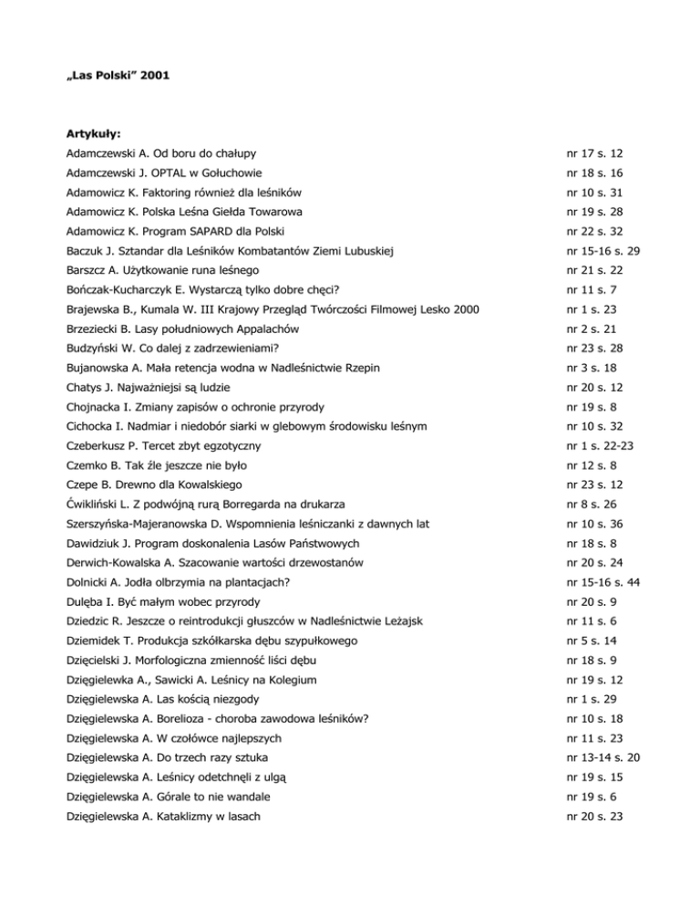 „Las Polski” 2001 Artykuły: Adamczewski A. Od boru do chałupy nr 17 s. 12 Adamczewski J. OPTAL w Gołuchowie nr 18 s. 16 Adamowicz K. Faktoring równieŜ dla leśników nr 10 s. 31 Adamowicz K. Polska Leśna Giełda Towarowa nr 19 s. 28 Adamowicz K. Program SAPARD dla Polski nr 22 s. 32 Baczuk J. Sztandar dla Leśników Kombatantów Ziemi Lubuskiej nr 15-16 s. 29 Barszcz A. UŜytkowanie runa leśnego nr 21 s. 22 Bończak-Kucharczyk E. Wystarczą tylko dobre chęci? nr 11 s. 7 Brajewska B., Kumala W. III Krajowy Przegląd Twórczości Filmowej Lesko 2000 nr 1 s. 23 Brzeziecki B. Lasy południowych Appalachów nr 2 s. 21 Budzyński W. Co dalej z zadrzewieniami? nr 23 s. 28 Bujanowska A. Mała retencja wodna w Nadleśnictwie Rzepin nr 3 s. 18 Chatys J. NajwaŜniejsi są ludzie nr 20 s. 12 Chojnacka I. Zmiany zapisów o ochronie przyrody nr 19 s. 8 Cichocka I. Nadmiar i niedobór siarki w glebowym środowisku leśnym nr 10 s. 32 Czeberkusz P. Tercet zbyt egzotyczny nr 1 s. 22-23 Czemko B. Tak źle jeszcze nie było nr 12 s. 8 Czepe B. Drewno dla Kowalskiego nr 23 s. 12 Ćwikliński L. Z podwójną rurą Borregarda na drukarza nr 8 s. 26 Szerszyńska-Majeranowska D. Wspomnienia leśniczanki z dawnych lat nr 10 s. 36 Dawidziuk J. Program doskonalenia Lasów Państwowych nr 18 s. 8 Derwich-Kowalska A. Szacowanie wartości drzewostanów nr 20 s. 24 Dolnicki A. Jodła olbrzymia na plantacjach? nr 15-16 s. 44 Dulęba I. Być małym wobec przyrody nr 20 s. 9 Dziedzic R. Jeszcze o reintrodukcji głuszców w Nadleśnictwie LeŜajsk nr 11 s. 6 Dziemidek T. Produkcja szkółkarska dębu szypułkowego nr 5 s. 14 Dzięcielski J. Morfologiczna zmienność liści dębu nr 18 s. 9 Dzięgielewka A., Sawicki A. Leśnicy na Kolegium nr 19 s. 12 Dzięgielewska A. Las kością niezgody nr 1 s. 29 Dzięgielewska A. Borelioza - choroba zawodowa leśników? nr 10 s. 18 Dzięgielewska A. W czołówce najlepszych nr 11 s. 23 Dzięgielewska A. Do trzech razy sztuka nr 13-14 s. 20 Dzięgielewska A. Leśnicy odetchnęli z ulgą nr 19 s. 15 Dzięgielewska A. Górale to nie wandale nr 19 s. 6 Dzięgielewska A. Kataklizmy w lasach nr 20 s. 23 Dzięgielewska A. Uwaga na kleszcze nr 20 s. 8 Dzięgielewska A. Nie bójmy się ministra nr 22 s. 13 Dzięgielewska A. Trudne problemy gospodarki leśnej nr 24 s. 12 Dzięgielewska A. Przeciwdziałanie deforestacji czy skok na kasę? nr 8 s. 8 Dzięgielewska A. Trudna decyzja nr 13-14 s. 15 Dzięgielewska A., Sawicki A. Kto wrobił Wiesława Lesnera? nr 12 s. 14 Dzięgielewska A., Sawicki A. O Warcinie raz jeszcze nr 15-16 s. 10 Fiedukowicz M., Fiedukowicz S. Kolejny legislacyjny knot? nr 11 s. 8 Fiedukowicz M., Fiedukowicz S. Uwagi do tekstu ustawy o przeznaczeniu gruntów rolnych do zalesienia nr 11 s. 9 Gałecki I. Najlepsze lata jeszcze przed nami nr 11 s. 14 Gawęda P. Bądź tu mądry przy prognozowaniu nr 13-14 s. 10 Gerhard J. Co ma piernik do wiatraka? nr 22 s. 26 Gil W. Sosna bartna nr 8 s. 22 Gizak D. śubry w Puszczy Boreckiej nr 11 s. 18 Gizak D. NadbuŜański Park Krajobrazowy nr 15-16 s. 30 Gizak D. Bóbr - problemy z ekspansją nr 6 s. 20 Gizak D. Wilk - inteligentny drapieŜnik nr 7 s. 22 Gorzelak A. Zwalczanie chwastów w szkółkach i uprawach leśnych nr 5 s. 12 Grodzki W. ZagroŜenia w lasach górskich nr 7 s. 16 Grzywacz A. Rocznik 2000 "Lasu Polskiego" w ocenie Rady Programowej nr 7 s. 8 Gust G. Klęski Ŝywiołowe w Nadleśnictwie Jamy nr 20 s. 22 Gutowski J.M. Bogactwo bogatkowatych Puszczy Białowieskiej nr 13-14 s. 30 Gwiazdowicz D. J. W lasach Ałtaju nr 13-14 s. 28 Hromiak A., Sieradzki W. P. Program sanacji Lasów Państwowych nr 18 s. 10 Jajor R. StaŜ tylko dla wybranych? nr 13-14 s. 16 Jajor R. Razem moŜna więcej nr 13-14 s. 18 Jajor R. Etatowi złodzieje nr 24 s. 34 Jaszczak R. Prawne niuanse planów urządzania lasu nr 23 s. 10 Jaworski J. Czy istnieje świerk z Roztocza? nr 17 s. 20 Kaczmarek J. Powiedzmy to sobie otwarcie nr 12 s. 7 Kaczmarski J. Rębnie tychowskie nr 15-16 s. 20 Kasprzyk S. Nowe Ŝycie lasów bieszczadzkich nr 1 s. 27 Kinelski S. Liczni i niekiedy kłopotliwi nr 15-16 s. 36 Kmiecik S. Szczecińskie obchody Dni Lasu nr 17 s. 19 Kmiecik S. Niewykorzystane moŜliwości nr 19 s. 26 Kocjan H. Osłonki tekturowe szansą dla zabezpieczenia upraw? nr 9 s. 24 Kolk A., Woreta D., Hilszczański J., Wolski R., Tarwacki G. Występowanie i zwalczanie szkodliwych owadów w 2000 roku nr 7 s. 12 Kolk A., Woreta D., Hilszczański J., Wolski R., Tarwacki G. Prognoza występowania szkodliwych owadów w 2001 roku nr 8 s. 15 Kołodziej P. Certyfikacja raz jeszcze nr 12 s. 23 Koperski R. Bajkał - perła Syberii nr 15-16 s. 32 Kopka P. W poszukiwaniu wody nr 13-14 s. 36 Kornicki K. Leśna Kontrola Państwowa nr 23 s. 9 Kozłowski R. Leśne studia magisterskie dawniej i dziś nr 4 s. 24 Krajewski S. Marchantia polymorpha w szkółkach kontenerowych nr 5 s. 21 Krawczyk J. Pomiary GPS Puszczy Knyszyńskiej nr 1 s.10 Krawczyk J. Teledetekcja w leśnictwie nr 1 s.20-21 Krawczyk J. Nic o nas bez nas nr 15-16 s. 42 Krawczyk J. Teledetekcja w leśnictwie nr 2 s. 8 Krukowska M. Ochrona bioróŜnorodności w rekreacyjnym zagospodarowaniu lasów nr 8 s. 28 Krynicki R. W odpowiedzi na list Projektanta Leśnego nr 23 s. 11 Krzemiński W. Długookresowe przechowywanie nasion buka zwyczajnego nr 5 s. 22 Kumala W. Zabrakło dwóch, a w zasadzie jednego głosu! nr 18 s. 22 Laurow Z. Reminiscencje z przeszłości nr 17 s. 22 Laurow Z. Dewiacje pseudorynkowe nr 18 s. 26 Lenart J. Patent w leśnictwie nr 10 s. 14 Lenart J., Miśkiewicz A., Pardela W. Nie ma jak zakryty nr 23 s. 18 Ligocki M. Czym łupać? nr 10 s. 20 Łukaszewicz J. Praca leśników dobrze rokuje przyszłym drzewostanom nr 8 s. 6 Majewski S. Jak straŜak z leśnikiem nr 8 s. 10 Malinowski H. Strategia zwalczania a rozwój odporności owadów na insektycydy nr 9 s. 22 Marszałek E. W tym miejscu szumiał las nr 15-16 s. 22 Marszałek E. Nie ma jak na połoninie nr 17 s. 14 Marszałek T. O niektóry