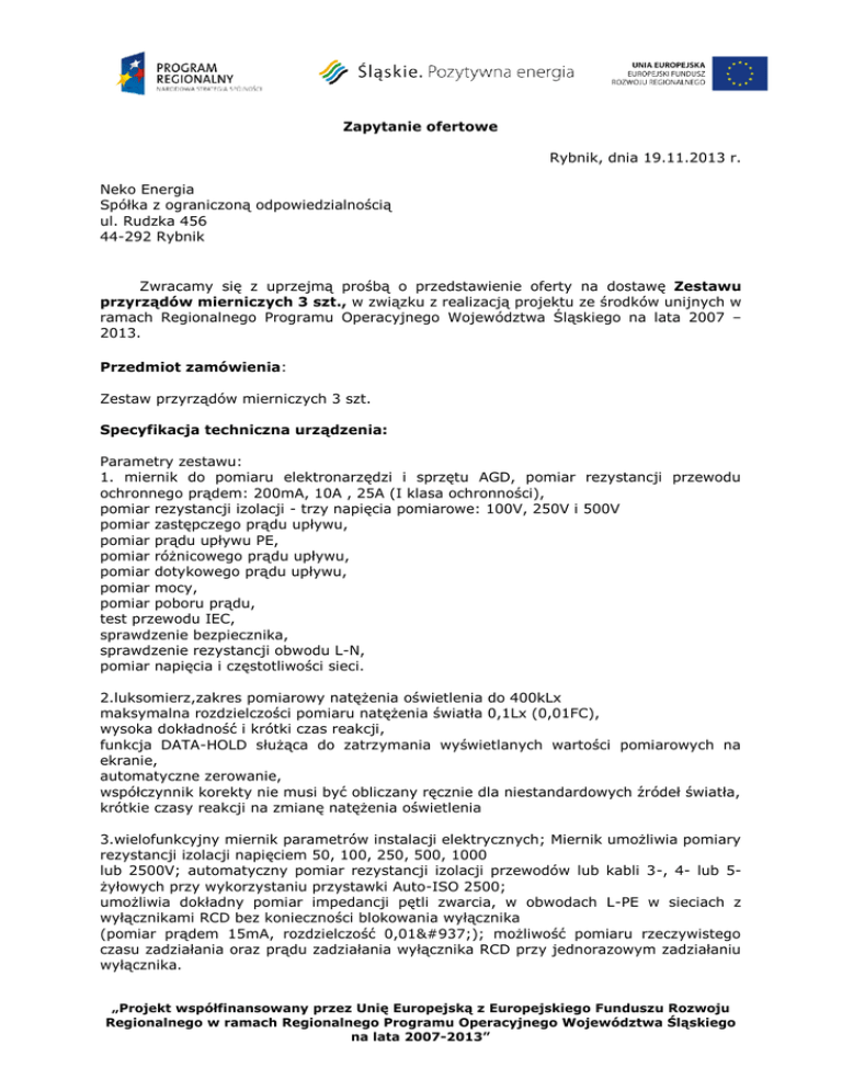 Zapytanie ofertowe Rybnik, dnia 19.11.2013 r. Neko Energia Spółka z ograniczoną odpowiedzialnością ul. Rudzka 456 44-292 Rybnik Zwracamy się z uprzejmą prośbą o przedstawienie oferty na dostawę Zestawu przyrządów mierniczych 3 szt., w związku z realizacją projektu ze środków unijnych w ramach Regionalnego Programu Operacyjnego Województwa Śląskiego na lata 2007 – 2013. Przedmiot zamówienia: Zestaw przyrządów mierniczych 3 szt. Specyfikacja techniczna urządzenia: Parametry zestawu: 1. miernik do pomiaru elektronarzędzi i sprzętu AGD, pomiar rezystancji przewodu ochronnego prądem: 200mA, 10A , 25A (I klasa ochronności), pomiar rezystancji izolacji - trzy napięcia pomiarowe: 100V, 250V i 500V pomiar zastępczego prądu upływu, pomiar prądu upływu PE, pomiar różnicowego prądu upływu, pomiar dotykowego prądu upływu, pomiar mocy, pomiar poboru prądu, test przewodu IEC, sprawdzenie bezpiecznika, sprawdzenie rezystancji obwodu L-N, pomiar napięcia i częstotliwości sieci. 2.luksomierz,zakres pomiarowy natężenia oświetlenia do 400kLx maksymalna rozdzielczości pomiaru natężenia światła 0,1Lx (0,01FC), wysoka dokładność i krótki czas reakcji, funkcja DATA-HOLD służąca do zatrzymania wyświetlanych wartości pomiarowych na ekranie, automatyczne zerowanie, współczynnik korekty nie musi być obliczany ręcznie dla niestandardowych źródeł światła, krótkie czasy reakcji na zmianę natężenia oświetlenia 3.wielofunkcyjny miernik parametrów instalacji elektrycznych; Miernik umożliwia pomiary rezystancji izolacji napięciem 50, 100, 250, 500, 1000 lub 2500V; automatyczny pomiar rezystancji izolacji przewodów lub kabli 3-, 4- lub 5żyłowych przy wykorzystaniu przystawki Auto-ISO 2500; umożliwia dokładny pomiar impedancji pętli zwarcia, w obwodach L-PE w sieciach z wyłącznikami RCD bez konieczności blokowania wyłącznika (pomiar prądem 15mA, rozdzielczość 0,01Ω); możliwość pomiaru rzeczywistego czasu zadziałania oraz prądu zadziałania wyłącznika RCD przy jednorazowym zadziałaniu wyłącznika. „Projekt współfinansowany przez Unię Europejską z Europejskiego Funduszu Rozwoju Regionalnego w ramach Regionalnego Programu Operacyjnego Województwa Śląskiego na lata 2007-2013” 4.dalmierz; zasięg pomiarowy: 0,05 - 70m; Dokładność pomiarowa: +/-1,5mm; Czas pomiaru: <0,5s; max: 4s; dioda lasera: 635nm<1mW; klasa lasera: 2; ochrona przed pyłem i wilgocią: IP54 5.wymuszalnik prądu stałego i przemiennego; wyznaczenie przekładni rzeczywistej przekładnika prądowego, kontrolę i nastawę układów automatyki zabezpieczeniowej, wyznaczenie progu zadziałania wyzwalacza, wyznaczenie czasów własnych wyłączników, wyznaczenie rezystancji styków głównych wyłączników. 6.kamera termowizyjna; Obraz termiczny: Typ detektora: Niechłodzona matryca mikrobolometryczna pracująca w płaszczyźnie ogniskowej 320x240, - Pole widzenia (FOV) 23stopnie w poziomie x 17 stopni w pionie, - Rozdzielczość przestrzenna -1,25mrad, - Minimalna odległość pomiaru: 15 cm, - Czułość termincza: <1C przy 30C, - Minimalny zakres ( automatyczny/ręczny): 2,5C/5C, Ręczna regulacja ostrości 7.lokalizator uszkodzeń kabli; Pasywne lub aktywne tryby trasowania; Wykrywanie kabli podziemnych pod napięciem,Wykrywanie kabli podziemnych bez napięcia (tryb radiowy), Wykrywanie kabli podziemnych bez napięcia z użyciem nadajnika (połączenie galwaniczne, indukcyjne lub przy użyciu cęgów), Trasowanie rur metalowych lub nieprzewodzących z pomocą dodatkowej sondy, Trasowanie rurociągów nieprzewodzących prądu za pomocą sondy „pływającej”, Trasowanie określonego kabla, Określanie głębokości położenia kabla. 8.analizator sieci: Analiza parametrów: Napięcie przemienne (TRMS), Współczynnik szczytu (Crest Factor), Prąd przemienny TRMS, Częstotliwość, Moc czynna,bierna, pozorna i odkształcenia, Energia czynna, bierna i pozorna, Cos i współczynnik mocy (PF), Tg, Harmoniczne, THD, Moc czynna i bierna, harmonicznych, Kąt pomiędzy, harmonicznymi prądu i napięcia, Współczynnik K (K-Factor), Wskaźnik migotania światła (flicker), Asymetria napięcia lub o parametrach zbliżonych. Kryterium wyboru oferty: cena 100%. Prosimy o podanie w ofercie handlowej: - ceny netto, brutto parametrów urządzenia daty sporządzenia adresu i siedziby oferenta, numeru telefonu terminu ważności oferty podpis wykonawcy Termin składania ofert upływa w dniu: 30.11.2013. „Projekt współfinansowany przez Unię Europejską z Europejskiego Funduszu Rozwoju Regionalnego w ramach Regionalnego Programu Operacyjnego Województwa Śląskiego na lata 2007-2013” Oferty prosimy przesyłać na adres/ mail: Neko Energia Spółka z ograniczoną odpowiedzialnością ul. Rudzka 456 44-292 Rybnik e-mail: [email protected] „Projekt współfinansowany przez Unię Europejską z Europejskiego Funduszu Rozwoju Regionalnego w ramach Regionalnego Programu Operacyjnego Województwa Śląskiego na lata 2007-2013”