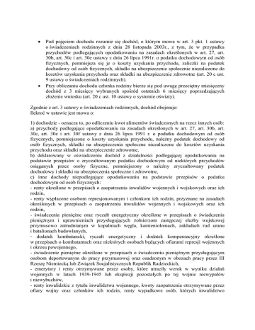 Pod pojęciem dochodu rozumie się dochód, o którym mowa w art. 3 pkt. 1 ustawy o świadczeniach rodzinnych z dnia 28 listopada 2003r., z tym, że w przypadku przychodów podlegających opodatkowaniu na zasadach określonych w art. 27, art. 30b, art. 30c i art. 30e ustawy z dnia 26 lipca 1991r. o podatku dochodowym od osób fizycznych, pomniejsza się je o koszty uzyskania przychodu, zaliczki na podatek dochodowy od osób fizycznych, składki na ubezpieczenie społecznie niezaliczone do kosztów uzyskania przychodu oraz składki na ubezpieczenie zdrowotne (art. 20 c ust. 9 ustawy o świadczeniach rodzinnych). Przy obliczaniu dochodu członka rodziny bierze się pod uwagę przeciętny miesięczny dochód z 3 miesięcy wybranych spośród ostatnich 6 miesięcy poprzedzających złożenie wniosku (art. 20 c ust. 10 ustawy o systemie oświaty). Zgodnie z art. 3 ustawy o świadczeniach rodzinnych, dochód obejmuje: Ilekroć w ustawie jest mowa o: 1) dochodzie - oznacza to, po odliczeniu kwot alimentów świadczonych na rzecz innych osób: a) przychody podlegające opodatkowaniu na zasadach określonych w art. 27, art. 30b, art. 30c, art. 30e i art. 30f ustawy z dnia 26 lipca 1991 r. o podatku dochodowym od osób fizycznych, pomniejszone o koszty uzyskania przychodu, należny podatek dochodowy od osób fizycznych, składki na ubezpieczenia społeczne niezaliczone do kosztów uzyskania przychodu oraz składki na ubezpieczenie zdrowotne, b) deklarowany w oświadczeniu dochód z działalności podlegającej opodatkowaniu na podstawie przepisów o zryczałtowanym podatku dochodowym od niektórych przychodów osiąganych przez osoby fizyczne, pomniejszony o należny zryczałtowany podatek dochodowy i składki na ubezpieczenia społeczne i zdrowotne, c) inne dochody niepodlegające opodatkowaniu na podstawie przepisów o podatku dochodowym od osób fizycznych: - renty określone w przepisach o zaopatrzeniu inwalidów wojennych i wojskowych oraz ich rodzin, - renty wypłacone osobom represjonowanym i członkom ich rodzin, przyznane na zasadach określonych w przepisach o zaopatrzeniu inwalidów wojennych i wojskowych oraz ich rodzin, - świadczenia pieniężne oraz ryczałt energetyczny określone w przepisach o świadczeniu pieniężnym i uprawnieniach przysługujących żołnierzom zastępczej służby wojskowej przymusowo zatrudnianym w kopalniach węgla, kamieniołomach, zakładach rud uranu i batalionach budowlanych, - dodatek kombatancki, ryczałt energetyczny i dodatek kompensacyjny określone w przepisach o kombatantach oraz niektórych osobach będących ofiarami represji wojennych i okresu powojennego, - świadczenie pieniężne określone w przepisach o świadczeniu pieniężnym przysługującym osobom deportowanym do pracy przymusowej oraz osadzonym w obozach pracy przez III Rzeszę Niemiecką lub Związek Socjalistycznych Republik Radzieckich, - emerytury i renty otrzymywane przez osoby, które utraciły wzrok w wyniku działań wojennych w latach 1939-1945 lub eksplozji pozostałych po tej wojnie niewypałów i niewybuchów, - renty inwalidzkie z tytułu inwalidztwa wojennego, kwoty zaopatrzenia otrzymywane przez ofiary wojny oraz członków ich rodzin, renty wypadkowe osób, których inwalidztwo powstało w związku z przymusowym pobytem na robotach w III Rzeszy Niemieckiej w latach 1939-1945, otrzymywane z zagranicy, - zasiłki chorobowe określone w przepisach o ubezpieczeniu społecznym rolników oraz w przepisach o systemie ubezpieczeń społecznych, - środki bezzwrotnej pomocy zagranicznej otrzymywane od rządów państw obcych, organizacji międzynarodowych lub międzynarodowych instytucji finansowych, pochodzące ze środków bezzwrotnej pomocy przyznanych na podstawie jednostronnej deklaracji lub umów zawartych z tymi państwami, organizacjami lub instytucjami przez Radę Ministrów, właściwego ministra lub agencje rządowe, w tym również w przypadkach, gdy przekazanie tych środków jest dokonywane za pośrednictwem podmiotu upoważnionego do rozdzielania środków bezzwrotnej pomocy zagranicznej na rzecz podmiotów, którym służyć ma ta pomoc, - należności ze stosunku pracy lub z tytułu stypendium osób fizycznych mających miejsce zamieszkania na terytorium Rzeczypospolitej Polskiej, przebywających czasowo za granicą w wysokości odpowiadającej równowartości diet z tytułu podróży służbowej poza granicami kraju ustalonych dla pracowników zatrudnionych w państwowych lub samorządowych jednostkach sfery budżetowej na podstawie ustawy z dnia 26 czerwca 1974 r. - Kodeks pracy, - należności pieniężne wypłacone policjantom, żołnierzom, celnikom i pracownikom jednostek wojskowych i jednostek policyjnych użytych poza granicami państwa w celu udziału w konflikcie zbrojnym lub wzmocnienia sił państwa albo państw sojuszniczych, misji pokojowej, akcji zapobieżenia aktom terroryzmu lub ich skutkom, a także należności pieniężne wypłacone żołnierzom, policjantom, celnikom i pracownikom pełniącym funkcje obserwatorów w misjach pokojowych organizacji międzynarodowych i sił wielonarodowych, - należności pieniężne ze stosunku służbowego otrzymywane w czasie służby kandydackiej przez funkcjonariuszy Policji, Państwowej Straży Pożarnej, Straży Granicznej i Biura Ochrony Rządu, obliczone za okres, w którym osoby te uzyskały dochód, - dochody członków rolniczych spółdzielni produkcyjnych z tytułu członkostwa w rolniczej spółdzielni produkcyjnej, pomniejszone o składki na ubezpieczenia społeczne, - alimenty na rzecz dzieci, - stypendia doktoranckie i habilitacyjne przyznane na podstawie ustawy z dnia 14 marca 2003 r. o stopniach naukowych i tytule naukowym oraz o stopniach i tytule w zakresie sztuki (Dz. U. Nr 65, poz. 595, z późn. zm.), stypendia doktoranckie określone w art. 200 ustawy z dnia 27 lipca 2005 r. - Prawo o szkolnictwie wyższym (Dz. U. Nr 164, poz. 1365, z późn. zm.), stypendia sportowe przyznane na p