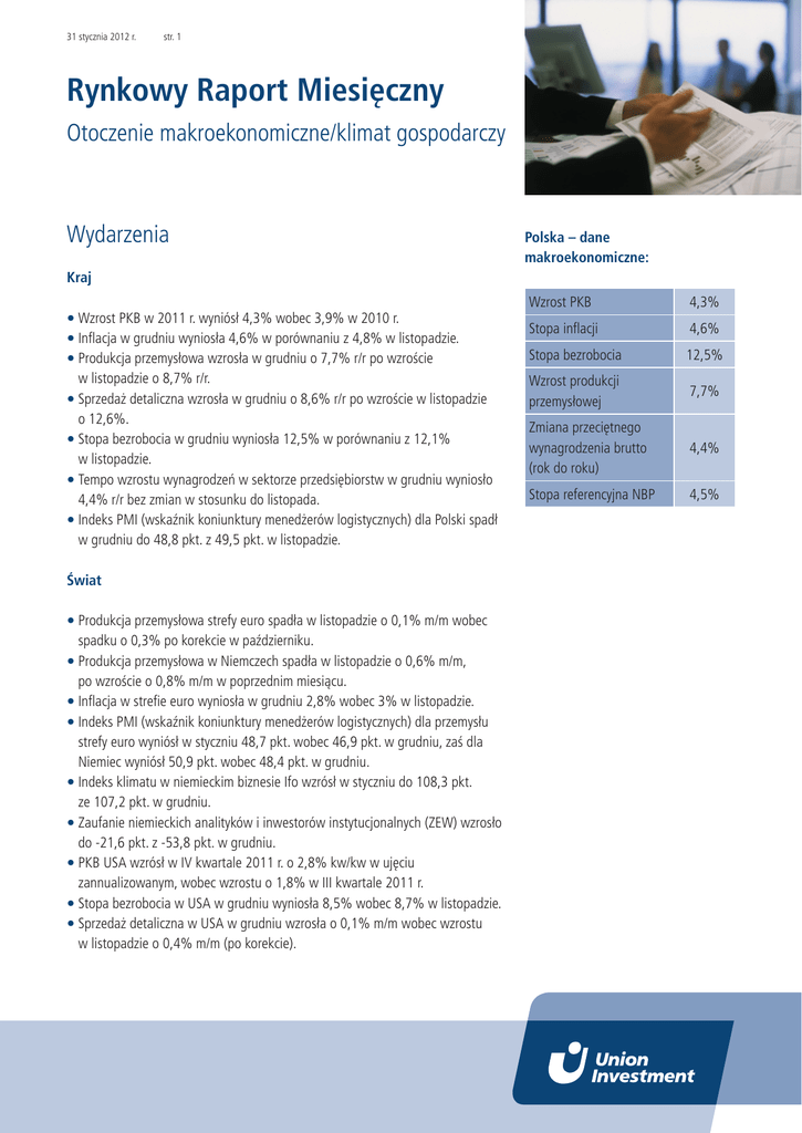 31 stycznia 2012 r. str. 1 Rynkowy Raport Miesięczny Otoczenie makroekonomiczne/klimat gospodarczy Wydarzenia Polska – dane makroekonomiczne: Kraj • Wzrost PKB w 2011 r. wyniósł 4,3% wobec 3,9% w 2010 r. • Inflacja w grudniu wyniosła 4,6% w porównaniu z 4,8% w listopadzie. • Produkcja przemysłowa wzrosła w grudniu o 7,7% r/r po wzroście w listopadzie o 8,7% r/r. • Sprzedaż detaliczna wzrosła w grudniu o 8,6% r/r po wzroście w listopadzie o 12,6%. • Stopa bezrobocia w grudniu wyniosła 12,5% w porównaniu z 12,1% w listopadzie. • Tempo wzrostu wynagrodzeń w sektorze przedsiębiorstw w grudniu wyniosło 4,4% r/r bez zmian w stosunku do listopada. • Indeks PMI (wskaźnik koniunktury menedżerów logistycznych) dla Polski spadł w grudniu do 48,8 pkt. z 49,5 pkt. w listopadzie. Świat • Produkcja przemysłowa strefy euro spadła w listopadzie o 0,1% m/m wobec spadku o 0,3% po korekcie w październiku. • Produkcja przemysłowa w Niemczech spadła w listopadzie o 0,6% m/m, po wzroście o 0,8% m/m w poprzednim miesiącu. • Inflacja w strefie euro wyniosła w grudniu 2,8% wobec 3% w listopadzie. • Indeks PMI (wskaźnik koniunktury menedżerów logistycznych) dla przemysłu strefy euro wyniósł w styczniu 48,7 pkt. wobec 46,9 pkt. w grudniu, zaś dla Niemiec wyniósł 50,9 pkt. wobec 48,4 pkt. w grudniu. • Indeks klimatu w niemieckim biznesie Ifo wzrósł w styczniu do 108,3 pkt. ze 107,2 pkt. w grudniu. • Zaufanie niemieckich analityków i inwestorów instytucjonalnych (ZEW) wzrosło do -21,6 pkt. z -53,8 pkt. w grudniu. • PKB USA wzrósł w IV kwartale 2011 r. o 2,8% kw/kw w ujęciu zannualizowanym, wobec wzrostu o 1,8% w III kwartale 2011 r. • Stopa bezrobocia w USA w grudniu wyniosła 8,5% wobec 8,7% w listopadzie. • Sprzedaż detaliczna w USA w grudniu wzrosła o 0,1% m/m wobec wzrostu w listopadzie o 0,4% m/m (po korekcie). Wzrost PKB 4,3% Stopa inflacji 4,6% Stopa bezrobocia 12,5% Wzrost produkcji przemysłowej 7,7% Zmiana przeciętnego wynagrodzenia brutto (rok do roku) 4,4% Stopa referencyjna NBP 4,5% 31 stycznia 2012 r. str. 2 Rynkowy Raport Miesięczny Otoczenie makroekonomiczne/klimat gospodarczy • Produkcja przemysłowa w USA w grudniu wzrosła o 0,4% m/m po spadku w listopadzie o 0,3%. • Ceny konsumpcyjne w grudniu (inflacja CPI) pozostały w USA bez zmian w ujęciu m/m, podobnie jak w listopadzie. • Wskaźnik ISM (odpowiednik PMI) w przetwórstwie USA wzrósł w grudniu do 53,9 pkt. z 52,7 pkt. w listopadzie. • Indeks zaufania konsumentów w USA Conference Board spadł w styczniu do 61,1 pkt. z 64,8 pkt. w grudniu (po korekcie). • Wskaźnik optymizmu konsumentów Uniwersytetu Michigan wzrósł w styczniu do 75 pkt. z 69,9 pkt. w grudniu. • W USA wskaźnik nastrojów przedsiębiorców Chicago PMI spadł w styczniu do 60,2 pkt. z 62,5 pkt. w grudniu. • W grudniu inflacja w Chinach wyhamowała do 4,1%, najniższego poziomu od 15 miesięcy, z 4,2% w listopadzie. • Indeks cen żywności na świecie FAO w 2011 r. spadł o 5,52%. Zmiana PKB w ciągu ostatnich lat – tempo wzrostu gospodarczego w Polsce utrzymuje się na wysokim poziomie Indeks 105,0 104,5 104,0 103,5 103,0 102,5 102,0 101,5 101,0 100,5 100,0 IV kwartał 2008 II IV kwartał kwartał 2009 Źródło: Reuters EcoWin II IV kwartał kwartał 2010 II kwartał 2011 31 stycznia 2012 r. str. 3 Rynkowy Raport Miesięczny Otoczenie makroekonomiczne/klimat gospodarczy Komentarz Kraj Inflacja w Polsce – wciąż wysoki poziom Indeks 105,0 W grudniu indeks PMI dla Polski obniżył się z 49,5 do 48,8 pkt. (najniższy odczyt od grudnia 2009 r.). Drugi miesiąc z rzędu indeks znajdował się poniżej poziomu 50 pkt., co oznacza obniżenie aktywności ekonomicznej. Spadek wskaźnika PMI wynika przede wszystkim z obniżenia się wskaźnika nowych zamówień (tempo spadku było w tym przypadku najszybsze od czerwca 2009 r.) i kontynuacji spadku zamówień eksportowych. Poprawił się natomiast składnik bieżącej produkcji, choć dynamika wzrostu pozostała niska. Obniżyła się również składowa PMI obrazująca zatrudnienie. Bank Światowy prognozuje, że wzrost PKB w Polsce spowolni w 2012 r. do ok. 2,5%. Zdaniem prezesa NBP Marka Belki prawdopodobieństwo obniżki stóp procentowych w najbliższym czasie maleje, gdyż skala osłabienia koniunktury może okazać się mniejsza, niż sądzono, a inflacja pozostaje wysoka. Złoty się już stabilizuje; jest szansa na jego wzmocnienie. Rada Polityki Pieniężnej nie chce za pomocą polityki pieniężnej wpływać na kurs złotego. Świat Agencja ratingowa S&P obniżyła ocenę kredytową grupie krajów strefy euro. Rating kredytowy Francji oraz Austrii został obniżony z najwyższego możliwego poziomu AAA o jeden stopień, do AA+. Również o jeden poziom zostały obniżone ratingi kredytowe Malty (z A do A-), Słowacji (z A+ do A) i Słowenii (z AA- do A+). O dwa stopnie obniżono rating Portugalii (z BBB- do BB), Włoch (z A do BBB+), Hiszpanii z (AA- do A) i Cypru (z BBB do BB+). Sprzedaż detaliczna w USA w listopadzie wzrosła o 0,1% m/m; był to najmniejszy wzrost od siedmiu miesięcy. Rezerwa Federalna (Fed) ustaliła cel inflacyjny na poziomie 2%. Amerykański bank centralny poinformował, że planuje pozostawić stopy na obecnym, „wyjątkowo niskim” poziomie przynajmniej do końca 2014 r. Indeks ZEW, określający oczekiwania ekspertów finansowych dotyczące stanu koniunktury w niemieckiej gospodarce na kolejne sześć miesięcy, wzrósł w styczniu o rekordowe 32,2 pkt. (najwięcej w ponad 20-letniej historii publikacji) – do poziomu -21,6 pkt. z -53,8 pkt. w grudniu. 104,5 104,0 103,5 103,0 102,5 102,0 101,5 sty kwi lip paź sty kwi lip paź sty kwi lip paź 2010 2011 2009 Źródło: Reuters EcoWin 31 stycznia 2012 r. str. 4 Rynkowy Raport Miesięczny Rynek akcji Wydarzenia Stopy zwrotu sektorów Kraj Styczeń 2012 IT 0,64% 0,64% 14,5 mld zł, czyli był o 38% wyższy niż rok wcześniej. • Zysk netto g