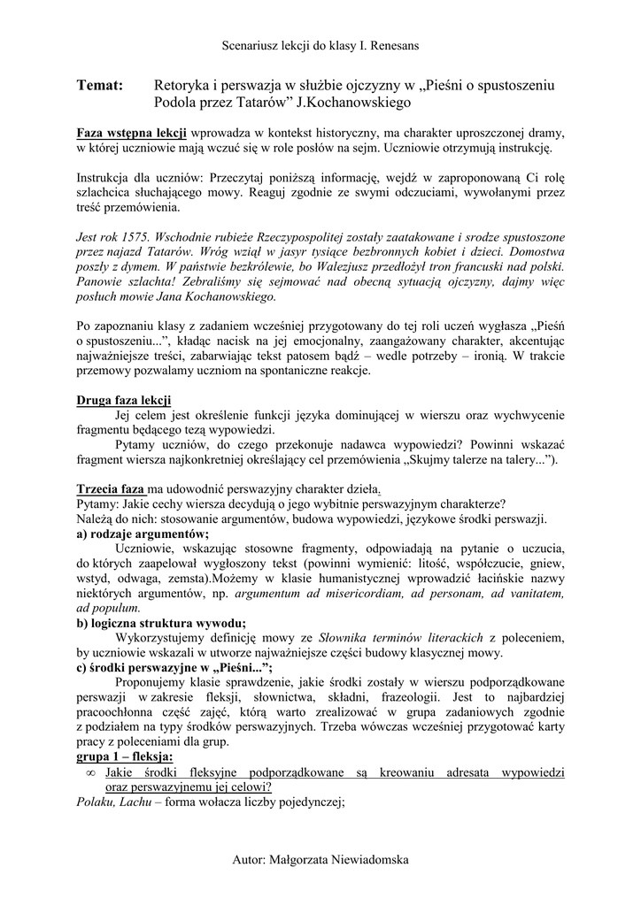 Scenariusz lekcji do klasy I. Renesans Temat: Retoryka i perswazja w słuŜbie ojczyzny w „Pieśni o spustoszeniu Podola przez Tatarów” J.Kochanowskiego Faza wstępna lekcji wprowadza w kontekst historyczny, ma charakter uproszczonej dramy, w której uczniowie mają wczuć się w role posłów na sejm. Uczniowie otrzymują instrukcję. Instrukcja dla uczniów: Przeczytaj poniŜszą informację, wejdź w zaproponowaną Ci rolę szlachcica słuchającego mowy. Reaguj zgodnie ze swymi odczuciami, wywołanymi przez treść przemówienia. Jest rok 1575. Wschodnie rubieŜe Rzeczypospolitej zostały zaatakowane i srodze spustoszone przez najazd Tatarów. Wróg wziął w jasyr tysiące bezbronnych kobiet i dzieci. Domostwa poszły z dymem. W państwie bezkrólewie, bo Walezjusz przedłoŜył tron francuski nad polski. Panowie szlachta! Zebraliśmy się sejmować nad obecną sytuacją ojczyzny, dajmy więc posłuch mowie Jana Kochanowskiego. Po zapoznaniu klasy z zadaniem wcześniej przygotowany do tej roli uczeń wygłasza „Pieśń o spustoszeniu...”, kładąc nacisk na jej emocjonalny, zaangaŜowany charakter, akcentując najwaŜniejsze treści, zabarwiając tekst patosem bądź – wedle potrzeby – ironią. W trakcie przemowy pozwalamy uczniom na spontaniczne reakcje. Druga faza lekcji Jej celem jest określenie funkcji języka dominującej w wierszu oraz wychwycenie fragmentu będącego tezą wypowiedzi. Pytamy uczniów, do czego przekonuje nadawca wypowiedzi? Powinni wskazać fragment wiersza najkonkretniej określający cel przemówienia „Skujmy talerze na talery...”). Trzecia faza ma udowodnić perswazyjny charakter dzieła. Pytamy: Jakie cechy wiersza decydują o jego wybitnie perswazyjnym charakterze? NaleŜą do nich: stosowanie argumentów, budowa wypowiedzi, językowe środki perswazji. a) rodzaje argumentów; Uczniowie, wskazując stosowne fragmenty, odpowiadają na pytanie o uczucia, do których zaapelował wygłoszony tekst (powinni wymienić: litość, współczucie, gniew, wstyd, odwaga, zemsta).MoŜemy w klasie humanistycznej wprowadzić łacińskie nazwy niektórych argumentów, np. argumentum ad misericordiam, ad personam, ad vanitatem, ad populum. b) logiczna struktura wywodu; Wykorzystujemy definicję mowy ze Słownika terminów literackich z poleceniem, by uczniowie wskazali w utworze najwaŜniejsze części budowy klasycznej mowy. c) środki perswazyjne w „Pieśni...”; Proponujemy klasie sprawdzenie, jakie środki zostały w wierszu podporządkowane perswazji w zakresie fleksji, słownictwa, składni, frazeologii. Jest to najbardziej pracoochłonna część zajęć, którą warto zrealizować w grupa zadaniowych zgodnie z podziałem na typy środków perswazyjnych. Trzeba wówczas wcześniej przygotować karty pracy z poleceniami dla grup. grupa 1 – fleksja: • Jakie środki fleksyjne podporządkowane są kreowaniu adresata wypowiedzi oraz perswazyjnemu jej celowi? Polaku, Lachu – forma wołacza liczby pojedynczej; Autor: Małgorzata Niewiadomska Scenariusz lekcji do klasy I. Renesans zbójce nas wojują, nas półmiski trzymają – zaimek „my” odnoszący się do wspólnoty adresata i nadawcy wypowiedzi; skujmy, dajmy – 1.os. l.poj. grupa 2 – słownictwo: • Jakiego słownictwa uŜywa autor, kreśląc straty i winy polskie? (szukanie i wynotowanie stosownych fragmentów) wieczna sromota, nienagrodzona szkoda, łup Ŝałosny – przymiotniki podkreślające wielkość strat i ogrom winy, sromota – rzeczownik nacechowany stylistycznie, sromota to coś więcej niŜ zwykły wstyd, • Jakie środki słownikowe posłuŜyły kreowaniu ofiar najazdu, a jakie kształtują wizerunek wroga? (szukanie iu wynotowanie stosownych fragmentów) pohaniec sprosny, niewierny Turczyn psy zapuścił swoje, którzy zagnali piękne łanie twoje córy szlacheckie... psom bisurmańskim brzydkie ścielą łoŜe zbójce nas wojują, którzy ani miast ani wsi budują tak odbieŜałe stado więc drapają rozbójce wilcy Po wypisaniu cytatów prosimy uczniów o scharakteryzowanie tego słownictwa. Jest tu słownictwo pozytywnie wartościujące, pozytywnie nacechowane stylistycznie i emocjonalnie, które kreuje obraz szlachetnych, dobrych, niewinnych ofiar, z drugiej strony słownictwo negatywnie wartościujące, negatywnie nacechowane stylistycznie i emocjonalnie tworzące obraz najeźdźców – ludu barbarzyńskiego, dzikiego, pogańskiego, niecywilizowanego. Kontrast jako środek perswazji. grupa 3 – składnia: • Jakie rodzaje zdań zostały uŜyte w wierszu? (wypisanie przykładowych typów zdań) Zdania w trybie rozkazującym kierowane do jednostkowego adresata, np. „zetrzy sen z oczu”, „nie ustępuj kroku”, kierowane do wspólnoty nadawcy i adresata, np. „Skujmy talerze na talery”; zdania pytające, np. „Wsiadamy? Czy nas półmiski trzymają?”; wykrzyknienia, np. „śal się mocny BoŜe!” frazeologia (takŜe grupa 3): Gra słów – „skujmy talerze na talery”, trawestacja przysłowia „mądry Polak po szkodzie”: „omył tę zmazę”. figury retoryczne oraz tropy (grupa 4): Jaką funkcję pełnią figury retoryczne oraz tropy wzmacniające perswazyjność wiersza? Figury retoryczne: • apostrofy, np. Polaku!, cny Lachu! – przykuwają uwagę odbiorcy, apelują do poczucia wspólnoty narodowej, odwołują się do dumy narodowej; • wykrzyknienia – podnoszą temperaturę wypowiedzi, wyraŜają zaangaŜowanie mówcy, zapalają emocje odbiorców, • pytania retoryczne – zasiewają wątpliwości („Jakiego serca Turkowi dodamy/jeśli tak lekkim ludzim nie zdołamy?”), zmuszają do refleksji nad własną postawą („Inszy to darmo po drogach miotali/a my nie damy, bychmy w cale trwali?”) • wyliczenia – wykazują bogactwo argumentacji i wagę spraw („Jedny za Dunaj Turkom zaprzedano/drugie do hordy dalekiej zagnano...”) • powtórzenia – wzmacniają wymowę waŜnych fragmentów, wbijają się w pamięć, np. „