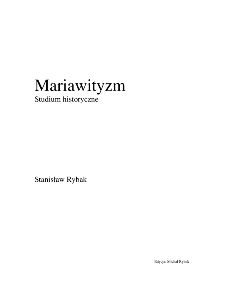 Mariawityzm Studium historyczne Stanisław Rybak Edycja: Michał Rybak SPIS TRE CI SPIS TRE CI.....................................................................................................................................................2 WST P ..............................................................................................................................................................3 GENEZA MARIAWITIZMU............................................................................................................................6 OBJAWIENIE - ZGROMADZENIE KAPŁANÓW MARIAWITÓW.............................................................9 DELEGACJA MARIAWITÓW W RZYMIE .................................................................................................12 ZWI ZEK MARIAWITÓW NIEUSTAJ CEJ ADORACJI UBŁAGANIA.................................................15 DALSZE STARANIA W RZYMIE ................................................................................................................17 PRÓBY LIKWIDACJI MARIAWITYZMU...................................................................................................22 ENCYKLIKA I KL TWA..............................................................................................................................30 LEGALIZACJA MARIAWITYZMU .............................................................................................................37 ORGANIZOWANIE PARAFII MARIAWICKICH .......................................................................................42 OTRZYMANIE SUKCESJI APOSTOLSKIEJ...............................................................................................45 MARIAWITYZM W LATACH 1911-1920 ....................................................................................................47 MIER ZAŁO YCIELKI.............................................................................................................................50 DZIAŁALNO ARCYBISKUPA J. KOWALSKIEGO (1922-1934) .........................................................52 ROZŁAM W MARIAWITYZMIE..................................................................................................................62 WYDAWNICTWA MARIAWICKIE .............................................................................................................66 DZIAŁALNO SPOŁECZNA KO CIOŁA NA RZECZ WIERNYCH .....................................................70 KO CIÓŁ KATOLICKI MARIAWITÓW .....................................................................................................73 KO CIÓŁ STAROKATOLICKI MARIAWITÓW ........................................................................................76 PODSTAWOWE ZASADY WIARY I ORGANIZACJA KO CIOŁA STAROKATOLICKIEGO MARIAWITÓW ..............................................................................................................................................86 PODSTAWOWA KSIFGA OBJAWIE M. FRANCISZKI KOZŁOWSKIEJ.............................................88 NIEKTÓRE WYPOWIEDZI I MY LI M. F. KOZŁOWSKIEJ.................................................................. 103 KALENDARIUM HISTORII MARIAWITYZMU ...................................................................................... 105 ZWIERZCHNICY I BISKUPI MARIAWICCY ........................................................................................... 110 PARAFIE I PLACÓWKI (FILIE) KO CIOŁA STAROKATOLICKIEGO MARIAWITÓW ................... 112 PARAFIE I PLACÓWKI (FILIE) KO CIOŁA KATOLICKIEGOMARIAWITÓW (denominacja felicjanowska) ................................................................................................................................................ 114 BIBLIOGRAFIA ........................................................................................................................................... 115 2 WST P Zbli a si sto lat od powstania mariawityzmu. Najpierw jako ruchu misyjnego w łonie Ko cioła rzymskokatolickiego na ziemiach polskich (w 1893 r.), a nast pnie jako wyodr bnionego, samodzielnego wyznania (w 1906 r.). Nie ma jednak e monografii ani wyczerpuj cego opracowania historii mariawityzmu. W prasie i wydawnictwach okresu przedwojennego, zwłaszcza w formach broszurowych, mariawityzm był raczej przedmiotem szyderstwa i ataków zmierzaj cych do jego zlikwidowania. Nieliczne opracowania powojenne o ko ciołach i zwi zkach wyznaniowych, wyznaniu mariawitów po wi caj niewiele miejsca. Informacje w nich zawarte były niepełne, cz sto nieprawdziwe i bardziej sygnalizowały istnienie mariawitów, ni zawierały rzeczowe dane dotycz ce historii i ideologii mariawityzmu. Sporadyczne naukowe opracowania dotyczyły w skiego kr gu zagadnie , a szczególnie sytuacji prawnej Ko cioła Mariawitów1. Dotychczas nie było opracowania historycznego mariawityzmu równie w wydawnictwach mariawickich, które miały z reguły charakter popularno-apologetyczny2. Ju z tych przyczyn, wyczerpuj ce opracowanie historii mariawityzmu nie jest dzi zadaniem łatwym. Dokumenty ródłowe s rozproszone. Znajduj si w archiwach Ko cioła Starokatolickiego Mariawitów, w du ej mierze w jego denominacji - Ko ciele Katolickim Mariawitów, w archiwach pa stwowych, archiwach kurii biskupich i diecezjalnych Ko cioła rzymskokatolickiego, a w znacznej cz ci równie w Archiwum Watyka skim. Dopiero szczegółowa analiza całej rozproszonej dokumentacji ródłowej mo e pozwoli na pełn i dogł bn monografi historii mariawityzmu. Opracowanie niniejsze nie pretenduje do rangi w pełni wyczerpuj cego temat, ale spo ród dotychczas publikowanych jest najszersze. W pi miennictwie szerzej zajmuj cym si ruchem mariawickim, szczególn uwag po wi ca si przyczynom powstania mariawityzmu i jego wyodr bnieniu w samodzielny Ko ciół. Pomijaj c na razie stanowisko samych mariawitów, co do celu i podstaw powstania ruchu mariawickiego, na wst pie warto si zapozna z pogl dami
