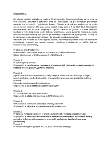 Przypadek 1. Do lekarza pediatry zgłosiła się matka z 16-letnią córką. Dziewczyna skarży się na poranne bóle brzucha, zaburzenia połykania oraz na pojawiającą się po niektórych pokarmach wysypkę (po cytrusach, czekoladzie, kawie). Objawy te stopniowo nasilają się od mniej więcej dwóch miesięcy. Od tego czasu spadek masy ciała o 4 kg. BMI 19,5. Szczególnie doskwierające jest uczucie uwięźnięcia kęsów pokarmu w gardle, potrzeba popijania każdego z nich dużą ilością wody, ból przy przełykaniu. Mama pacjentki narzeka, że córka odstawia kolejne produkty spożywcze, przechodząc stopniowo na płynną dietę - boi się, że to zachowanie ma podłoże psychiczne i że jej córka cierpi na anoreksję. Pacjentka jest leczona od 3 roku życia z powodu atopowego zapalenia skóry, we wczesnym dzieciństwie zdarzały się czasem epizody nietolerancji niektórych produktów, jak np. truskawek czy pomarańczy. W badaniu przedmiotowym: brzuch miękki, niebolesny, wątroba schowana pod łukiem żebrowym. Objaw Blumberga (-), Chełmońskiego (-), Goldflama (-). Pytanie 1. W celu diagnozy zlecisz: Odpowiedź: a. morfologię z rozmazem, b. stężenie IgE całkowite, c. gastroskopię, d. badanie histologiczne wycinków przełyku Pytanie 2. Wyniki przeprowadzonej endoskopii: fałdy okrężne, widoczna trachealizacja przełyku, bruzdy podłużne, grudki, białe naloty, brak rysunku naczyniowego, przekrwienie błony śluzowej. Pacjentka cierpi najprawdopodobniej na: Odpowiedź: c. eozynofilowe zapalenie przełyku Pytanie 3. W początkowym leczeniu zastosujesz: Odpowiedź: a. dietę eliminacyjną, c. GKS miejscowo Pytanie 4. Wskaż zdania prawdziwe dotyczące choroby pacjentki: Odpowiedź: a. choroba występuje częściej u mężczyzn Pytanie 5. W badaniu histopatologicznym w przebiegu tej choroby możesz zaobserwować: Odpowiedź: a. obecność eozynofilów w nabłonku i pozostałych warstwach ściany przełyku, b. liczne mikroropnie, c. przerost i wydłużenie brodawek warstwy podstawnej Pytanie 6. W kryteriach diagnostycznych ACG z 2013 roku danej choroby: Odpowiedź: c. należy wykluczyć takie choroby jak np. ch. Leśniowskiego - Crohna czy pęcherzyce, d. należy obserwować reakcję na leczenie IPP