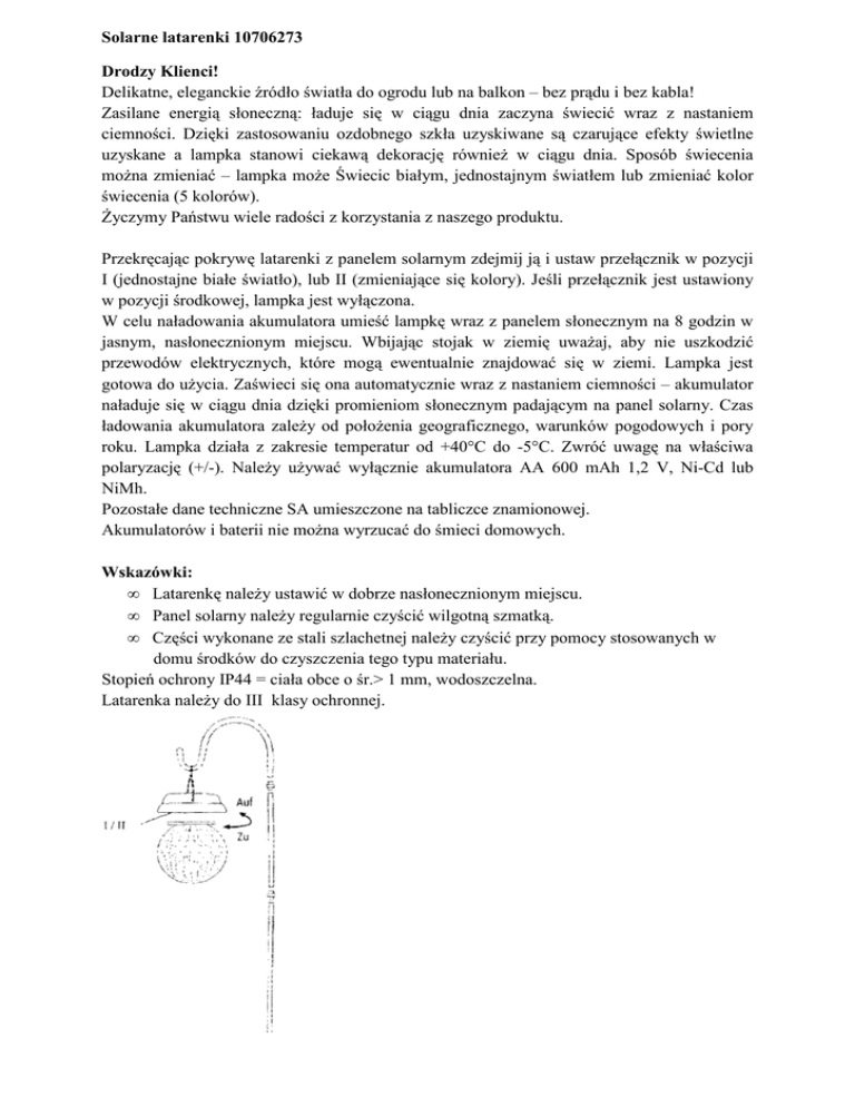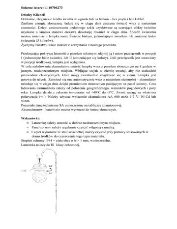 Solarne latarenki 10706273 Drodzy Klienci! Delikatne, eleganckie źródło światła do ogrodu lub na balkon – bez prądu i bez kabla! Zasilane energią słoneczną: ładuje się w ciągu dnia zaczyna świecić wraz z nastaniem ciemności. Dzięki zastosowaniu ozdobnego szkła uzyskiwane są czarujące efekty świetlne uzyskane a lampka stanowi ciekawą dekorację również w ciągu dnia. Sposób świecenia można zmieniać – lampka może Świecic białym, jednostajnym światłem lub zmieniać kolor świecenia (5 kolorów). Życzymy Państwu wiele radości z korzystania z naszego produktu. Przekręcając pokrywę latarenki z panelem solarnym zdejmij ją i ustaw przełącznik w pozycji I (jednostajne białe światło), lub II (zmieniające się kolory). Jeśli przełącznik jest ustawiony w pozycji środkowej, lampka jest wyłączona. W celu naładowania akumulatora umieść lampkę wraz z panelem słonecznym na 8 godzin w jasnym, nasłonecznionym miejscu. Wbijając stojak w ziemię uważaj, aby nie uszkodzić przewodów elektrycznych, które mogą ewentualnie znajdować się w ziemi. Lampka jest gotowa do użycia. Zaświeci się ona automatycznie wraz z nastaniem ciemności – akumulator naładuje się w ciągu dnia dzięki promieniom słonecznym padającym na panel solarny. Czas ładowania akumulatora zależy od położenia geograficznego, warunków pogodowych i pory roku. Lampka działa z zakresie temperatur od +40°C do -5°C. Zwróć uwagę na właściwa polaryzację (+/-). Należy używać wyłącznie akumulatora AA 600 mAh 1,2 V, Ni-Cd lub NiMh. Pozostałe dane techniczne SA umieszczone na tabliczce znamionowej. Akumulatorów i baterii nie można wyrzucać do śmieci domowych. Wskazówki: • Latarenkę należy ustawić w dobrze nasłonecznionym miejscu. • Panel solarny należy regularnie czyścić wilgotną szmatką. • Części wykonane ze stali szlachetnej należy czyścić przy pomocy stosowanych w domu środków do czyszczenia tego typu materiału. Stopień ochrony IP44 = ciała obce o śr.> 1 mm, wodoszczelna. Latarenka należy do III klasy ochronnej.