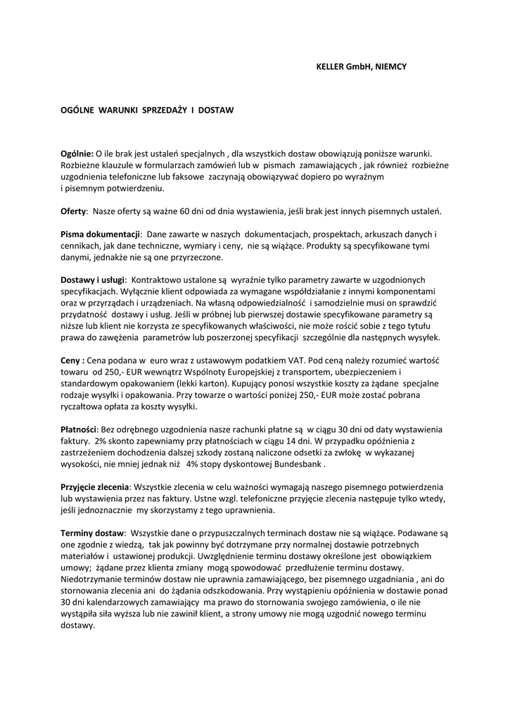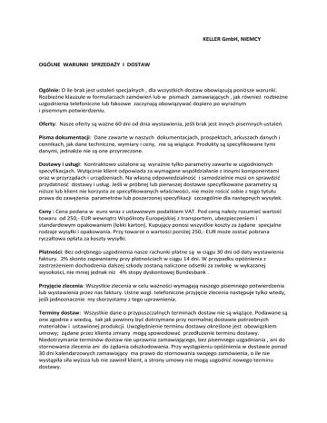 KELLER GmbH, NIEMCY OGÓLNE WARUNKI SPRZEDAŻY I DOSTAW Ogólnie: O ile brak jest ustaleń specjalnych , dla wszystkich dostaw obowiązują poniższe warunki. Rozbieżne klauzule w formularzach zamówień lub w pismach zamawiających , jak również rozbieżne uzgodnienia telefoniczne lub faksowe zaczynają obowiązywać dopiero po wyraźnym i pisemnym potwierdzeniu. Oferty: Nasze oferty są ważne 60 dni od dnia wystawienia, jeśli brak jest innych pisemnych ustaleń. Pisma dokumentacji: Dane zawarte w naszych dokumentacjach, prospektach, arkuszach danych i cennikach, jak dane techniczne, wymiary i ceny, nie są wiążące. Produkty są specyfikowane tymi danymi, jednakże nie są one przyrzeczone. Dostawy i usługi: Kontraktowo ustalone są wyraźnie tylko parametry zawarte w uzgodnionych specyfikacjach. Wyłącznie klient odpowiada za wymagane współdziałanie z innymi komponentami oraz w przyrządach i urządzeniach. Na własną odpowiedzialność i samodzielnie musi on sprawdzić przydatność dostawy i usług. Jeśli w próbnej lub pierwszej dostawie specyfikowane parametry są niższe lub klient nie korzysta ze specyfikowanych właściwości, nie może rościć sobie z tego tytułu prawa do zawężenia parametrów lub poszerzonej specyfikacji szczególnie dla następnych wysyłek. Ceny : Cena podana w euro wraz z ustawowym podatkiem VAT. Pod ceną należy rozumieć wartość towaru od 250,- EUR wewnątrz Wspólnoty Europejskiej z transportem, ubezpieczeniem i standardowym opakowaniem (lekki karton). Kupujący ponosi wszystkie koszty za żądane specjalne rodzaje wysyłki i opakowania. Przy towarze o wartości poniżej 250,- EUR może zostać pobrana ryczałtowa opłata za koszty wysyłki. Płatności: Bez odrębnego uzgodnienia nasze rachunki płatne są w ciągu 30 dni od daty wystawienia faktury. 2% skonto zapewniamy przy płatnościach w ciągu 14 dni. W przypadku opóźnienia z zastrzeżeniem dochodzenia dalszej szkody zostaną naliczone odsetki za zwłokę w wykazanej wysokości, nie mniej jednak niż 4% stopy dyskontowej Bundesbank . Przyjęcie zlecenia: Wszystkie zlecenia w celu ważności wymagają naszego pisemnego potwierdzenia lub wystawienia przez nas faktury. Ustne wzgl. telefoniczne przyjęcie zlecenia następuje tylko wtedy, jeśli jednoznacznie my skorzystamy z tego uprawnienia. Terminy dostaw: Wszystkie dane o przypuszczalnych terminach dostaw nie są wiążące. Podawane są one zgodnie z wiedzą, tak jak powinny być dotrzymane przy normalnej dostawie potrzebnych materiałów i ustawionej produkcji. Uwzględnienie terminu dostawy określone jest obowiązkiem umowy; żądane przez klienta zmiany mogą spowodować przedłużenie terminu dostawy. Niedotrzymanie terminów dostaw nie uprawnia zamawiającego, bez pisemnego uzgadniania , ani do stornowania zlecenia ani do żądania odszkodowania. Przy wystąpieniu opóźnienia w dostawie ponad 30 dni kalendarzowych zamawiający ma prawo do stornowania swojego zamówienia, o ile nie wystąpiła siła wyższa lub nie zawinił klient, a strony umowy nie mogą uzgodnić nowego terminu dostawy. Transport: Transport towaru następuje zawsze na ryzyko klienta. Reklamacje o stracie i opóźnieniu należy kierować bezpośrednio po ich stwierdzeniu, te o uszkodzeniu towaru po ich otrzymaniu do właściwej placówki transportowej. Zastrzeżenie prawa własności: Sprzedający zastrzega sobie prawo własności przedmiotu dostawy do chwili zrealizowania wszystkich jego wierzytelności wynikających z kontaktów handlowych z kupującym. Kupujący ponosi ryzyko za wszystkie towary i materiały, o ile te po dostawie okażą się uszkodzone lub zniszczone. Przedłużone prawo własności: Roszczenia zamawiającego ze wszystkimi prawami ubocznymi z dalszej sprzedaży zastrzeżonego towaru przechodzą na dostawcę. Gwarancja: - gwarantujemy, że nasze przyrządy produkowane są bez skazy i zgodnie ze stanem rzeczy. - Zamawiający sprawdza, czy dany produkt nadaje się do przewidywanego zastosowania. - Dla czytnika wartości pomiaru, kabla, przyrządów elektronicznych i adaptera okres gwarancji wynosi 12 miesięcy liczone od daty dostawy. - Baterie są wykluczone z gwarancji. - Gwarancja rozciąga się zawsze zgodnie z wyborem dostawcy na naprawę lub wymianę wadliwego towaru albo też uznanie notą. - Wymienione części są własnością dostawcy. - Opisana powyżej gwarancja obowiązuje tylko wtedy, jeśli przestrzegano warunków transportu, magazynowania i użytkowania. - W przypadku gwarancji kupujący ponosi wszystkie koszty transportu zwrotnego od pierwotnego miejsca dostawy ustalonego w umowie. Przy uznaniu gwarancji KELLER GmbH ponosi koszty ponownej dostawy do pierwotnego miejsca dostawy ustalonego w umowie. Pozostałe koszty zainstalowania, demontażu i koszty transportu nie będą zwracane. - Jeśli w okresie gwarancji towar zostanie wysłany do nas jako wadliwy , a wady nie zostanie stwierdzona, KELLER GmbH zastrzega sobie prawo na doliczenie ryczałtu w wysokości EUR 42,50. Zastrzega się prawo na doliczenie dalszych wydatków. Reklamacje: Reklamacje muszą zostać zgłoszone na piśmie sprzedającemu niezwłocznie, najpóźniej 8 dni po otrzymaniu towaru w miejscu przeznaczenia, przy wadach ukrytych w ciągu ośmiu dni od ich odkrycia. Jeśli stan przyrządów został słusznie reklamowany oraz pod warunkiem, że klient podał wszystkie niezbędne informacje, zastrzegamy sobie prawo wyboru jej załatwienia poprzez dostawę zastępczą, naprawę bądź uznanie notą. Jeśli w dostawie próbnej lub pierwszej określone specyfikacje jak np. linearność czujnika ciśnienia będą jednoznacznie zaniżone (lepsze) w stosunku do specyfikacji arkuszy danych, nie wynika stąd prawo do zawężonej (lepszej) specyfikacji. Ograniczenie odpowiedzialności: Odpowiedzialność KELLER GmbH jest jednoznacznie ograniczona do należytej funkcji naszej dostawy i usługi zgodnie z pisemnie uzgodnionymi specyfikacjami. Wyklucza się odpowi
