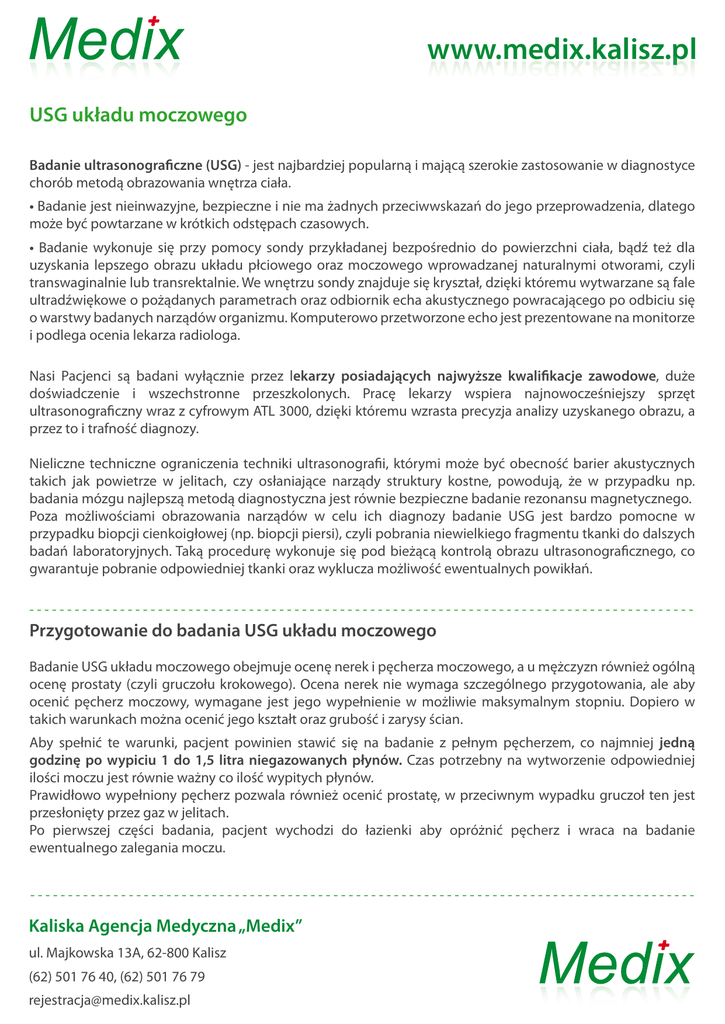 www.medix.kalisz.pl USG układu moczowego Badanie ultrasonograficzne (USG) - jest najbardziej popularną i mającą szerokie zastosowanie w diagnostyce chorób metodą obrazowania wnętrza ciała. • Badanie jest nieinwazyjne, bezpieczne i nie ma żadnych przeciwwskazań do jego przeprowadzenia, dlatego może być powtarzane w krótkich odstępach czasowych. • Badanie wykonuje się przy pomocy sondy przykładanej bezpośrednio do powierzchni ciała, bądź też dla uzyskania lepszego obrazu układu płciowego oraz moczowego wprowadzanej naturalnymi otworami, czyli transwaginalnie lub transrektalnie. We wnętrzu sondy znajduje się kryształ, dzięki któremu wytwarzane są fale ultradźwiękowe o pożądanych parametrach oraz odbiornik echa akustycznego powracającego po odbiciu się o warstwy badanych narządów organizmu. Komputerowo przetworzone echo jest prezentowane na monitorze i podlega ocenia lekarza radiologa. Nasi Pacjenci są badani wyłącznie przez lekarzy posiadających najwyższe kwalifikacje zawodowe, duże doświadczenie i wszechstronne przeszkolonych. Pracę lekarzy wspiera najnowocześniejszy sprzęt ultrasonograficzny wraz z cyfrowym ATL 3000, dzięki któremu wzrasta precyzja analizy uzyskanego obrazu, a przez to i trafność diagnozy. Nieliczne techniczne ograniczenia techniki ultrasonografii, którymi może być obecność barier akustycznych takich jak powietrze w jelitach, czy osłaniające narządy struktury kostne, powodują, że w przypadku np. badania mózgu najlepszą metodą diagnostyczna jest równie bezpieczne badanie rezonansu magnetycznego. Poza możliwościami obrazowania narządów w celu ich diagnozy badanie USG jest bardzo pomocne w przypadku biopcji cienkoigłowej (np. biopcji piersi), czyli pobrania niewielkiego fragmentu tkanki do dalszych badań laboratoryjnych. Taką procedurę wykonuje się pod bieżącą kontrolą obrazu ultrasonograficznego, co gwarantuje pobranie odpowiedniej tkanki oraz wyklucza możliwość ewentualnych powikłań. ---------------------------------------------------------------------------------------- Przygotowanie do badania USG układu moczowego Badanie USG układu moczowego obejmuje ocenę nerek i pęcherza moczowego, a u mężczyzn również ogólną ocenę prostaty (czyli gruczołu krokowego). Ocena nerek nie wymaga szczególnego przygotowania, ale aby ocenić pęcherz moczowy, wymagane jest jego wypełnienie w możliwie maksymalnym stopniu. Dopiero w takich warunkach można ocenić jego kształt oraz grubość i zarysy ścian. Aby spełnić te warunki, pacjent powinien stawić się na badanie z pełnym pęcherzem, co najmniej jedną godzinę po wypiciu 1 do 1,5 litra niegazowanych płynów. Czas potrzebny na wytworzenie odpowiedniej ilości moczu jest równie ważny co ilość wypitych płynów. Prawidłowo wypełniony pęcherz pozwala również ocenić prostatę, w przeciwnym wypadku gruczoł ten jest przesłonięty przez gaz w jelitach. Po pierwszej części badania, pacjent wychodzi do łazienki aby opróżnić pęcherz i wraca na badanie ewentualnego zalegania moczu. ---------------------------------------------------------------------------------------- Kaliska Agencja Medyczna „Medix” ul. Majkowska 13A, 62-800 Kalisz (62) 501 76 40, (62) 501 76 79 [email protected] www.medix.kalisz.pl Na badanie należy (w miarę możliwości) przynieść wyniki poprzednich badań USG danej okolicy, lub wyniki innych badan - dotyczących tego problemu. Badanie jest niebolesne i nie ma żadnych przeciwwskazań do jego wykonania (nawet w ciąży). ---------------------------------------------------------------------------------------- Kaliska Agencja Medyczna „Medix” ul. Majkowska 13A, 62-800 Kalisz (62) 501 76 40, (62) 501 76 79 [email protected]