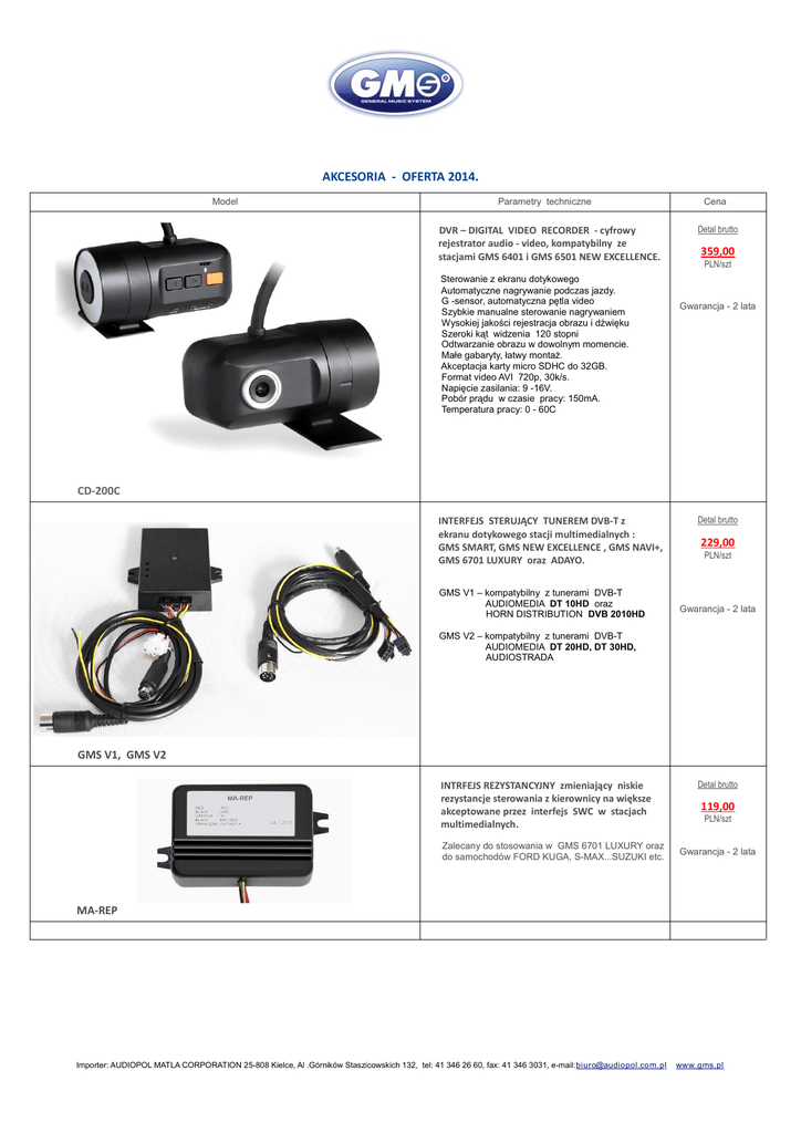 AKCESORIA - OFERTA 2014. Model Parametry techniczne DVR – DIGITAL VIDEO RECORDER - cyfrowy rejestrator audio - video, kompatybilny ze stacjami GMS 6401 i GMS 6501 NEW EXCELLENCE. Sterowanie z ekranu dotykowego Automatyczne nagrywanie podczas jazdy. G -sensor, automatyczna pętla video Szybkie manualne sterowanie nagrywaniem Wysokiej jakości rejestracja obrazu i dźwięku Szeroki kąt widzenia 120 stopni Odtwarzanie obrazu w dowolnym momencie. Małe gabaryty, łatwy montaż. Akceptacja karty micro SDHC do 32GB. Format video AVI 720p, 30k/s. Napięcie zasilania: 9 -16V. Pobór prądu w czasie pracy: 150mA. Temperatura pracy: 0 - 60C Cena Detal brutto 359,00 PLN/szt Gwarancja - 2 lata CD-200C INTERFEJS STERUJĄCY TUNEREM DVB-T z ekranu dotykowego stacji multimedialnych : GMS SMART, GMS NEW EXCELLENCE , GMS NAVI+, GMS 6701 LUXURY oraz ADAYO. GMS V1 – kompatybilny z tunerami DVB-T AUDIOMEDIA DT 10HD oraz HORN DISTRIBUTION DVB 2010HD Detal brutto 229,00 PLN/szt Gwarancja - 2 lata GMS V2 – kompatybilny z tunerami DVB-T AUDIOMEDIA DT 20HD, DT 30HD, AUDIOSTRADA GMS V1, GMS V2 INTRFEJS REZYSTANCYJNY zmieniający niskie rezystancje sterowania z kierownicy na większe akceptowane przez interfejs SWC w stacjach multimedialnych. Zalecany do stosowania w GMS 6701 LUXURY oraz do samochodów FORD KUGA, S-MAX...SUZUKI etc. Detal brutto 119,00 PLN/szt Gwarancja - 2 lata MA-REP Importer: AUDIOPOL MATLA CORPORATION 25-808 Kielce, Al .Górników Staszicowskich 132, tel: 41 346 26 60, fax: 41 346 3031, e-mail:[email protected] l www.gms.pl