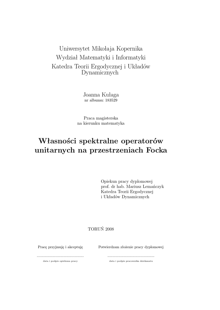 Operatory unitarne na przestrzeniach Focka związane są z układami dynamicznymi Gaussa ([7], [10]) i Poissona ([15]). Przestrzenie Focka są również ważnym narzędziem w mechanice kwantowej. Przy ich pomocy można