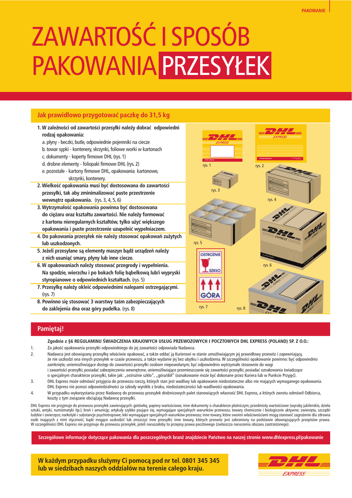PAKOWANIE ZAWARTOŚĆ I SPOSÓB PAKOWANIA PRZESYŁEK Jak prawidłowo przygotować paczkę do 31,5 kg Proszę sprawdzić zgodność numeru koperty z zapisem na liście przewozowym SPRAWDZ DROG¢ SWOJEJ PRZESY¸KI FOLIOPAK EKSPRESOWY www.servisco.com.pl KOPERTA EKSPRESOWA rys. 1 rys. 2 S MAŁY (245x M ŚRED 235x105) NI (49 L DUŻY 5x235x210) (495x XL BARD 470x210) S MAŁY (245x 235x1 05) M ŚREDN I (495x 235x2 10) L DUŻY (495x 470x2 10) XL BARD ZO DUŻY (495x 470x4 20) rys. 3 ZO DU ŻY (49 5x47 0x42 0) rys. 4 ZO DU X L (4 9 5 x4 7 0 x4 2 0 ) S MAŁY (245x M ŚRED 235x105) NI (49 L DUŻY 5x235x210) (495x XL BARD 470x210) ŻY (49 5x47 0x42 0) rys. 5 XL (4 95x470 x420) (4 XL 0) x42 470 95x L (4 9 5 x4 7 0 x4 2 0 ) rys. 6 X 1. W zależności od zawartości przesyłki należy dobrać odpowiedni rodzaj opakowania: a. płyny - beczki, butle, odpowiednie pojemniki na ciecze b. towar sypki - kontenery, skrzynki, foliowe worki w kartonach c. dokumenty - koperty firmowe DHL (rys. 1) d. drobne elementy - foliopaki firmowe DHL (rys. 2) e. pozostałe - kartony firmowe DHL, opakowania kartonowe, skrzynki, kontenery. 2. Wielkość opakowania musi być dostosowana do zawartości przesyłki, tak aby zminimalizować puste przestrzenie wewnątrz opakowania. (rys. 3, 4, 5, 6) 3. Wytrzymałość opakowania powinna być dostosowana do ciężaru oraz kształtu zawartości. Nie należy formować z kartonu nieregularnych kształtów, tylko użyć większego opakowania i puste przestrzenie uzupełnić wypełniaczem. 4. Do pakowania przesyłek nie należy stosować opakowań zużytych lub uszkodzonych. 5. Jeżeli przesyłane są elementy maszyn bądź urządzeń należy z nich usuniąć smary, płyny lub inne ciecze. 6. W opakowaniach należy stosować przegrody i wypełnienia. Na spodzie, wierzchu i po bokach folię bąbelkową lub/i wypryski styropianowe o odpowiednich kształtach. (rys. 5) 7. Przesyłkę należy okleić odpowiednimi nalepami ostrzegającymi. (rys. 7) 8. Powinno się stosować 3 warstwy taśm zabezpieczających do zaklejenia dna oraz góry pudełka. (rys. 8) rys. 7 rys. 8 Pamiętaj! Zgodnie z §6 REGULAMINU ŚWIADCZENIA KRAJOWYCH USŁUG PRZEWOZOWYCH I POCZTOWYCH DHL EXPRESS (POLAND) SP. Z O.O.: 1. 2. 3. 4. Za jakość opakowania przesyłki odpowiedniego do jej zawartości odpowiada Nadawca. Nadawca jest obowiązany przesyłkę właściwie opakować, a także oddać ją Kurierowi w stanie umożliwiającym jej prawidłowy przewóz i zapewniający, że nie uszkodzi ona innych przesyłek w czasie przewozu, a także wydanie jej bez ubytku i uszkodzenia. W szczególności opakowanie powinno: być odpowiednio zamknięte, uniemożliwiające dostęp do zawartości przesyłki osobom niepowołanym; być odpowiednio wytrzymałe stosownie do wagi i zawartości przesyłki; posiadać zabezpieczenia wewnętrzne, uniemożliwiające przemieszczanie się zawartości przesyłki; posiadać oznakowania świadczące o specjalnym charakterze przesyłki, takie jak: „ostrożnie szkło”, „góra/dół” (oznakowanie może być dokonane przez Kuriera lub w Punkcie Przyjęć). DHL Express może odmówić przyjęcia do przewozu rzeczy, których stan jest wadliwy lub opakowanie niedostateczne albo nie mających wymaganego opakowania. DHL Express nie ponosi odpowiedzialności za szkody wynikłe z braku, niedostateczności lub wadliwości opakowania. W przypadku wykorzystania przez Nadawcę do przewozu przesyłek drobnicowych palet stanowiących własność DHL Express, a których zwrotu odmówił Odbiorca, koszty z tym związane obciążają Nadawcę przesyłki. DHL Express nie przyjmuje do przewozu przesyłek zawierających: gotówkę, papiery wartościowe, inne dokumenty o charakterze płatniczym; przedmioty wartościowe (wyroby jubilerskie, dzieła sztuki, antyki, numizmatyki itp.); broń i amunicję; artykuły szybko psujące się, wymagające specjalnych warunków przewozu; towary chemicznie i biologicznie aktywne; zwierzęta, szczątki ludzkie i zwierzęce; narkotyki i substancje psychotropowe; leki wymagające specjalnych warunków przewozu; inne towary, które swoimi właściwościami mogą stanowić zagrożenie dla zdrowia osób mających z nimi styczność, bądź mogące uszkodzić lub zniszczyć inne przesyłki; inne towary, których przewóz jest zabroniony na podstawie obowiązujących przepisów prawa. W szczególności DHL Express nie przyjmuje do przewozu przesyłek, jeżeli naruszałoby to przepisy prawa pocztowego (zwłaszcza naruszenia obszaru zastrzeżonego). Szczegółowe informacje dotyczące pakowania dla poszczególnych branż znajdziecie Państwo na naszej stronie www.dhlexpress.pl/pakowanie W każdym przypadku służymy Ci pomocą pod nr tel. 0801 345 345 lub w siedzibach naszych oddziałów na terenie całego kraju.