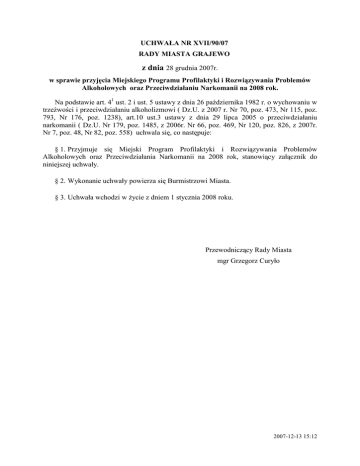 UCHWAŁA NR XVII/90/07 RADY MIASTA GRAJEWO z dnia 28 grudnia 2007r. w sprawie przyjęcia Miejskiego Programu Profilaktyki i Rozwiązywania Problemów Alkoholowych oraz Przeciwdziałaniu Narkomanii na 2008 rok. Na podstawie art. 41 ust. 2 i ust. 5 ustawy z dnia 26 października 1982 r. o wychowaniu w trzeźwości i przeciwdziałaniu alkoholizmowi ( Dz.U. z 2007 r. Nr 70, poz. 473, Nr 115, poz. 793, Nr 176, poz. 1238), art.10 ust.3 ustawy z dnia 29 lipca 2005 o przeciwdziałaniu narkomanii ( Dz.U. Nr 179, poz. 1485, z 2006r. Nr 66, poz. 469, Nr 120, poz. 826, z 2007r. Nr 7, poz. 48, Nr 82, poz. 558) uchwala się, co następuje: § 1. Przyjmuje się Miejski Program Profilaktyki i Rozwiązywania Problemów Alkoholowych oraz Przeciwdziałania Narkomanii na 2008 rok, stanowiący załącznik do niniejszej uchwały. § 2. Wykonanie uchwały powierza się Burmistrzowi Miasta. § 3. Uchwała wchodzi w Ŝycie z dniem 1 stycznia 2008 roku. Przewodniczący Rady Miasta mgr Grzegorz Curyło 2007-12-13 15:12 Załącznik do Uchwały Nr XVII/90/07 Rady Miasta Grajewo z dnia 28 grudnia 2007r. MIEJSKI PROGRAM PROFILAKTYKI I ROZWIĄZYWANIA PROBLEMÓW ALKOHOLOWYCH ORAZ PRZECIWDZIAŁANIA NARKOMANII NA 2008 ROK. I. POSTANOWIENIA OGÓLNE § 1. 1. Zadania związane z prowadzeniem działań profilaktycznych i rozwiązywaniem problemów alkoholowych naleŜą do zadań własnych gmin zgodnie z art. 41 ust.1 ustawy z dnia 26 października 1982r. o wychowaniu w trzeźwości i przeciwdziałaniu alkoholizmowi ( Dz.U. z 2007 r. Nr 70, poz. 473, Nr 115, poz. 793, Nr 176, poz. 1238), zwanej dalej ustawą. Zadania miasta w zakresie profilaktyki i rozwiązywania problemów alkoholowych i narkomanii obejmują: 1) zwiększanie dostępności pomocy terapeutycznej i rehabilitacyjnej dla osób uzaleŜnionych od alkoholu i narkomanii, 2) udzielanie rodzinom, w których występują problemy alkoholowe, pomocy psychospołecznej i prawnej, a w szczególności ochrony przed przemocą w rodzinie, 3) prowadzenie profilaktycznej działalności informacyjnej i edukacyjnej w zakresie rozwiązywania problemów alkoholowych i przeciwdziałania narkomanii, w szczególności dla dzieci i młodzieŜy, w tym prowadzenie pozalekcyjnych zajęć sportowych, a takŜe działań na rzecz doŜywiania dzieci uczestniczących w pozalekcyjnych programach opiekuńczo-wychowawczych i socjoterapeutycznych, 4) wspomaganie działalności instytucji, stowarzyszeń i osób fizycznych, słuŜącej rozwiązywaniu problemów alkoholowych i narkomanii, 5) podejmowanie interwencji w związku z naruszeniem przepisów określonych w art. 131 i 15 ustawy oraz występowanie przed sądem w charakterze oskarŜyciela publicznego, 6) wspieranie zatrudnienia socjalnego poprzez organizowanie i finansowanie centrów integracji społecznej. Miejski Program Profilaktyki i Rozwiązywania Problemów Alkoholowych oraz Przeciwdziałania Narkomanii na 2008r. jest kontynuacją zadań realizowanych w mieście w latach poprzednich. Program oparty jest na bazie Narodowego Programu Rozwiązywania Problemów Alkoholowych, przyjętego przez Rząd RP na posiedzeniu w dniu 26 września 2000 roku, Krajowego Programu Przeciwdziałania Narkomanii oraz na analizie stanu problemów alkoholowych na terenie Miasta Grajewo, stanowiącej załącznik do niniejszego programu. PowyŜszy program jest kontynuacją zadań realizowanych w mieście Grajewo od kilku lat. Z uwagi na niejednokrotne powiązanie problemów alkoholowych z zaŜywaniem 2007-12-13 15:12 środków psychoaktywnych, niniejszy program został rozszerzony o dodatkowe elementy dotyczące problemu narkomanii. Program ten adresowany jest do wszystkich placówek, instytucji, stowarzyszeń oraz wszystkich mieszkańców naszego miasta zainteresowanych współpracą w zakresie rozwiązywania problemów alkoholowych i innych uzaleŜnień. Program obejmuje zadania do realizacji od 1 stycznia 2008r. do dnia 31 grudnia 2008 roku. Realizatorem i koordynatorem programu w zakresie przeciwdziałaniu alkoholizmowi jest Pełnomocnik Burmistrza Miasta ds. Rozwiązywania Problemów Alkoholowych, natomiast w zakresie przeciwdziałania narkomanii jest Pełnomocnik Burmistrza Miasta ds. Rozwiązywania Problemów Alkoholowych oraz pracownicy Miejskiego Osrodka Pomocy Społecznej w Grajewie. II. CELE STRATEGICZNE PROGRAMU § 2. 1. Cele ogólne: 1) zmniejszenie rozmiarów istniejących juŜ problemów alkoholowych i narkomanii, 2) podnoszenie świadomości mieszkańców miasta Grajewo w zakresie zagroŜeń związanych ze spoŜywaniem alkoholu, 3) budowanie wsparcia dla działań na rzecz zdrowia publicznego. 2. Cele operacyjne programu: 1) zwiększenie dostępności i skuteczności profesjonalnej terapii dla osób uzaleŜnionych i współuzaleŜnionych członków rodzin, 2) zwiększenie dostępności pomocy socjalnej, psychologicznej i socjoterapeutycznej wobec dzieci i młodzieŜy z rodzin z problemami alkoholowymi w domu, 3) wdroŜenie nowoczesnych form profilaktyki kierowanej w szczególności do dzieci i młodzieŜy, 4) rozwinięcie profilaktyki rodzinnej – uczenie rodziców umiejętności wspierania abstynencji dzieci (edukacja dorosłych), 5) promocja zdrowego stylu Ŝycia – profilaktyka poprzez sport, 6) kontrola działalności gospodarczej w zakresie obrotu napojami alkoholowymi poprzez konsekwentne egzekwowanie zakazu podawania i sprzedaŜy alkoholu nieletnim. III. ZADANIA PROGRAMU Zadanie 1 § 3. 1. Zwiększenie dostępności pomocy terapeutycznej i rehabilitacyjnej dla osób uzaleŜnionych i osób zagroŜonych uzaleŜnieniem : 1) zapewnienie pomocy terapeutycznej dla osób uzaleŜnionych od alkoholu i narkotyków w ramach działalności Klubu „Zdrowie i Trzeźwość”, 2) prowadzenie punktu konsultacyjnego dla osób uzaleŜnionych i współuzaleznionych od alkoholu i narkotyków: a) zatrudnienie psychoterapeuty oraz psychologa, 2007-12-13 15:12 b) prowadzenie działań mających na celu poprawienie funkcjonowania rodziny, w której występuje prob