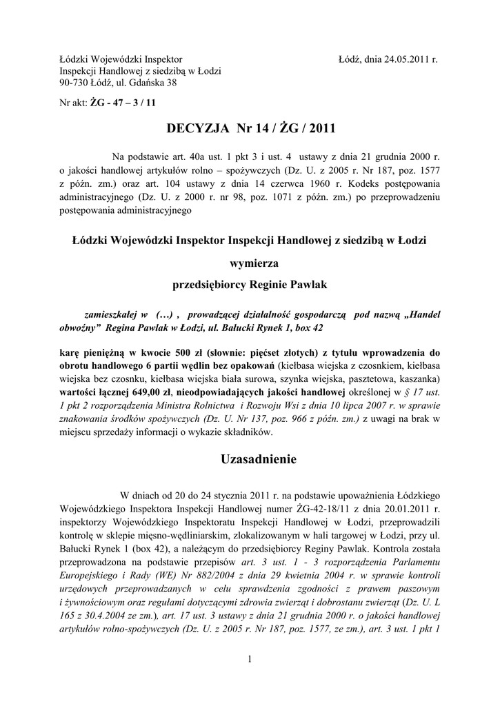 Łódzki Wojewódzki Inspektor Inspekcji Handlowej z siedzibą w Łodzi 90-730 Łódź, ul. Gdańska 38 Łódź, dnia 24.05.2011 r. Nr akt: ŻG - 47 – 3 / 11 DECYZJA Nr 14 / ŻG / 2011 Na podstawie art. 40a ust. 1 pkt 3 i ust. 4 ustawy z dnia 21 grudnia 2000 r. o jakości handlowej artykułów rolno – spożywczych (Dz. U. z 2005 r. Nr 187, poz. 1577 z późn. zm.) oraz art. 104 ustawy z dnia 14 czerwca 1960 r. Kodeks postępowania administracyjnego (Dz. U. z 2000 r. nr 98, poz. 1071 z późn. zm.) po przeprowadzeniu postępowania administracyjnego Łódzki Wojewódzki Inspektor Inspekcji Handlowej z siedzibą w Łodzi wymierza przedsiębiorcy Reginie Pawlak zamieszkałej w (…) , prowadzącej działalność gospodarczą pod nazwą „Handel obwoźny” Regina Pawlak w Łodzi, ul. Bałucki Rynek 1, box 42 karę pieniężną w kwocie 500 zł (słownie: pięćset złotych) z tytułu wprowadzenia do obrotu handlowego 6 partii wędlin bez opakowań (kiełbasa wiejska z czosnkiem, kiełbasa wiejska bez czosnku, kiełbasa wiejska biała surowa, szynka wiejska, pasztetowa, kaszanka) wartości łącznej 649,00 zł, nieodpowiadających jakości handlowej określonej w § 17 ust. 1 pkt 2 rozporządzenia Ministra Rolnictwa i Rozwoju Wsi z dnia 10 lipca 2007 r. w sprawie znakowania środków spożywczych (Dz. U. Nr 137, poz. 966 z późn. zm.) z uwagi na brak w miejscu sprzedaży informacji o wykazie składników. Uzasadnienie W dniach od 20 do 24 stycznia 2011 r. na podstawie upoważnienia Łódzkiego Wojewódzkiego Inspektora Inspekcji Handlowej numer ŻG-42-18/11 z dnia 20.01.2011 r. inspektorzy Wojewódzkiego Inspektoratu Inspekcji Handlowej w Łodzi, przeprowadzili kontrolę w sklepie mięsno-wędliniarskim, zlokalizowanym w hali targowej w Łodzi, przy ul. Bałucki Rynek 1 (box 42), a należącym do przedsiębiorcy Reginy Pawlak. Kontrola została przeprowadzona na podstawie przepisów art. 3 ust. 1 - 3 rozporządzenia Parlamentu Europejskiego i Rady (WE) Nr 882/2004 z dnia 29 kwietnia 2004 r. w sprawie kontroli urzędowych przeprowadzanych w celu sprawdzenia zgodności z prawem paszowym i żywnościowym oraz regułami dotyczącymi zdrowia zwierząt i dobrostanu zwierząt (Dz. U. L 165 z 30.4.2004 ze zm.), art. 17 ust. 3 ustawy z dnia 21 grudnia 2000 r. o jakości handlowej artykułów rolno-spożywczych (Dz. U. z 2005 r. Nr 187, poz. 1577, ze zm.), art. 3 ust. 1 pkt 1 1 i 2 w związku z ust. 2 oraz art. 13 ust. 1 ustawy z dnia 15 grudnia 2000 r. o Inspekcji Handlowej (Dz. U. z 2009 r. Nr 151, poz. 1219 ze zm.), art. 3 ust. 1 pkt 1 ustawy z dnia 15 grudnia 2000 r. o Inspekcji Handlowej (Dz. U. z 2009 r. Nr 151, poz. 1219 ze zm.)w obecności właścicielki sklepu Reginy Pawlak. W trakcie prowadzonych działań kontrolnych stwierdzono, że do sprzedaży oferowano 6 partii wędlin bez opakowań: kiełbasę wiejską bez czosnku w ilości 14 kg w cenie 15,00 zł/kg; kiełbasę wiejską z czosnkiem w ilości 10 kg w cenie 15,00 zł/kg, kiełbasę wiejską białą surową w ilości 5 kg w cenie 10,00 zł/kg; szynkę wiejską w ilości 6,5 kg w cenie 22,00 zł/kg; pasztetową w ilości 7 kg w cenie 8,00 zł/kg; kaszankę w ilości 8 kg w cenie 5,00 zł/kg o łącznej wartości 649 zł, dla których wbrew obowiązkowi wynikającemu z § 17 ust. 1 pkt 2 rozporządzenia Ministra Rolnictwa i Rozwoju Wsi z dnia 10 lipca 2007 r. w sprawie znakowania środków spożywczych (Dz. U. Nr 137, poz. 966 z późn. zm.) w miejscu sprzedaży nie podano wykazu składników przedmiotowych wędlin. Powyższa nieprawidłowość została udokumentowana w protokóle kontroli ŻG-42-18/11 z dnia 20.01.2011 r. oraz w zestawieniu artykułów zakwestionowanych. W związku z powyższym w dniu 26 kwietnia 2011 r. zostało wszczęte z urzędu postępowanie administracyjne w przedmiocie wymierzenia, na podstawie art. 40 a ust. 1 pkt 3 ustawy z dnia 21 grudnia 2000 r. o jakości handlowej artykułów rolno – spożywczych (Dz. U. z 2005 r. nr 187, poz. 1577 z późn. zm.), kary pieniężnej z tytułu wprowadzenia do obrotu 6 partii przetworów mięsnych bez opakowań nieodpowiadających jakości handlowej. Strona została poinformowana o wszczęciu postępowania z urzędu oraz o przysługującym prawie do zapoznania się z aktami sprawy, wypowiedzenia się co do zebranych dowodów i materiałów, lecz z tego prawa nie skorzystała. Jednocześnie poproszono stronę o przesłanie informacji na temat wielkości obrotu za rok 2010. Łódzki Wojewódzki Inspektor Inspekcji Handlowej z siedzibą w Łodzi ustalił i stwierdził: Zgodnie z przepisem art. 17 ust. 1 rozporządzenia (WE) nr 178/2002 Parlamentu Europejskiego i Rady ustanawiającego ogólne zasady i wymagania prawa żywnościowego, powołującego Europejski Urząd ds.. Bezpieczeństwa Żywności i ustanawiającego procedury w zakresie bezpieczeństwa żywności (Dz. U. L 31 z 01.02.2002 r. ze zm.) podmioty działające na rynku spożywczym zapewniają na wszystkich etapach zgodność żywności z wymogami prawa żywnościowego właściwymi dla ich działalności i kontrolowanie przestrzegania tych wymogów. Ustawa z dnia 21 grudnia 2000 r. o jakości handlowej artykułów rolno – spożywczych (Dz. U. z 2005 r. Nr 187, poz. 1577 z późn. zm.), zwanej dalej „ustawą o jakości” stanowi w art. 4 ust. 1, że wprowadzane do obrotu artykuły rolno-spożywcze powinny spełniać 2 wymagania w zakresie jakości handlowej, jeżeli w przepisach o jakości handlowej zostały określone takie wymagania, oraz dodatkowe wymagania dotyczące tych artykułów, jeżeli ich spełnienie zostało zadeklarowane przez producenta. Jak wynika z przepisu art. 3 pkt 5 ustawy o jakości, przez jakość handlową należy rozumieć cechy artykułu rolno-spożywczego dotyczące jego właściwości organoleptycznych, fizykochemicznych i mikrobiologicznych w zakresie technologii produkcji, wielkości lub masy oraz wymagania wynikające ze sposobu produkcji, opakowania, prezentacji i oznakowania, ni