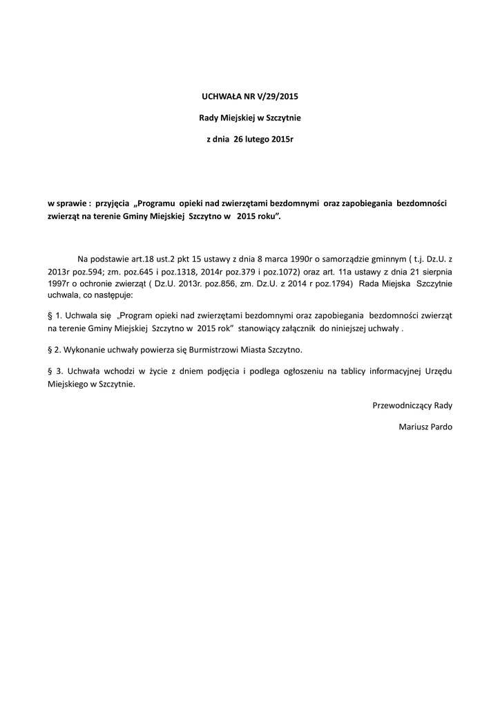 UCHWAŁA NR V/29/2015 Rady Miejskiej w Szczytnie z dnia 26 lutego 2015r w sprawie : przyjęcia „Programu opieki nad zwierzętami bezdomnymi oraz zapobiegania bezdomności zwierząt na terenie Gminy Miejskiej Szczytno w 2015 roku”. Na podstawie art.18 ust.2 pkt 15 ustawy z dnia 8 marca 1990r o samorządzie gminnym ( t.j. Dz.U. z 2013r poz.594; zm. poz.645 i poz.1318, 2014r poz.379 i poz.1072) oraz art. 11a ustawy z dnia 21 sierpnia 1997r o ochronie zwierząt ( Dz.U. 2013r. poz.856, zm. Dz.U. z 2014 r poz.1794) Rada Miejska Szczytnie uchwala, co następuje: § 1. Uchwala się „Program opieki nad zwierzętami bezdomnymi oraz zapobiegania bezdomności zwierząt na terenie Gminy Miejskiej Szczytno w 2015 rok” stanowiący załącznik do niniejszej uchwały . § 2. Wykonanie uchwały powierza się Burmistrzowi Miasta Szczytno. § 3. Uchwała wchodzi w życie z dniem podjęcia i podlega ogłoszeniu na tablicy informacyjnej Urzędu Miejskiego w Szczytnie. Przewodniczący Rady Mariusz Pardo Załącznik do Uchwały Nr V/29/2015 Rady Miejskiej w Szczytnie z dnia 26 lutego 2015r. Program opieki nad zwierzętami bezdomnymi oraz zapobiegania bezdomności zwierząt na terenie Gminy Miejskiej Szczytno w 2015 roku. Rozdział I. Postanowienia ogólne. § 1. 1.Program dotyczy zwierząt bezdomnych domowych , w szczególności psów, kotów i gospodarskich oraz wolno żyjących kotów przebywających w granicach administracyjnych miasta Szczytno . 2. Realizacja programu odbywa się zgodnie z przepisami Ustawy z dnia 21 sierpnia 1997r o ochronie zwierząt, w szczególności z zachowaniem zasad humanitaryzmu. 3. Cele Programu to: 1) zapewnienie bezdomnym zwierzętom miejsca w schronisku dla zwierząt, 2) opieka nad wolno żyjącymi kotami, w tym ich dokarmianie, 3) odławianie bezdomnych zwierząt, 4) obligatoryjna sterylizacja albo kastracja zwierząt w schronisku dla zwierząt, 5) poszukiwanie właścicieli dla bezdomnych zwierząt, 6) usypianie ślepych miotów, 7) wskazanie gospodarstwa rolnego w celu zapewnienia miejsca dla zwierząt gospodarskich, 8) zapewnienie całodobowej opieki weterynaryjnej w przypadkach zdarzeń drogowych z udziałem zwierząt, 9) stworzenie bazy danych właścicieli psów na terenie Gminy Miejskiej Szczytno oraz trwałe oznakowanie psów, 4. Funkcję koordynatora działań dotyczących opieki nad zwierzętami bezdomnymi oraz ograniczania bezdomności zwierząt pełni Wydział Gospodarki Miejskiej. 5. Realizację działań dotyczących opieki nad zwierzętami bezdomnymi oraz przeciwdziałania bezdomności zwierząt prowadzą: 1) Schronisko dla Zwierząt „Cztery Łapy” w Szczytnie, 2) organizacje pozarządowe , których statutowym celem jest ochrona zwierząt. Rozdział II. Realizacja zadań. § 2. Zwierzęta bezdomne tj. zwierzęta przebywające na terenie Gminy Miejskiej Szczytno, które uciekły, zabłąkały się lub zostały porzucone przez człowieka a nie ma możliwości ustalenia ich właściciela lub innej osoby, pod której opieką trwale dotąd pozostawały, po odłowieniu zostaną przewiezione i umieszczone w Schronisku dla Zwierząt „Cztery Łapy” w Szczytnie. § 3. Sprawowanie opieki nad kotami wolno żyjącymi realizowane będzie poprzez: 1. Współpracę ze służbami weterynaryjnymi w przypadkach istniejącej potrzeby podjęcia leczenia kotów wolno żyjących, 2. Współpracę z opiekunami kotów wolno żyjących, 3. Prowadzenie akcji dokarmiania wolno żyjących kotów szczególnie w okresach niekorzystnych warunków atmosferycznych w oparciu o współpracę z organizacjami pozarządowymi, których statutowym celem jest ochrona zwierząt. § 4. Odławianie bezdomnych zwierząt realizowane będzie w sposób następujący: 1. Podmiotem uprawnionym do przeprowadzania odławiania zwierząt w sposób stały, w odniesieniu do zgłoszeń dotyczących pozostawionych bez opieki zwierząt, w szczególności chorych lub powodujących zagrożenie bezpieczeństwa na terenie Gminy Miejskiej Szczytno - jest podmiot prowadzący Schronisko dla Zwierząt „Cztery Łapy” w Szczytnie, 2 . Termin okresowego odławiania bezdomnych zwierząt oraz granice terenu będą podane do publicznej wiadomości z 21-dniowym wyprzedzeniem i będzie przeprowadzane przez podmioty wskazane przez Burmistrza Miasta, 3. Akcja odławiania zwierząt powinna być przeprowadzona w sposób sprawny nie zagrażający bezpieczeństwu i porządkowi publicznemu, przy użyciu sprzętu nie mogącego stwarzać zagrożenia dla życia i zdrowia zwierząt ani zadawać im cierpienia. 4. Koszty odławiania bezdomnych zwierząt, umieszczania ich w schronisku, zapewnienia im w razie potrzeby pomocy lekarsko-weterynaryjnej oraz utrzymania zwierzęcia w schronisku pokrywane są z budżetu Gminy Miejskiej Szczytno, 5. W przypadku ustalenia właściciela zwierzęcia obowiązany jest on odebrać zwierzę ze schroniska w ciągu 14 dni od dnia otrzymania zawiadomienia, 6. Po upływie 14 dni prowadzący schronisko po uzgodnieniu z lekarzem weterynarii sprawującym opiekę w schronisku decyduje o dalszym losie zwierzęcia np. przekazaniu do adopcji. § 5. Schronisko dla Zwierząt „Cztery Łapy” w Szczytnie przed przekazaniem do adopcji zwierząt , obligatoryjnie przeprowadzać będzie zabiegi sterylizacji i kastracji zwierząt bezdomnych przyjętych do Schroniska, z wyjątkiem tych u których istnieją przeciwwskazania do wykonywania tych zabiegów. § 6. Poszukiwanie nowych właścicieli dla bezdomnych zwierząt będzie realizowane przez: 1.Schronisko dla Zwierząt „Cztery Łapy” poprzez publikujące informacji o zwierzętach oczekujących na adopcję na stronie internetowej Schroniska , 2. Gminę Miejską Szczytno poprzez promocję zwierząt ze schroniska oraz umieszczanie ogłoszeń o adopcji zwierząt na tablicach informacyjnych, 3.Organizacje pozarządowe poprzez prowadzenie akcji adopcyjnych i promocyjnych. § 7. Usypianie ślepych miotów zwierząt realizują: 1. Schronisko dla Zwierząt „Cztery 