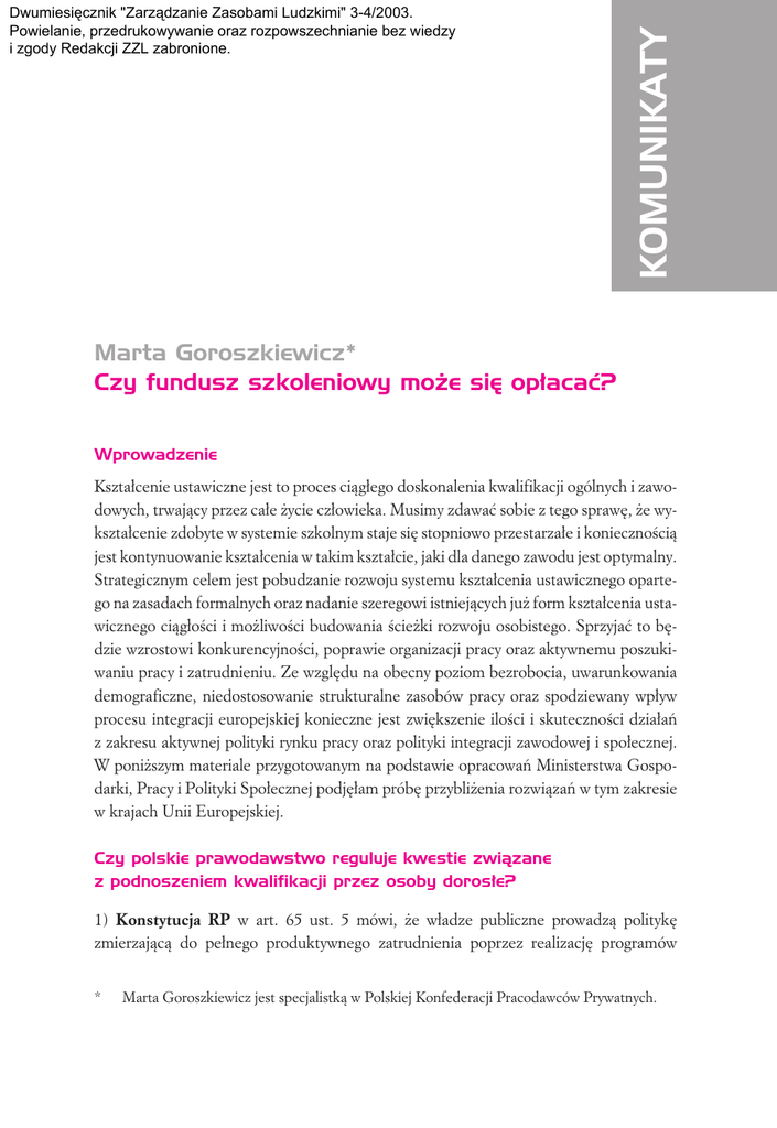 KOMUNIKATY Dwumiesięcznik "Zarządzanie Zasobami Ludzkimi" 3-4/2003. Powielanie, przedrukowywanie oraz rozpowszechnianie bez wiedzy i zgody Redakcji ZZL zabronione. Marta Goroszkiewicz* Czy fundusz szkoleniowy mo¿e siê op³acaæ? Wprowadzenie Kszta³cenie ustawiczne jest to proces ci¹g³ego doskonalenia kwalifikacji ogólnych i zawoKomunikaty dowych, trwaj¹cy przez ca³e ¿ycie cz³owieka. Musimy zdawaæ sobie z tego sprawê, ¿e wykszta³cenie zdobyte w systemie szkolnym staje siê stopniowo przestarza³e i koniecznoci¹ jest kontynuowanie kszta³cenia w takim kszta³cie, jaki dla danego zawodu jest optymalny. Strategicznym celem jest pobudzanie rozwoju systemu kszta³cenia ustawicznego opartego na zasadach formalnych oraz nadanie szeregowi istniej¹cych ju¿ form kszta³cenia ustawicznego ci¹g³oci i mo¿liwoci budowania cie¿ki rozwoju osobistego. Sprzyjaæ to bêdzie wzrostowi konkurencyjnoci, poprawie organizacji pracy oraz aktywnemu poszukiwaniu pracy i zatrudnieniu. Ze wzglêdu na obecny poziom bezrobocia, uwarunkowania demograficzne, niedostosowanie strukturalne zasobów pracy oraz spodziewany wp³yw procesu integracji europejskiej konieczne jest zwiêkszenie iloci i skutecznoci dzia³añ z zakresu aktywnej polityki rynku pracy oraz polityki integracji zawodowej i spo³ecznej. W poni¿szym materiale przygotowanym na podstawie opracowañ Ministerstwa Gospodarki, Pracy i Polityki Spo³ecznej podjê³am próbê przybli¿enia rozwi¹zañ w tym zakresie w krajach Unii Europejskiej. Czy polskie prawodawstwo reguluje kwestie zwi¹zane z podnoszeniem kwalifikacji przez osoby doros³e? 1) Konstytucja RP w art. 65 ust. 5 mówi, ¿e w³adze publiczne prowadz¹ politykê zmierzaj¹c¹ do pe³nego produktywnego zatrudnienia poprzez realizacjê programów * Marta Goroszkiewicz jest specjalistk¹ w Polskiej Konfederacji Pracodawców Prywatnych. 94 Komunikaty zwalczania bezrobocia, w tym organizowania i wspieranie poradnictwa i szkolenia zawodowego. 2) Kodeks pracy w art. 17 podaje: Pracodawca jest obowi¹zany u³atwiaæ pracownikom podnoszenie kwalifikacji zawodowych oraz w art. 102: Kwalifikacje zawodowe pracowników wymagane do wykonywania pracy okrelonego rodzaju lub na okrelonym stanowisku mog¹ byæ ustalane w przepisach prawa pracy przewidzianych w art. 771773, w zakresie nie uregulowanym w przepisach szczególnych. Art. 103: W zakresie i na warunkach ustalonych, w myl rozporz¹dzenia Ministra Edukacji Narodowej oraz Ministra Pracy i Polityki Socjalnej, pracodawca u³atwia pracownikom podnoszenie kwalifikacji zawodowych. 3) Powy¿sze znajduje swoje rozwiniêcie w zapisach rozporz¹dzenia Ministra Edukacji Narodowej oraz Ministra Pracy i Polityki Socjalnej z 12 padziernika 1993 r. w sprawie zasad i warunków podnoszenia kwalifikacji zawodowych i wykszta³cenia ogólnego doros³ych (Dz.U. z 1993 r. Nr 103, poz. 472). 4) Ustawa o systemie owiaty w art. 68 ust. 1: Kszta³cenie ustawiczne umo¿liwia rozwój osobowoci oraz zdobywanie wiedzy, kszta³towanie umiejêtnoci i rozwój uzdolnieñ, w szczególnoci z uwzglêdnieniem wymogów rynku pracy. ust. 2 System kszta³cenia ustawicznego obejmuje kszta³cenie, dokszta³canie i doskonalenie w formach szkolnych i pozaszkolnych. 5) Narodowy Plan Rozwoju (NPR) na lata 2004-2006: Sektorowy Program Operacyjny Rozwój zasobów ludzkich realizacja celu NPR wymaga koncentracji uwagi polityki spo³eczno-gospodarczej na rynku pracy oraz systemie edukacji i kszta³cenia ustawicznego stanowi¹cych podstawê kompleksowego rozwoju zasobów ludzkich. Dzia³ania w tym zakresie powinny doprowadziæ do zwiêkszenia konkurencyjnoci zasobów ludzkich, a tym samym zwiêkszenia szans na znalezienie zatrudnienia na europejskim rynku pracy. Wymaga to wyranej poprawy jakoci funkcjonowania systemu rynku pracy i edukacji oraz zwiêkszenia rodków finansowych przeznaczonych dla objêtych pomoc¹ osób w zakresie: g wzrostu poziomu wykszta³cenia i kwalifikacji zawodowych przez m³odzie¿ i doros³ych g podwy¿szania efektywnoci i jakoci dzia³ania systemu edukacji i kszta³cenia ustawicznego g podwy¿szania skutecznoci funkcjonowania instytucji i instrumentów rynku pracy g wspomagania tworzenia nowych przedsiêbiorstw i adaptacji kadr istniej¹cych do funkcjonowania na jednolitym rynku europejskim, w tym w szczególnoci tych, które Komunikaty 95 wykazuj¹ najwiêkszy potencja³ rozwojowy tak¿e w zakresie tworzenia nowych miejsc pracy. Wdra¿anie osi Rozwój zasobów ludzkich i zatrudnienia Narodowego Planu Rozwoju na lata 20042006, odbywaæ siê bêdzie poprzez: g kontynuacjê programów finansowanych ze rodków krajowych, które wynikaj¹ z realizacji Narodowej Strategii Zatrudnienia i Rozwoju Zasobów Ludzkich 20002006 oraz strategii spo³eczno-gospodarczego rz¹du Przedsiêbiorczoæ Rozwój Praca; realizacji programu Kapita³ dla przedsiêbiorczych (patrz poni¿ej) g realizacjê programów wspó³finansowanych przez Europejski Fundusz Spo³eczny: c SPO Rozwój zasobów ludzkich c Inicjatywy Wspólnotowej EQUAL dotycz¹cej nowych sposobów zwalczania dyskryminacji i nierównoci na rynku pracy, zarówno wobec osób zatrudnionych, jak i poszukuj¹cych pracy, jak równie¿ wspierania osób ubiegaj¹cych siê o status uchodcy c wdro¿enie programów wspó³finansowanych z zasobów programu przedakcesyjnego Phare, którego realizacja zakoñczy siê w roku 2006. W ramach Inicjatywy Wspólnotowej EQUAL zostanie przygotowany jeden dokument programowy Jednolity Dokument Programuj¹cy dla EQUAL oraz Uzupe³nienie Programu. Programem Operacyjnym Inicjatywy zarz¹dza Ministerstwo Gospodarki, Pracy i Polityki Spo³ecznej, któremu przyporz¹dkowana jest koordynacja Europejskiego Funduszu Spo³ecznego. Komplementarnie dzia³ania w zakresie rozwoju zasobów ludzkich dostosowane do sytuacji na regionalnych rynkach pracy bêd¹ podejmowane w ramach Zintegrowanego Programu Operacyjnego Rozwoju Regionalnego. g g g 6) Program gospodarczy Przedsiêbiorczoæ Rozwój Praca Przyjêty prze