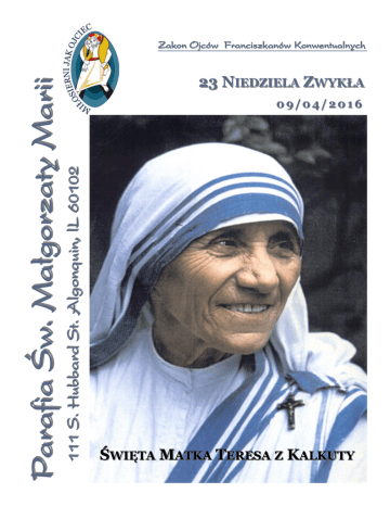 23 NIEDZIELA ZWYKŁA 09/04/2016 111 S. Hubbard St. Algonquin, lL 60102 Parafia Św. Małgorzaty Marii Zakon Ojców Franciszkanów Konwentualnych ŚWIĘTA MATKA TERESA Z KALKUTY OD PROBOSZCZA Drodzy Przyjaciele! W dzisiejszej Ewangelii Jezus przypomina nam, że jednym z podstawowych warunków pójścia za Nim jest niesienie swego krzyża : „Kto nie nosi swego krzyża, a idzie za mną, ten nie może być moim uczniem”. Ogólnie kiedy mówimy o krzyżu to zaraz naturalnie kojarzy się on nam z czymś negatywnym i raczej z czymś czego najlepiej uniknąć albo w ogóle w swoim życiu nie spotkać. Dlatego od czasu do czasu potrzebujemy tego ewangelicznego spojrzenia na nasze krzyże, aby zrozumieć że one przybliżają nas do Chrystusa i że Chrystus razem z nami niesie nasze krzyże. Słowa Ewangelii wg św. Łukasza 14, 25-33 Wielkie tłumy szły z Jezusem. On odwrócił się i rzekł do nich: «Jeśli ktoś przychodzi do Mnie, a nie ma w nienawiści swego ojca i matki, żony i dzieci, braci i sióstr, nadto i siebie samego, nie może być moim uczniem. Kto nie dźwiga swego krzyża, a idzie za Mną, ten nie może być Pewien kapłan otrzymał list od kobiety, która pisze o swoim moim uczniem. ciężkim krzyżu, który stał się cennym skarbem w jej życiu. Bo któż z was, chcąc zbudować wieżę, nie „Miałam syna, który urodził się głuchoniemy i lekarze od usiądzie wpierw i nie oblicza wydatków, czy razu chcieli go zamknąć w zakładzie dla upośledzonych. Ale ma na wykończenie? Inaczej, gdyby położył mój syn pracował bardzo ciężko z osobami, które pomagały fundament, a nie zdołałby wykończyć, wszyscy, mu żyć w normalnym świecie. Dzięki temu dało się zauważać patrząc na to, zaczęliby drwić z niego: duże postępy w jego rehabilitacji od etapu, gdzie nie „Ten człowiek zaczął budować, a nie zdołał rozróżniał żywej rzeczy od kamienia do momentu w którym wykończyć”. zaczął się bawić z naszym małym psem. Nauczył się języka migowego w takim stopniu, że potrafił wyrazić swoje uczucia Albo jaki król, mając wyruszyć, aby stoczyć i pragnienia. Za każdym razem kiedy eksperci myśleli że to bitwę z drugim królem, nie usiądzie wpierw już szczyt jego możliwości, on znów zaskakiwał ich nowymi i nie rozważy, czy w dziesięć tysięcy ludzi może osiągnięciami. Dwa lata przed śmiercią jego częste napady stawić czoło temu, który z dwudziestu złości ustąpiły nagle całkowicie i każdy terapeuta tysiącami nadciąga przeciw niemu? Jeśli nie, z przyjemnością z nim pracował. Nikt nie mógł zrozumieć jak wyprawia poselstwo, gdy tamten jest jeszcze to się stało, ale mój syn był bardzo szczęśliwy i swoim daleko, i prosi o warunki pokoju. szczęściem dzielił się z innymi. Na rok przed śmiercią mój Tak więc nikt z was, jeśli nie wyrzeka się syn zachorował na raka złośliwego i żadne leczenie nie mogło wszystkiego, co posiada, nie może być moim tego zatrzymać. Zmarł w wieku 33 lat szczęśliwy uczniem». i akceptujący swoją chorobę. Przed śmiercią w migowym języku powiedział pielęgniarkom: dziękuję a do mnie: kocham cię. Wiem że obietnice Jezusa są prawdziwe i że mój syn jest w Bożym Królestwie. Często dano mi odczuć że z materialistycznego punktu widzenia mój syn był ciężarem dla społeczeństwa ale ja wiem , że społeczeństwo staje się bogatsze dzięki obecności takich ludzi jak on. Mój syn pokazał mi jak bardzo Bóg go kocha i każdego z nas, nawet wtedy, kiedy wydaje się nam, że tak nie jest. Przez mojego syna Bóg pokazał mi co tak naprawdę jest ważne: nie władza, sława, bogactwo czy przyjemność, nie te rzeczy, ale miłość. Jeśli Bóg jest wymagający od nas i posyła nam krzyże, to dlatego że chce nas nauczyć co jest w życiu najważniejsze.” Dzisiaj w Rzymie została kanonizowana Matka Teresa z Kalkuty, misjonarka miłości. Wielu z nas było w jej szkole poprzez obserwowanie jej uczynków i słuchanie jej słów, które mówiły o krzyżu i miłości z niego płynącej. Matka Teresa była uczniem Jezusa bo sama niosła swój krzyż i pomagała również nieść go innym poprzez świadczenie uczynków miłosierdzia co do ciała i co do duszy. Niech ta kanonizacja da nam siłę i sens niesienia naszych krzyży i pomagania innym, abyśmy byli prawdziwymi uczniami Jezusa. Pokój i Dobro Fr. Piotr Sarnicki, OFM, Conv. CZYTANIE Z KSIĘGI MĄDROŚCI MDR 9, 13-18 Któż z ludzi rozezna zamysł Boży albo któż pojmie wolę Pana? Nieśmiałe są myśli śmiertelników i przewidywania nasze zawodne, bo śmiertelne ciało przygniata duszę i ziemski namiot obciąża rozum pełen myśli. Mozolnie odkrywamy rzeczy tej ziemi, z trudem znajdujemy, co mamy pod ręką – a któż wyśledzi to, co jest na niebie? Któż poznał Twój zamysł, gdy nie dałeś Mądrości, nie zesłałeś z wysoka Świętego Ducha swego? I tak ścieżki mieszkańców ziemi stały się proste, a ludzie poznali, co Tobie miłe, i zostali ocaleni przez Mądrość. CZYTANIE Z LISTU ŚWIĘTEGO PAWŁA APOSTOŁA DO FILEMONA FLM 9B-10. 12-17 Najdroższy: Ja, stary Paweł, a teraz jeszcze więzień Chrystusa Jezusa – proszę cię za moim dzieckiem, za tym, którego zrodziłem w kajdanach, za Onezymem. Jego ci odsyłam; ty zaś jego, to jest serce moje, przyjmij do domu. Zamierzałem go trzymać przy sobie, aby zamiast ciebie oddawał mi usługi w kajdanach, które noszę dla Ewangelii. Jednakże postanowiłem nie czynić niczego bez twojej zgody, aby dobry twój czyn był nie jakby z musu, ale z dobrej woli. Może bowiem po to oddalił się od ciebie na krótki czas, abyś go odebrał na zawsze, już nie jako niewolnika, lecz więcej niż niewolnika, jako brata umiłowanego. Takim jest on zwłaszcza dla mnie, ileż więcej dla ciebie zarówno w doczesności, jak i w Panu. Jeśli więc się poczuwasz do łączności ze mną, przyjmij go jak mnie. BÓG ZAPŁAĆ Za nami kolejny Sum